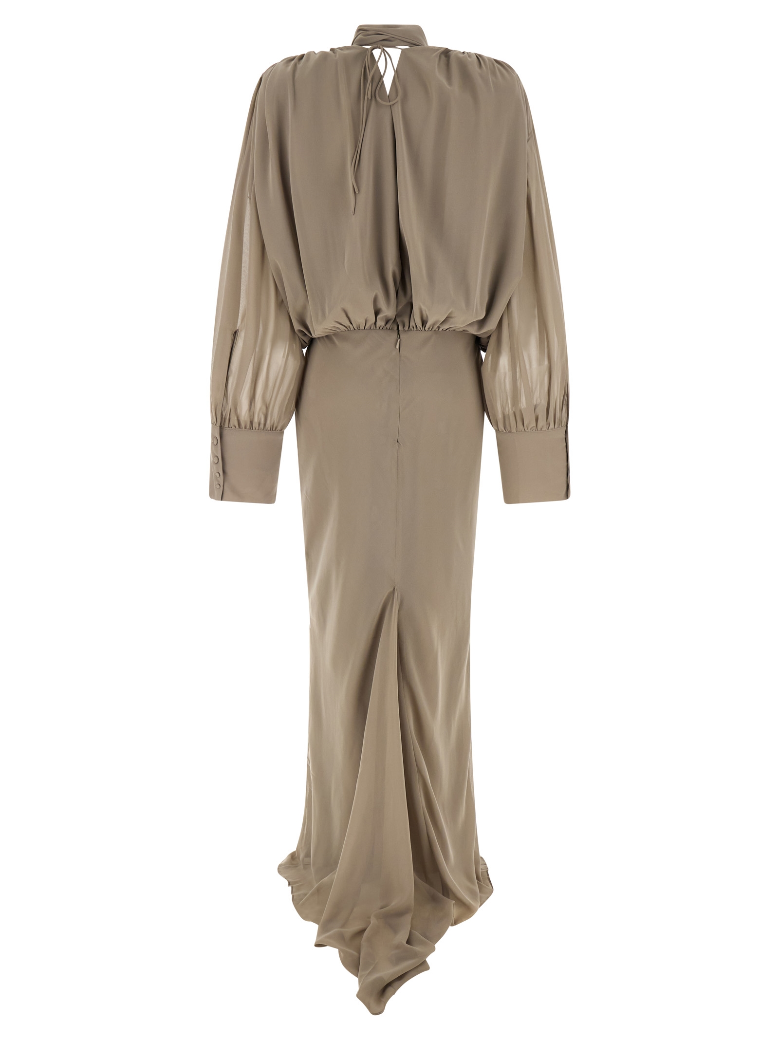Long ‘Chiffon Maxi’ dress in semi-transparent crepe de chine with deep V-neck, slightly draped upper, wallet style, long and straight skirt, long and wide sleeves with wide cuffs on the hem.