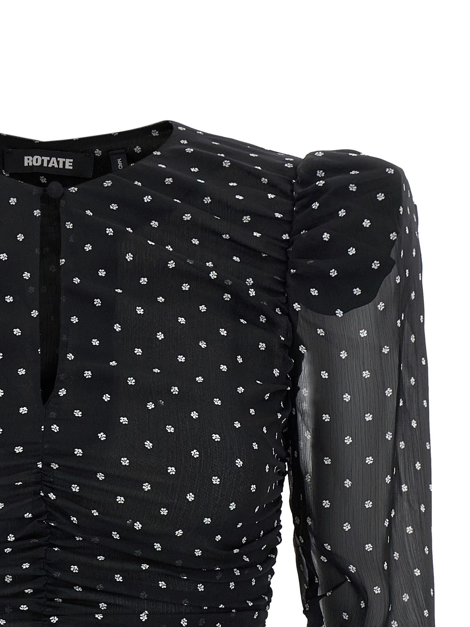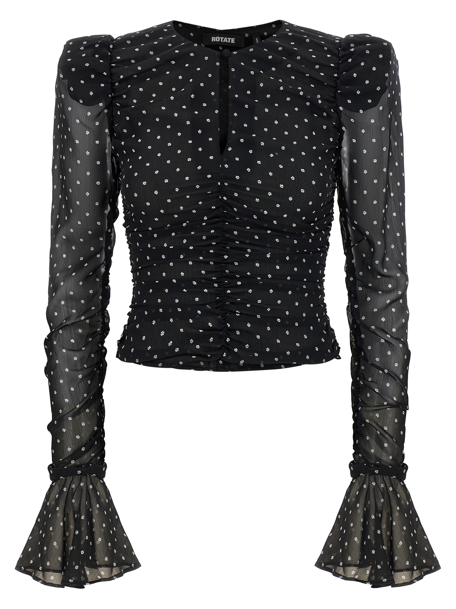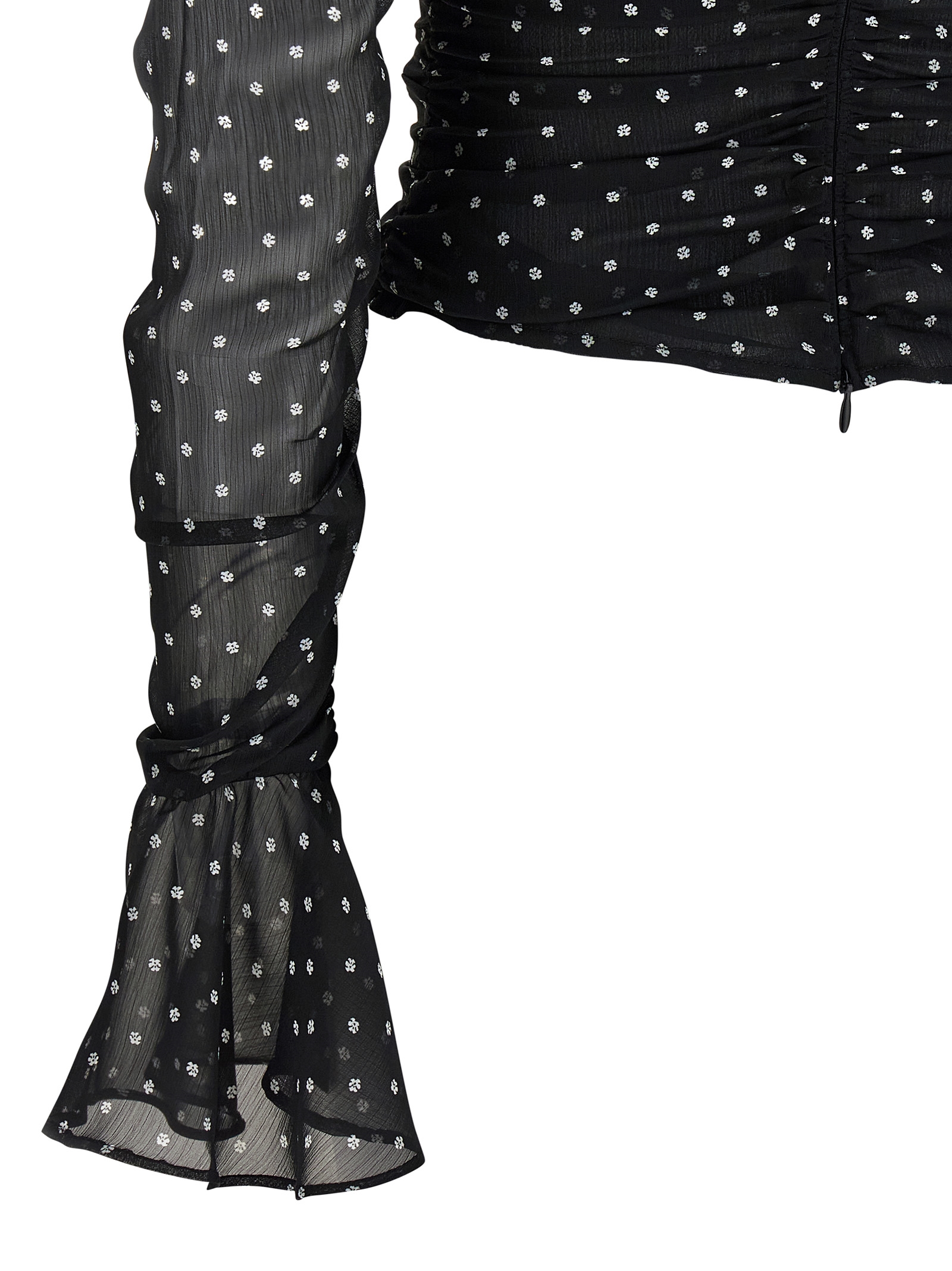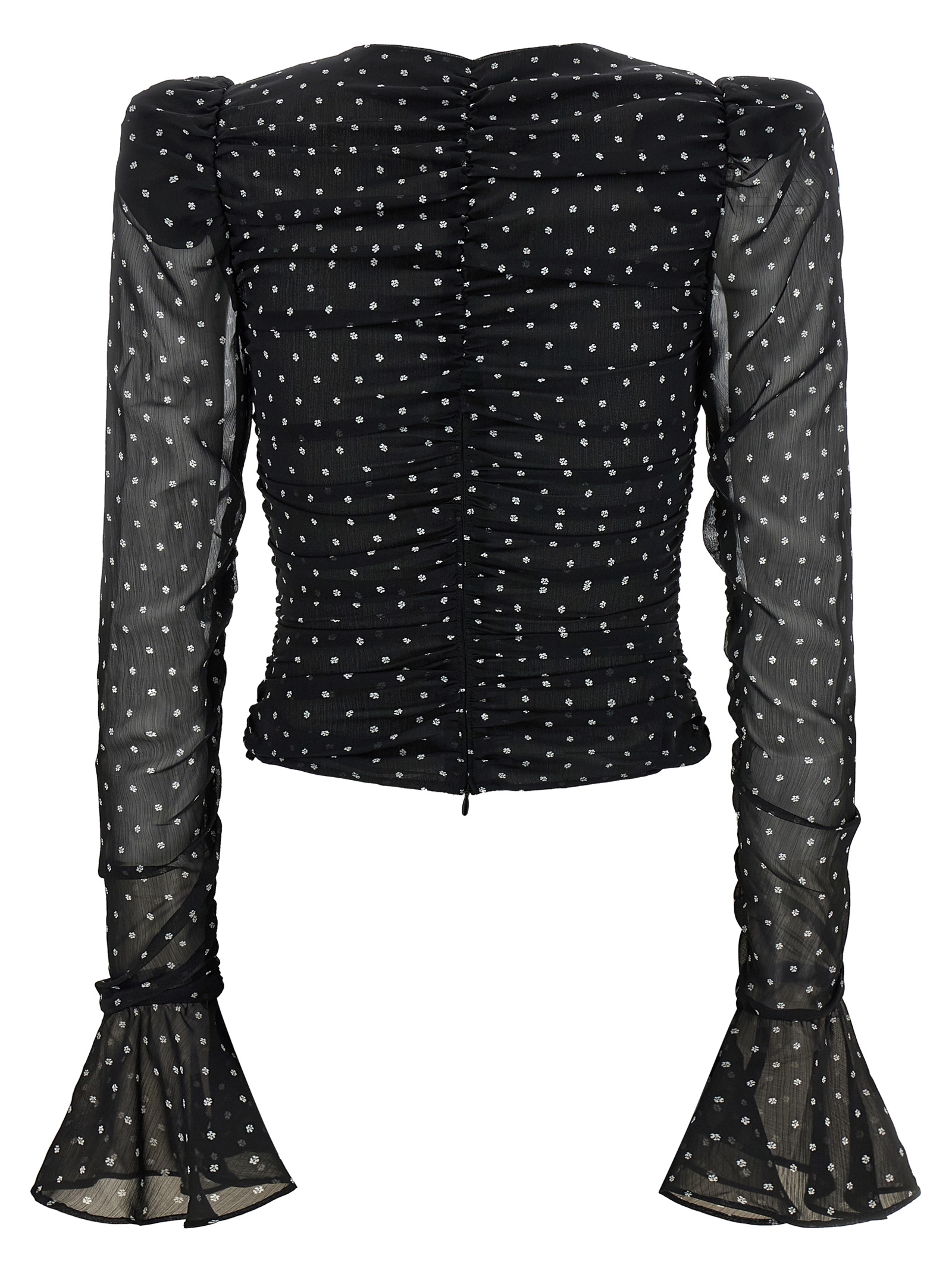 ‘Chiffon Ruched’ blouse in semi-transparent silk-effect fabric with floral microprint, crew neck, front and back curl, back zip, long sleeves with flounces on the cuffs.