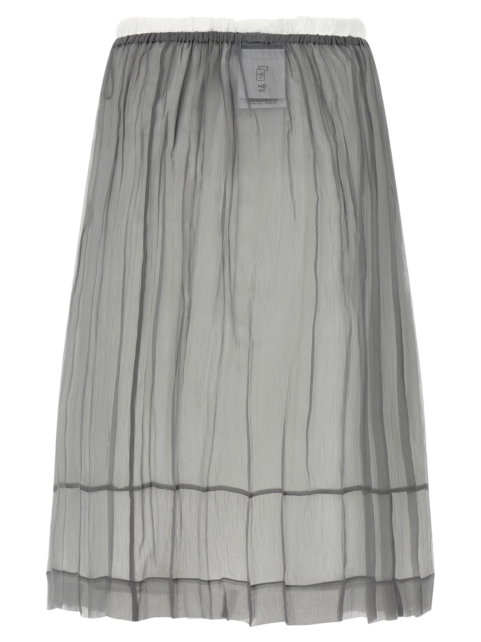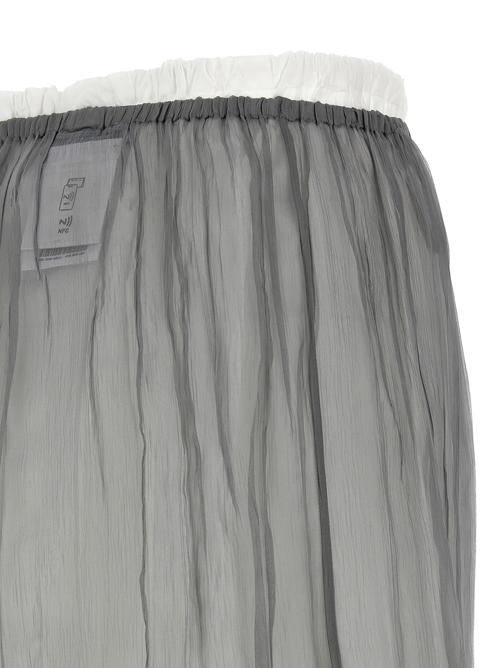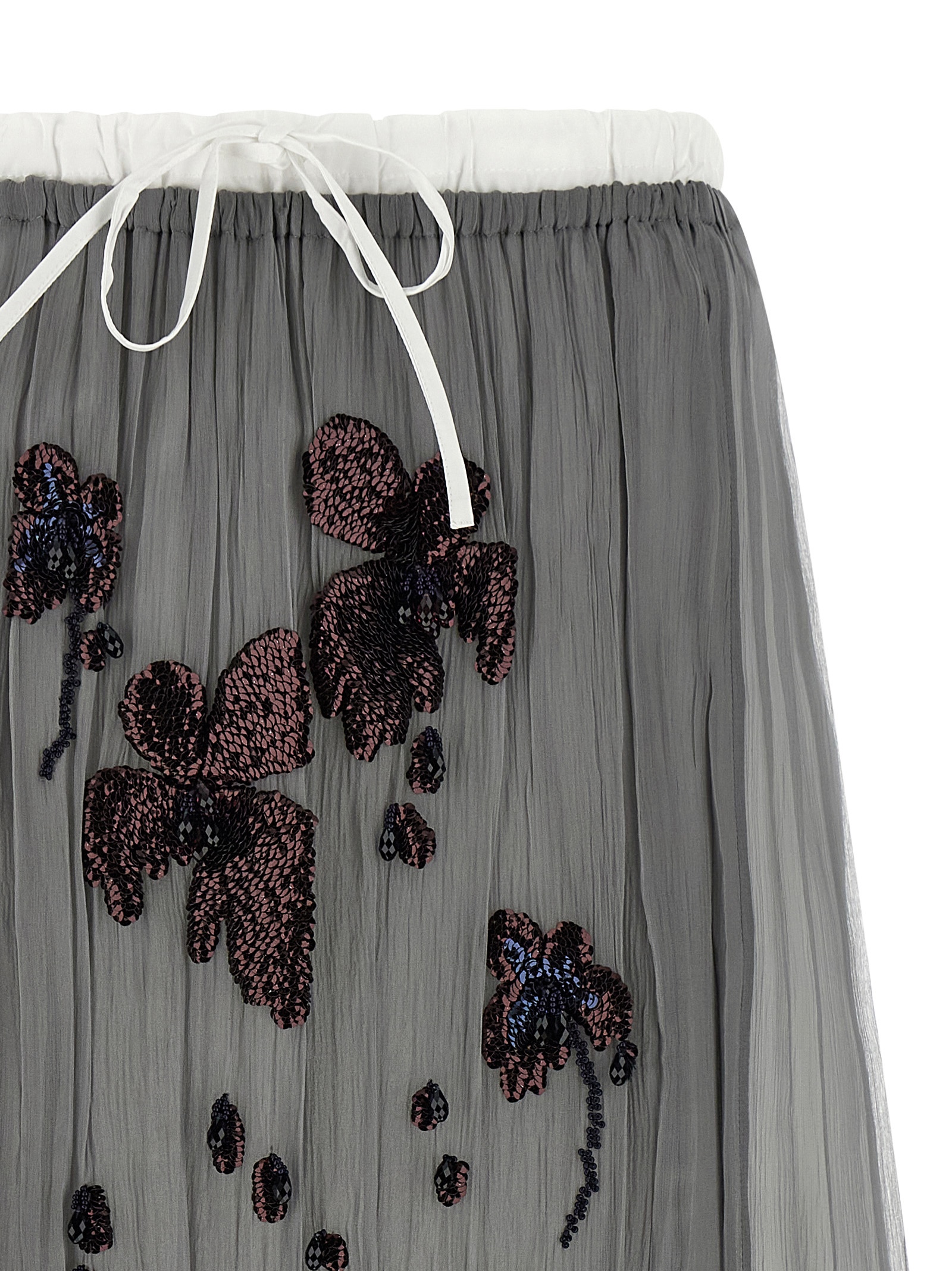 Midi skirt in semi-transparent silk chiffon with floral embroidery of sequins and front crystals, sheath silhouette, elastic waistband, contrast cotton poplin underskirt larger than the skirt, drawstring at the waist.