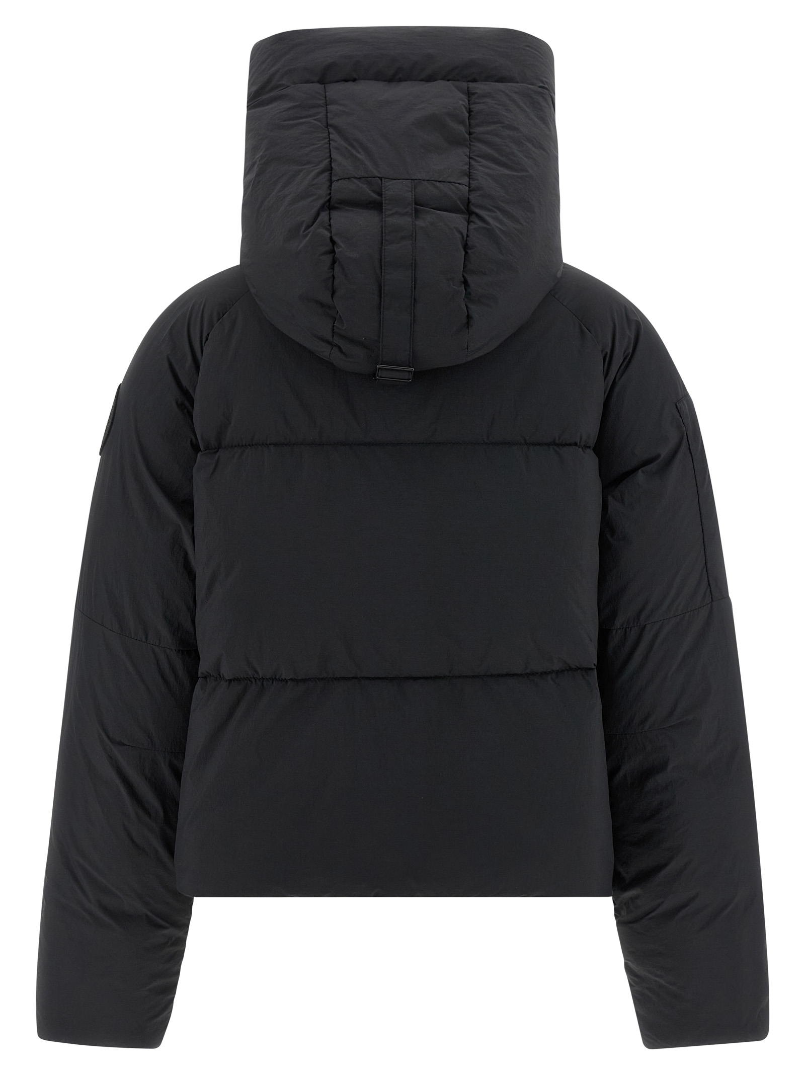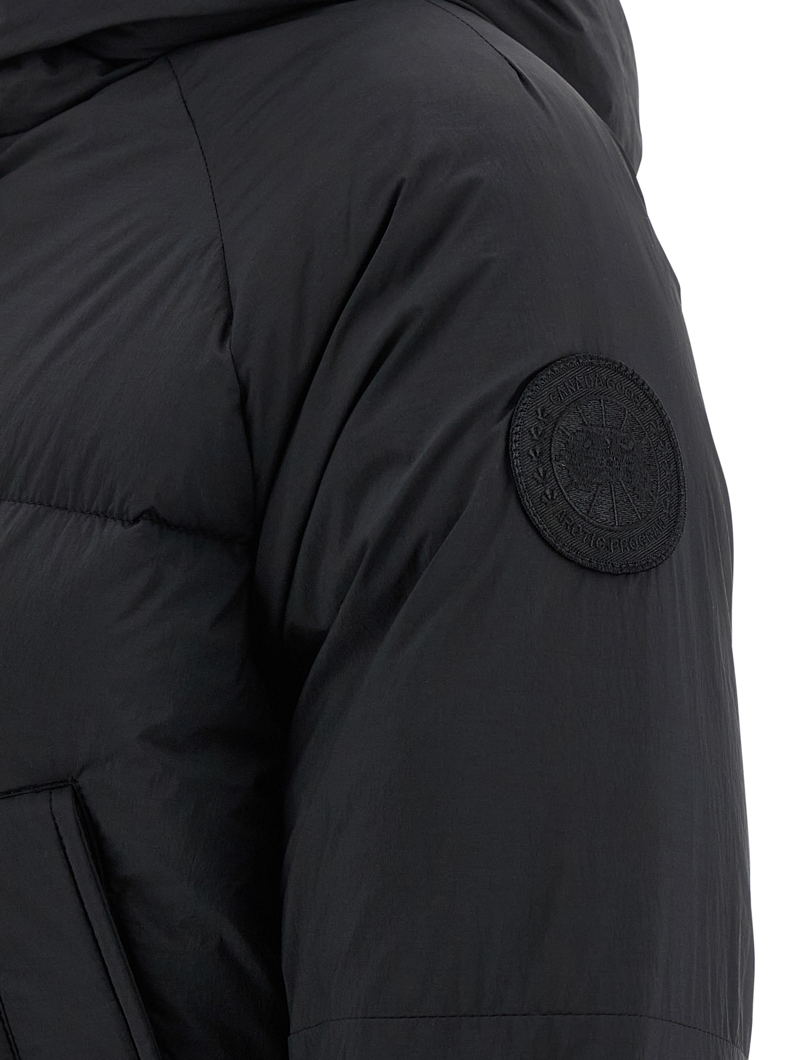 Water-repellent EnduraLuxe ‘Chilliwack’ bomber jacket with quilted matte finish and goose down padding, slightly cropped snorkel hood, front zip closure, high neck, pockets, long sleeves with windproof cuffs and tone-on-tone logo patch appliqué, drawstring at the hem.