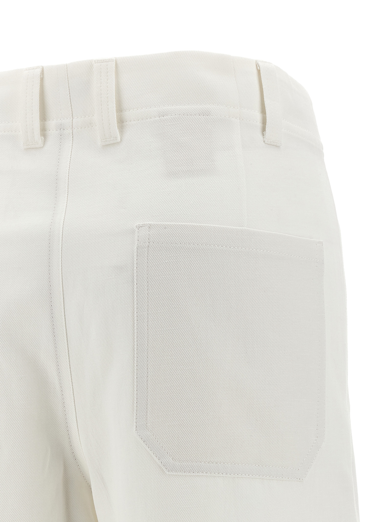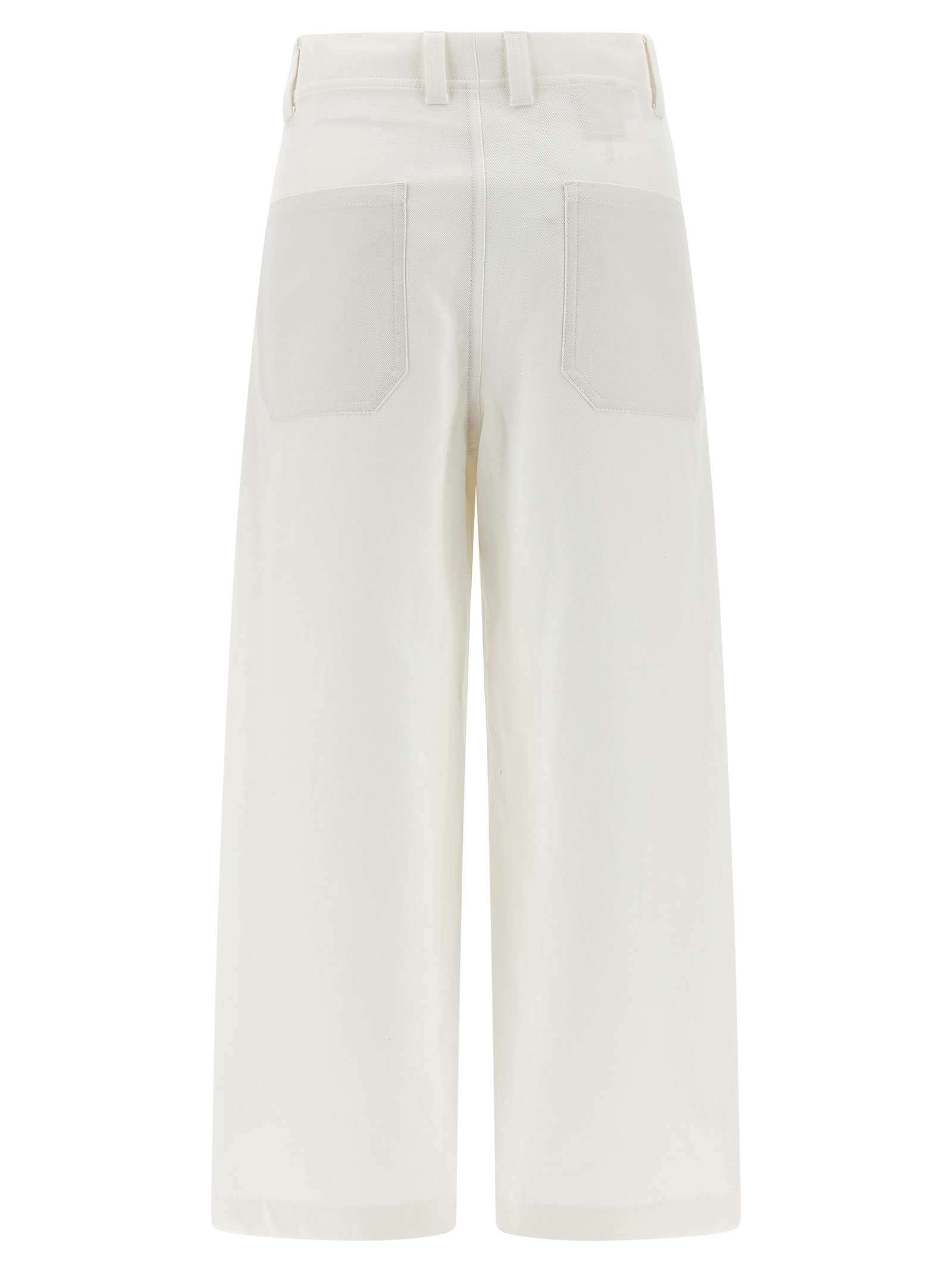 ‘Chino Crop’ cotton and linen gabardine trousers, wide and straight leg, zip closure with button and front counterbutton, front slanted pockets, back patch pockets, simple hem.