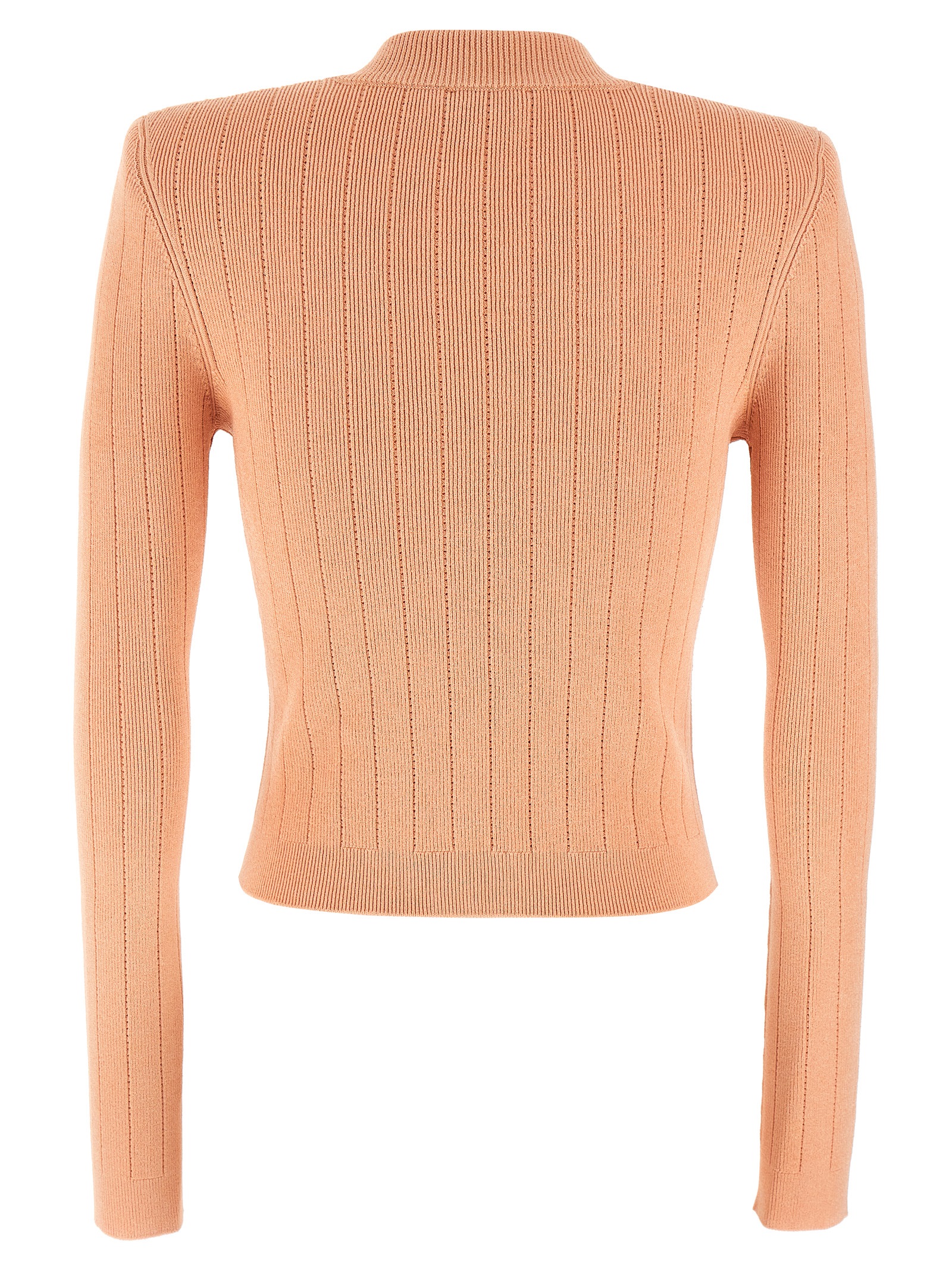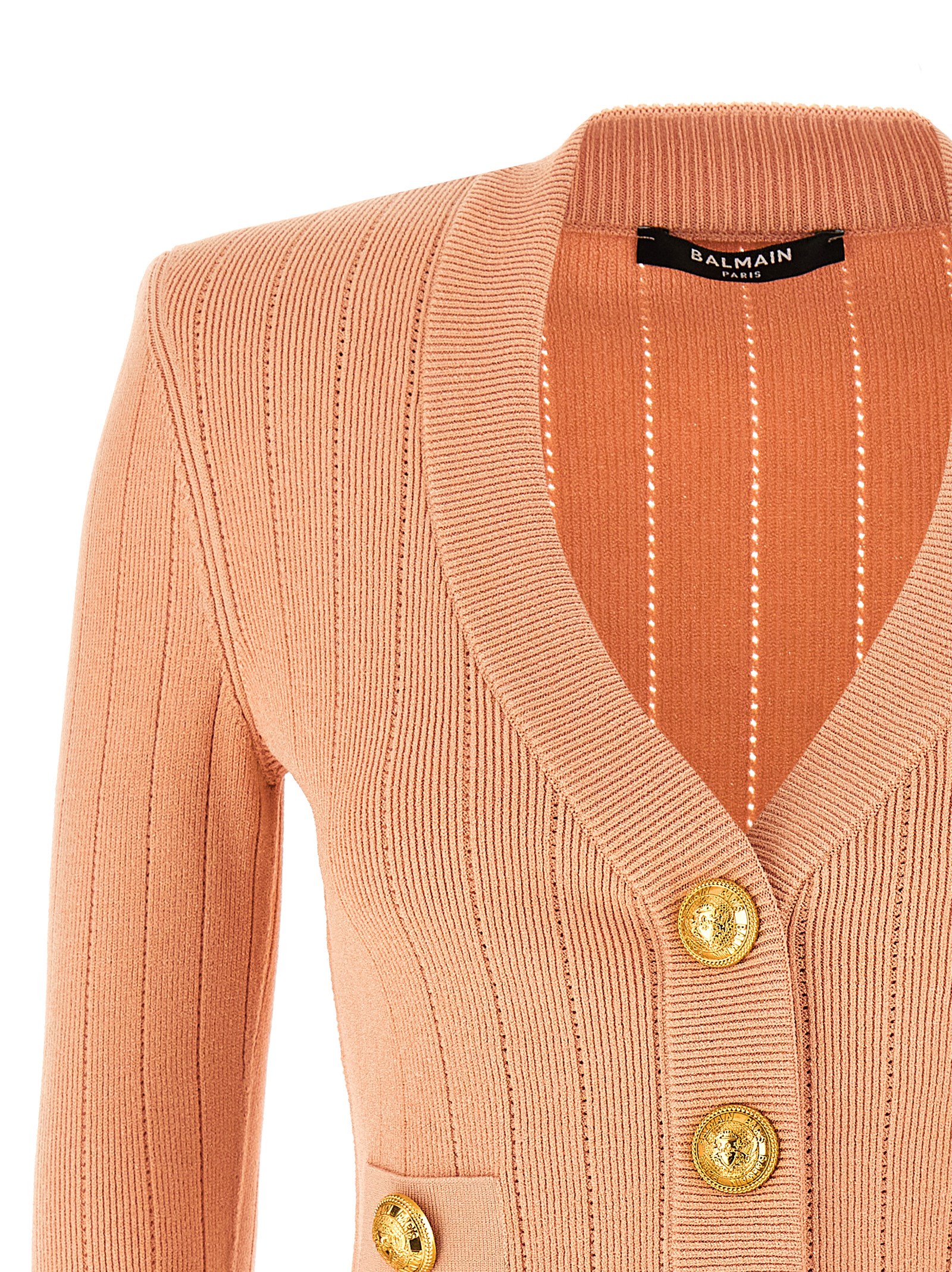 Knitted cardigan in viscose blend, gold metal ‘Chiocciola’ button closure, crop style with padded shoulders, long sleeves.