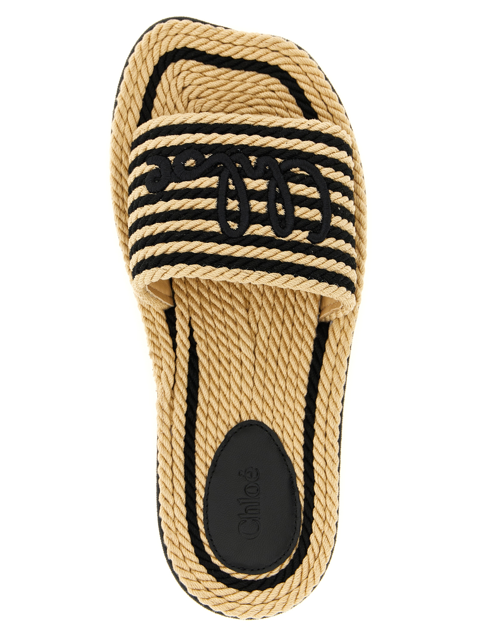 ‘Chloé Sand’ hand-woven two-tone rope sabots, front band with hand-embroidered lettering logo and leather lining, wavy EVA sole.