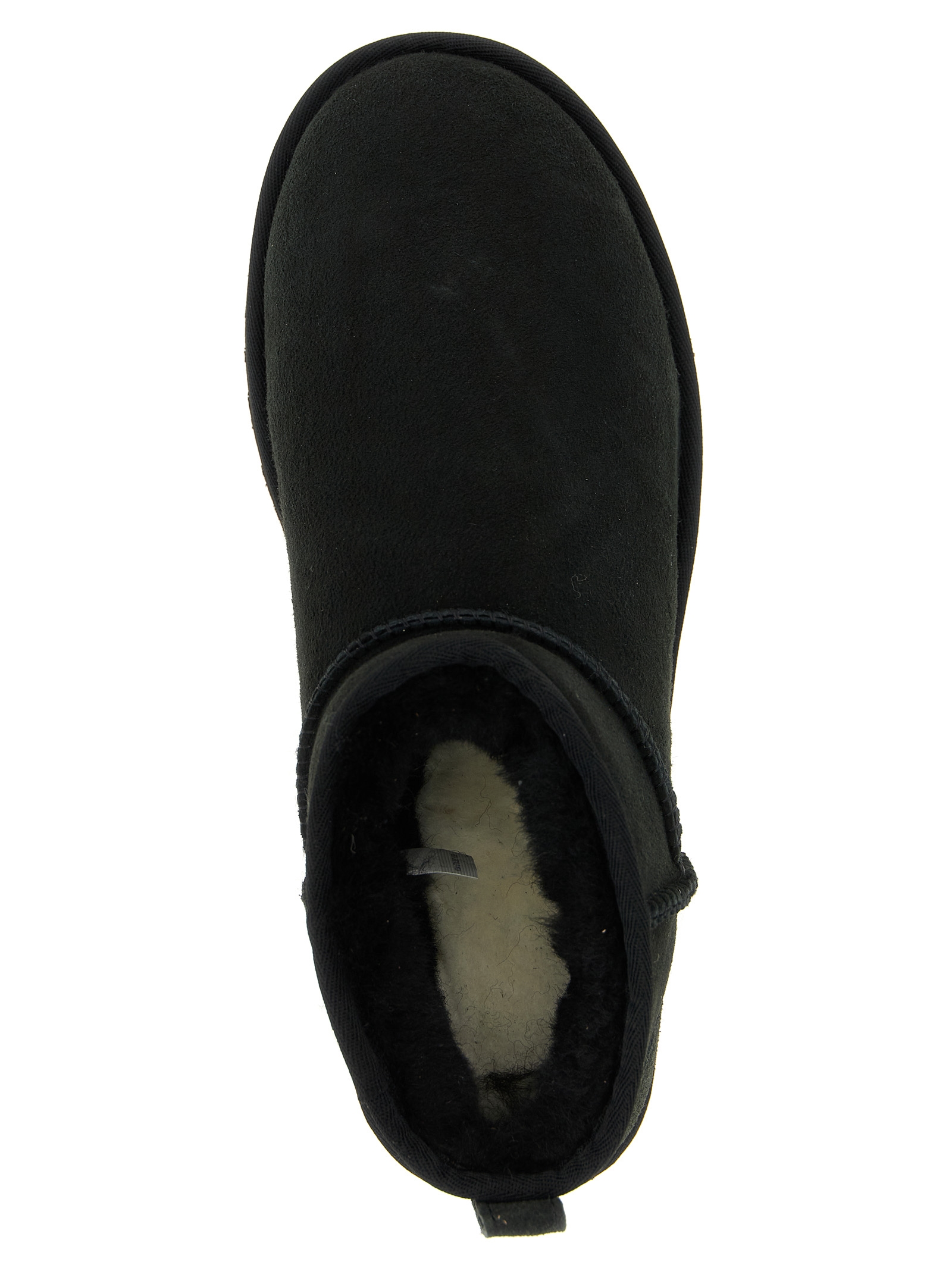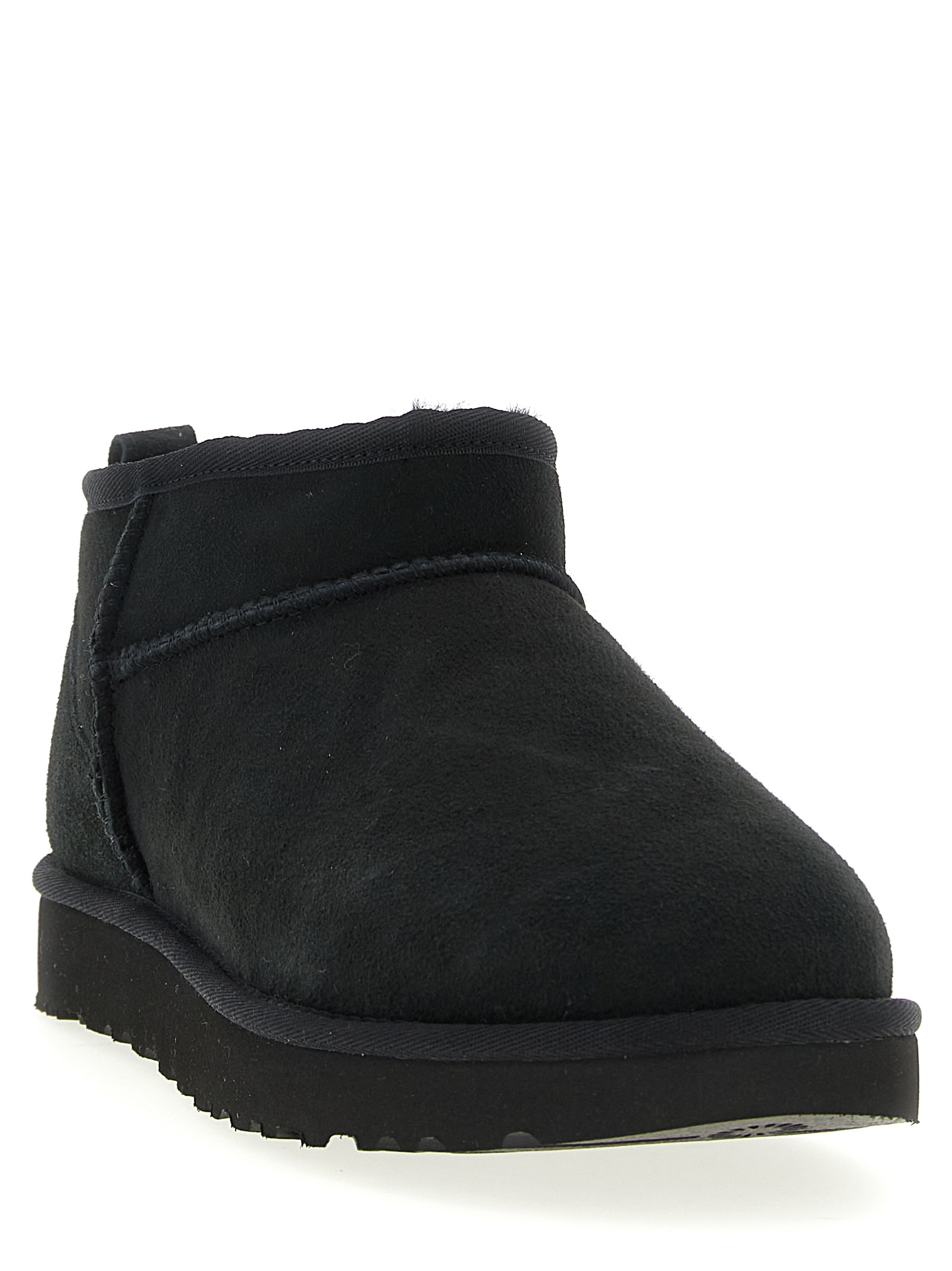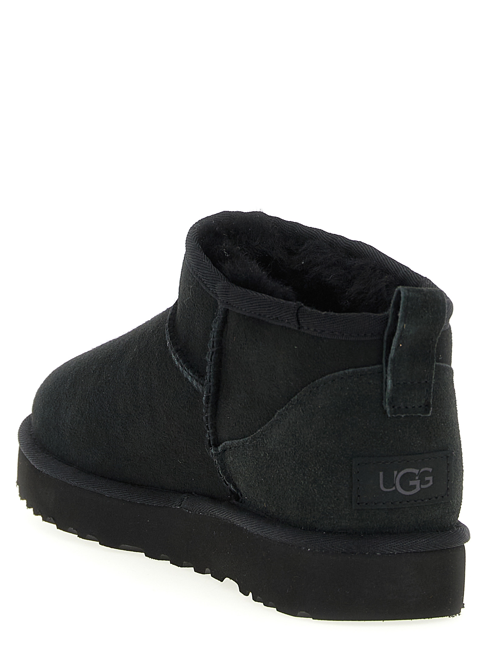‘Classic Ultra Mini’ water-repellent suede ankle boots with asymmetrical top trim, overlock stitching, tone-on-tone logo patch at the back, upside-down sheepskin lining and insole, sole in EVA from sugar cane or EVA Treadlite by UGG™.