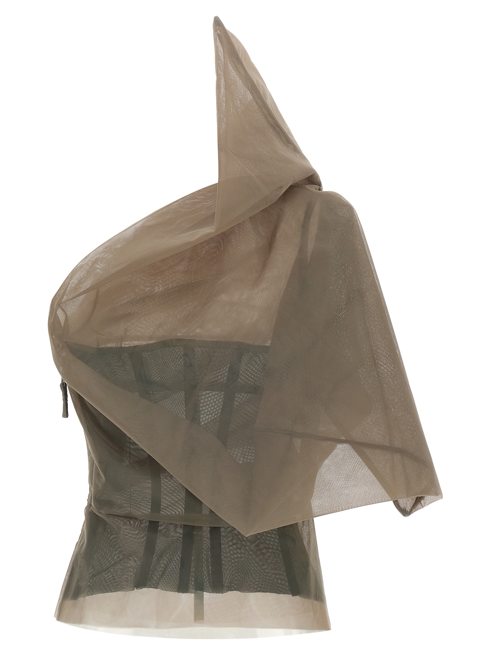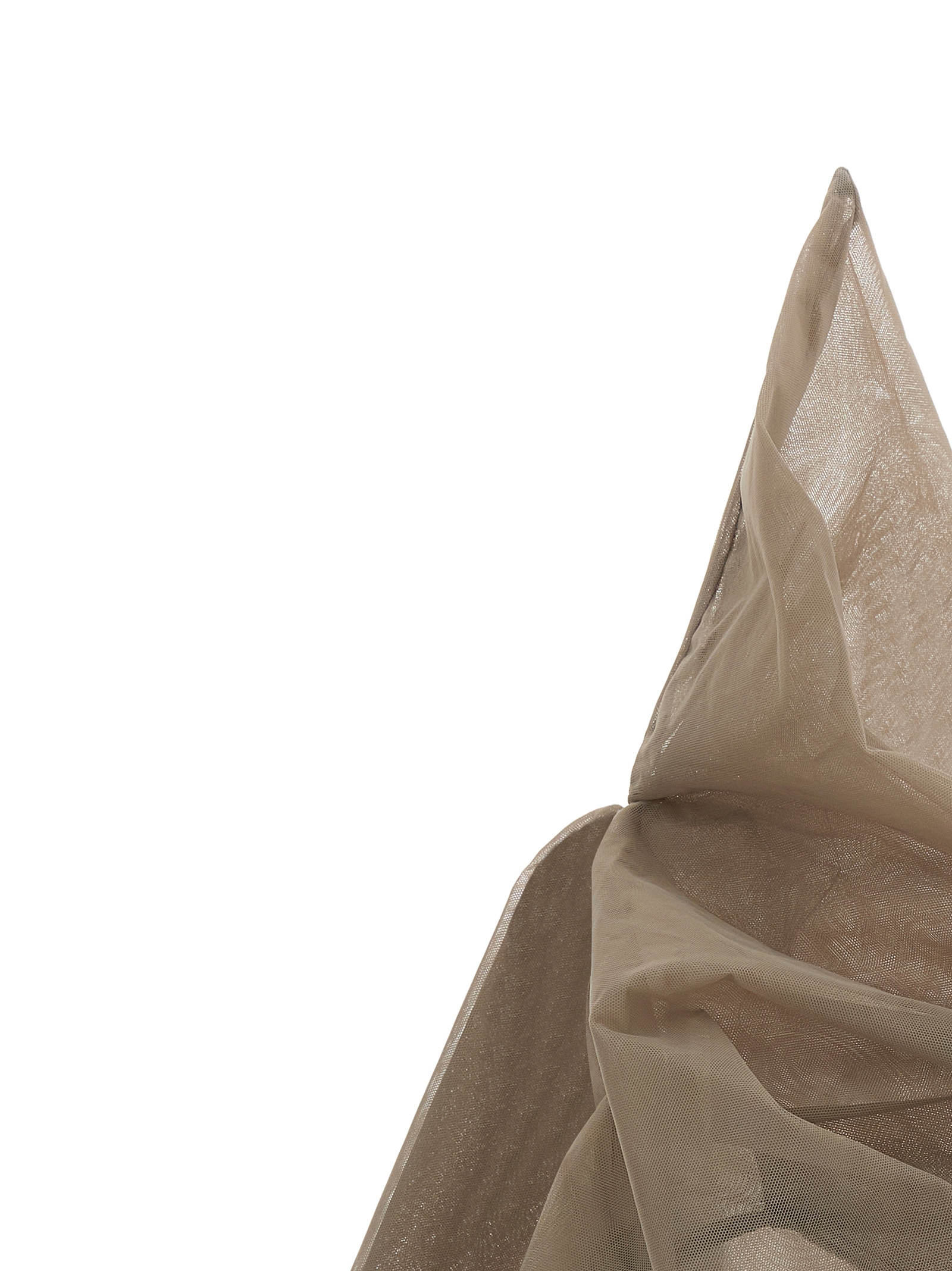 ‘Claudia’ semi-transparent lightweight nylon tulle top with rigid texture to the touch, one-shoulder model with structured design and asymmetrical voluminous shoulder on the right, diagonally draped bodice with side curls, side zip closure, asymmetrical hem with raw cut hem.