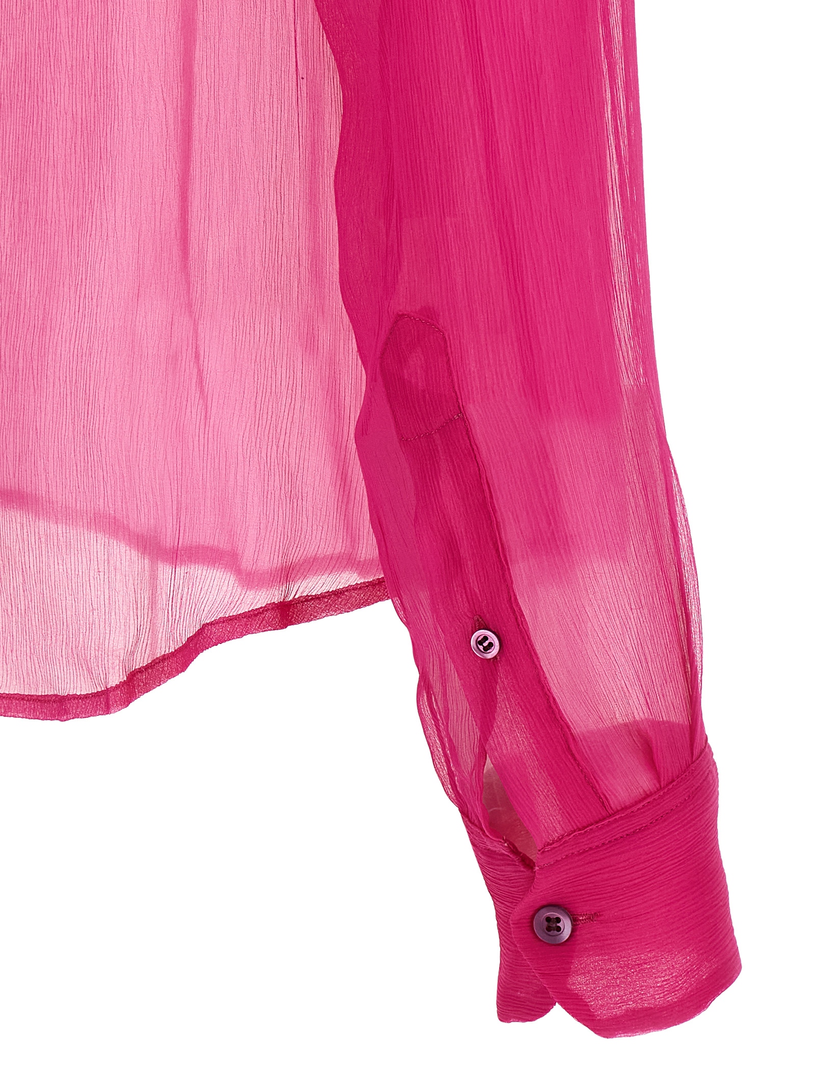 ‘Cloudy’ semi-transparent washed silk muslin shirt, pointed collar, front mother-of-pearl button closure, long cuffed sleeves, rounded and asymmetrical hem.