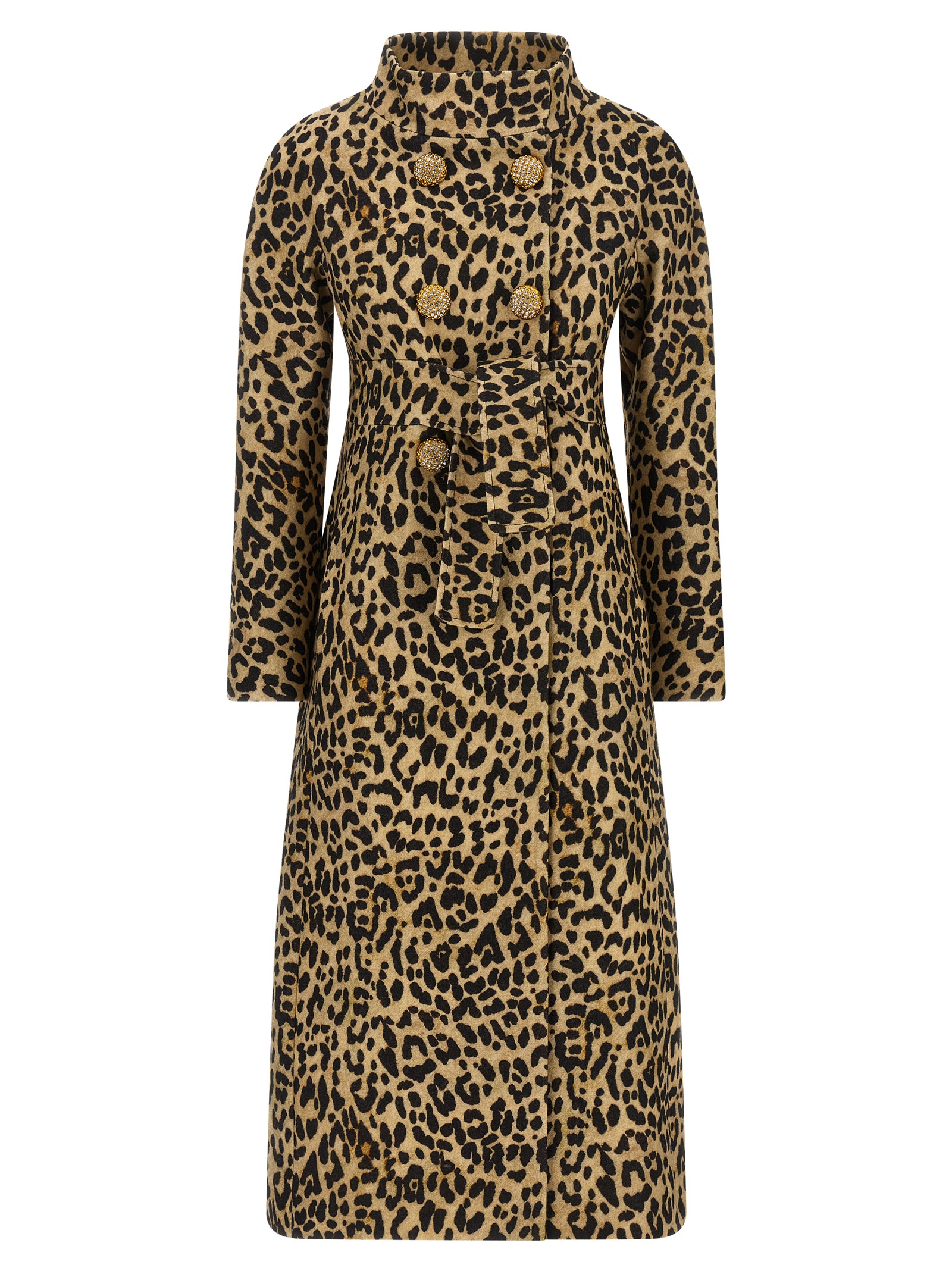 Double-breasted animal print cloth coat with jewel button closure, high neck, knotted and removable waist belt, side pockets, long sleeves.