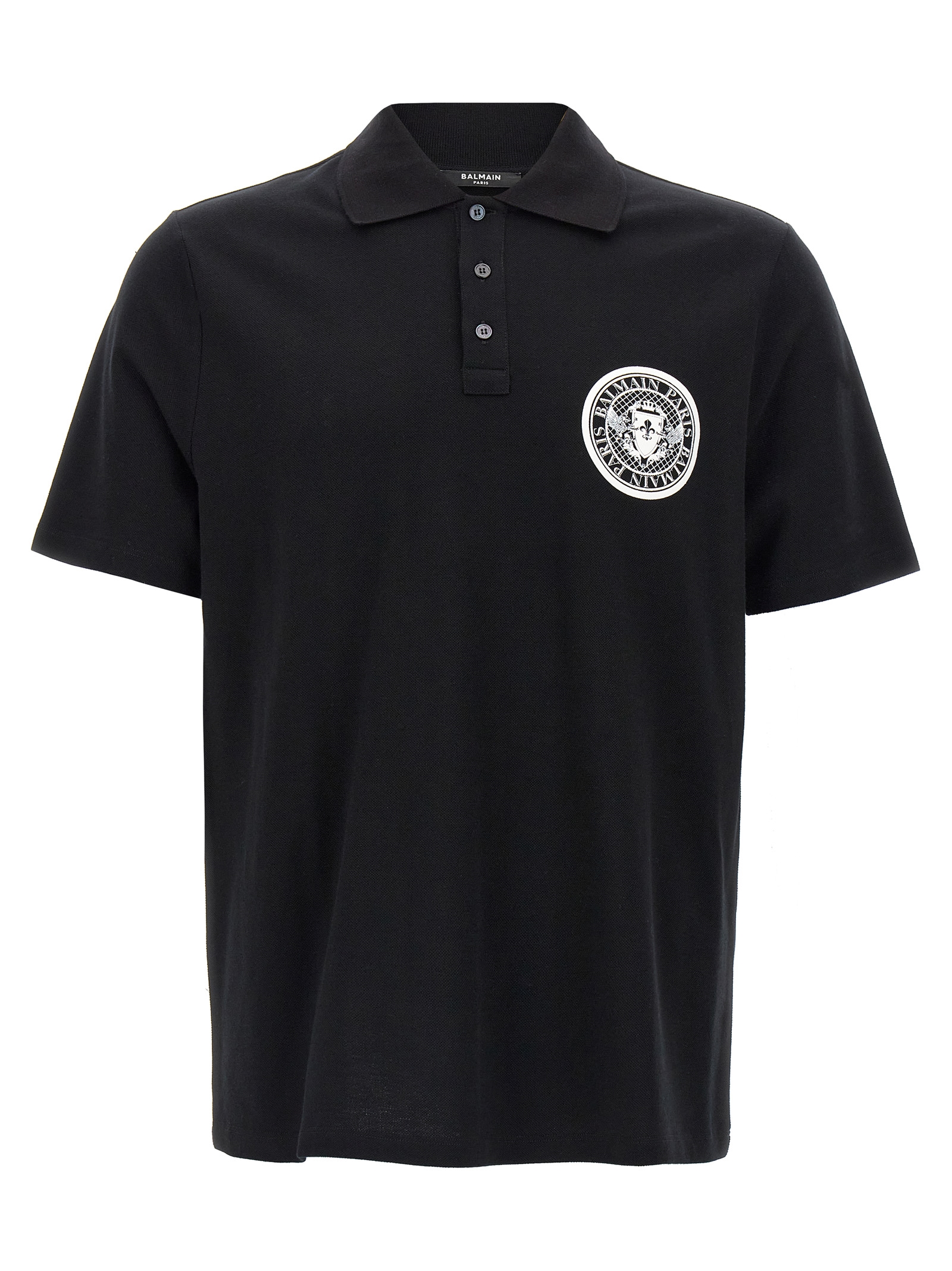 Piqué cotton polo shirt with front ‘Coin’ print, collar and buttons, short sleeves.