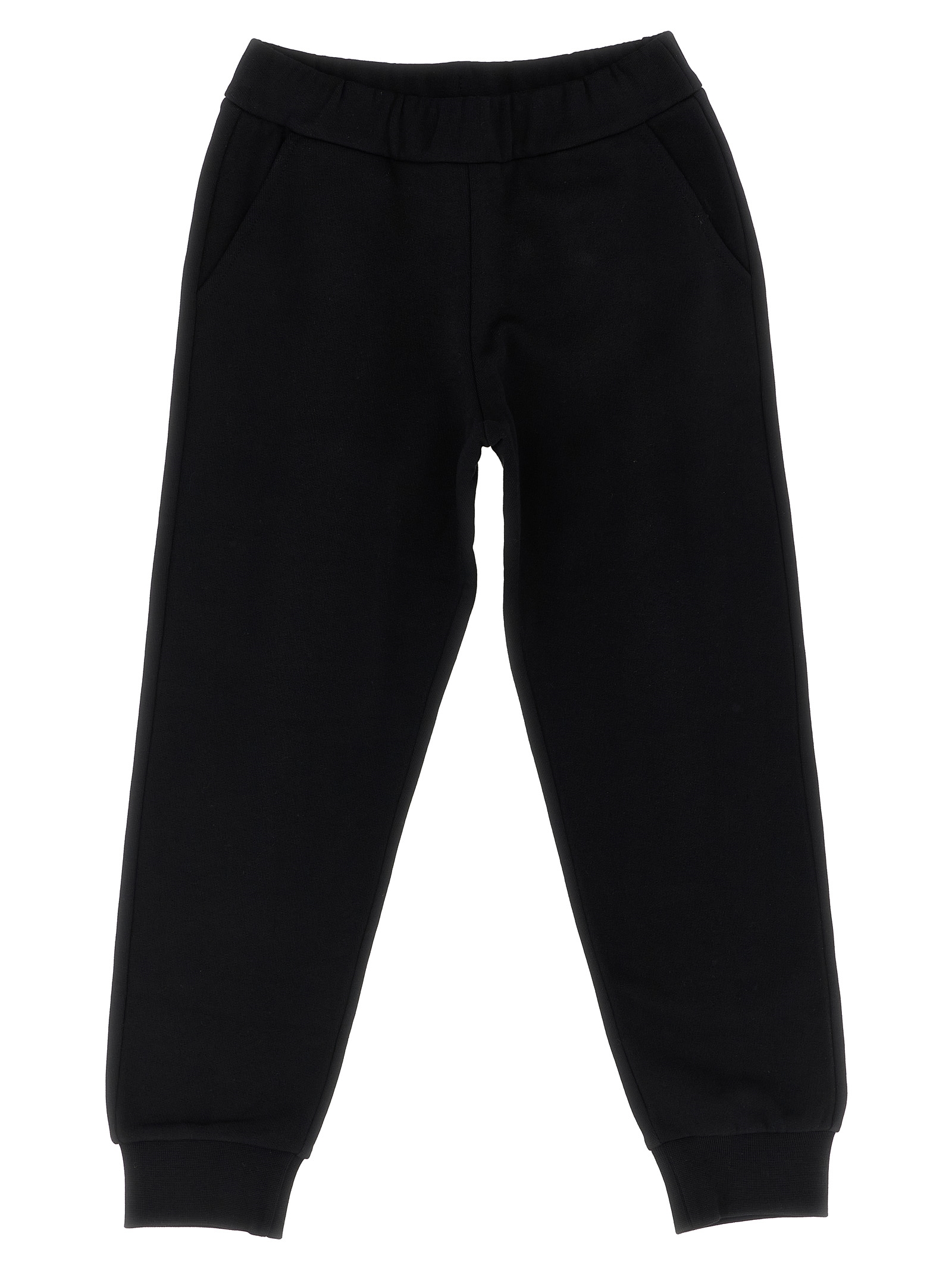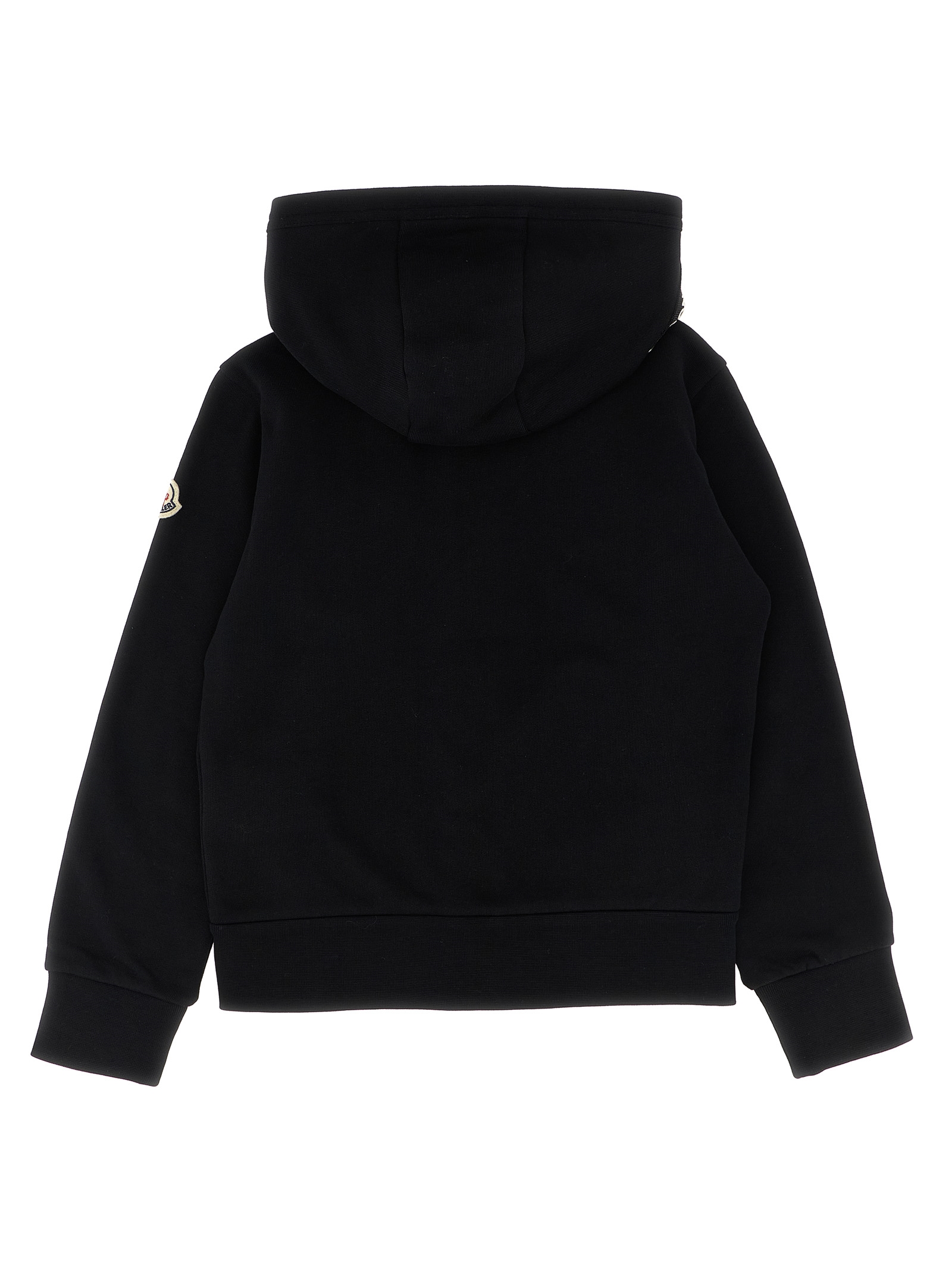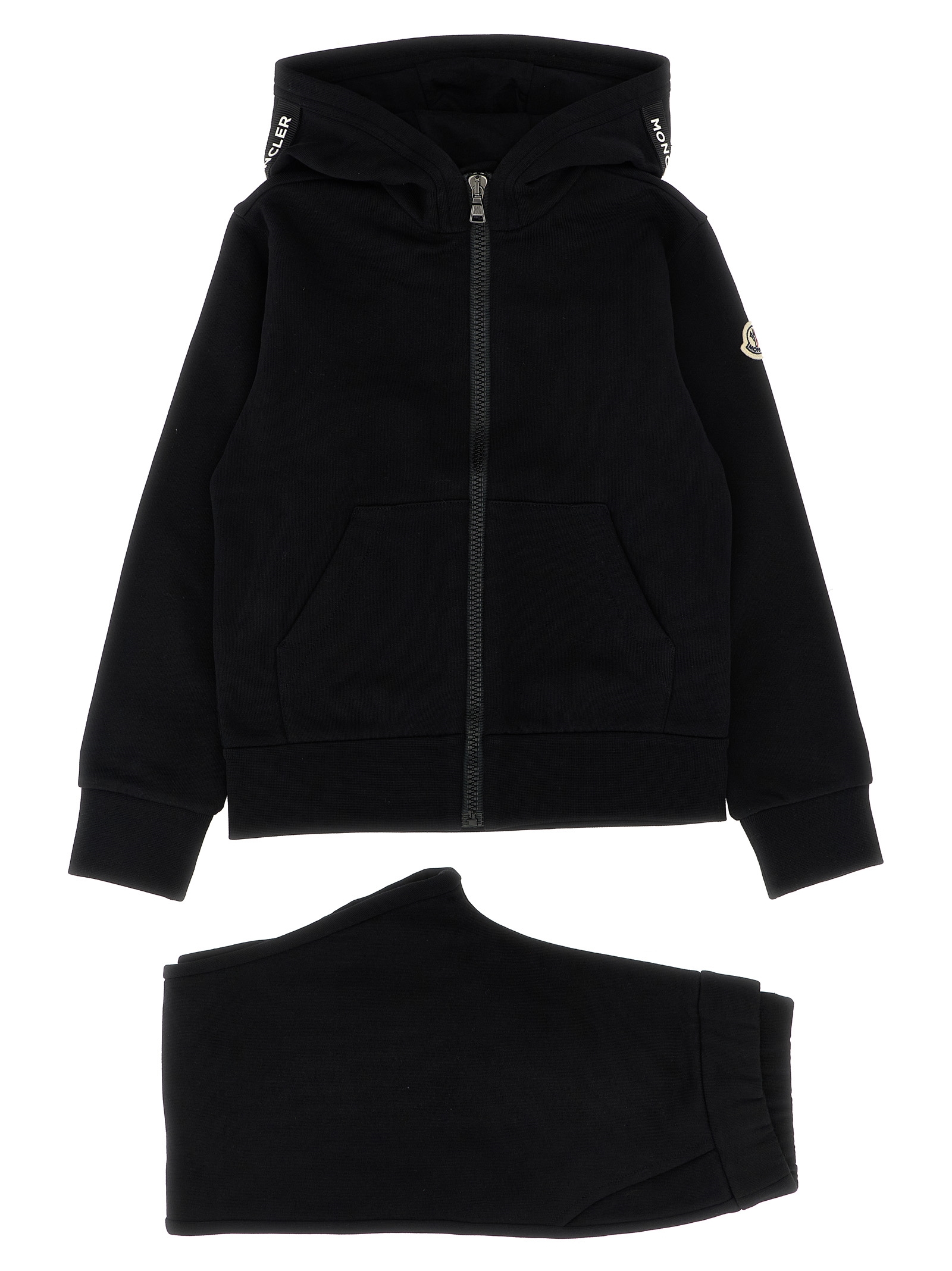 Lightly fleece cotton suit consisting of hoodie with logo grosgrain ribbon, front zip closure, pockets, long cuffed sleeves and felt logo patch and joggers with elastic waistband, pockets, ankle cuffs.