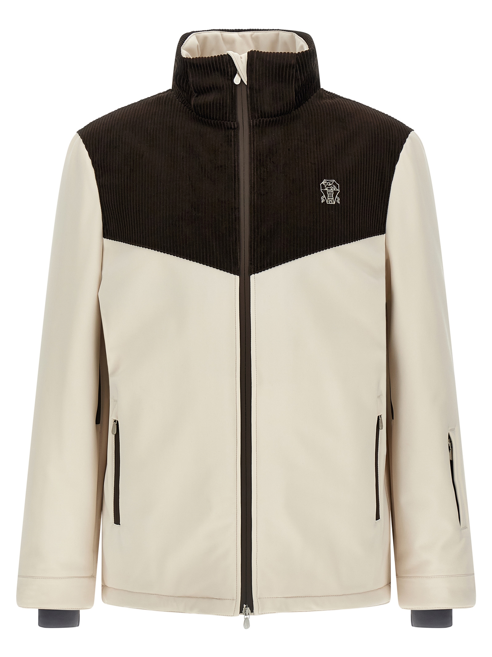 Ski jacket in water-repellent technical fabric with corduroy inserts, quilted nylon lining with goose down padding, adjustable and removable hood, standing collar, logo embroidery and front zip closure, pockets, long sleeves with stretch knit cuffs, gaiter and drawstring on the hem.