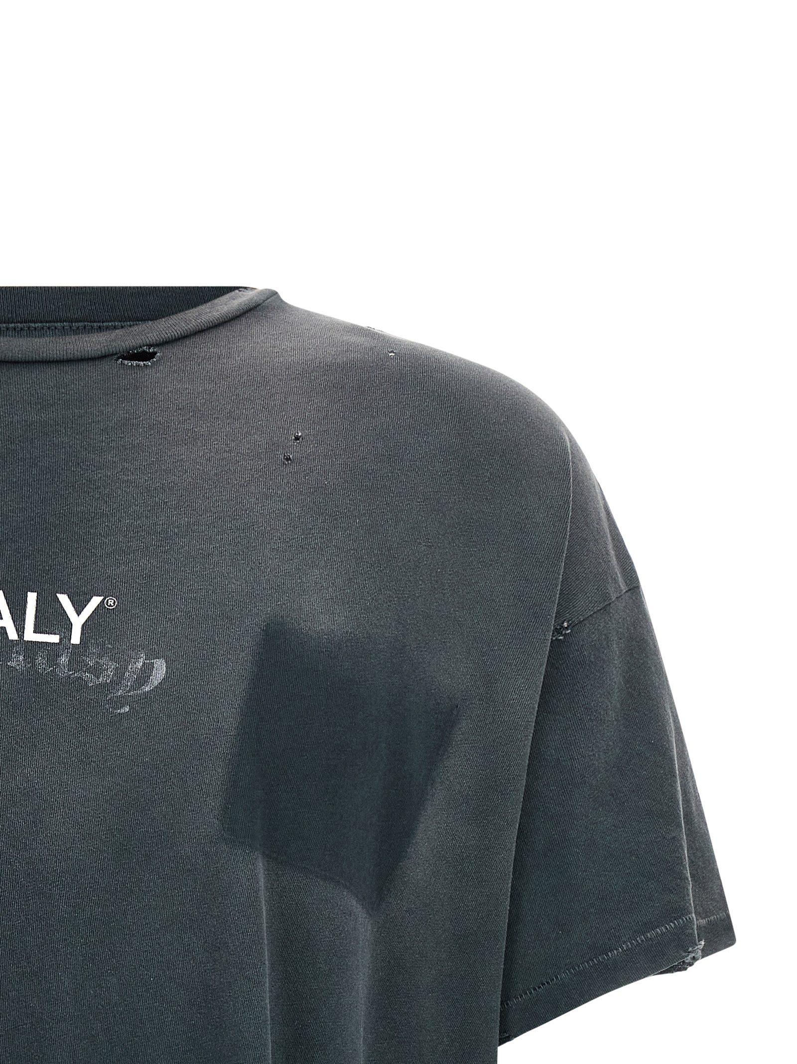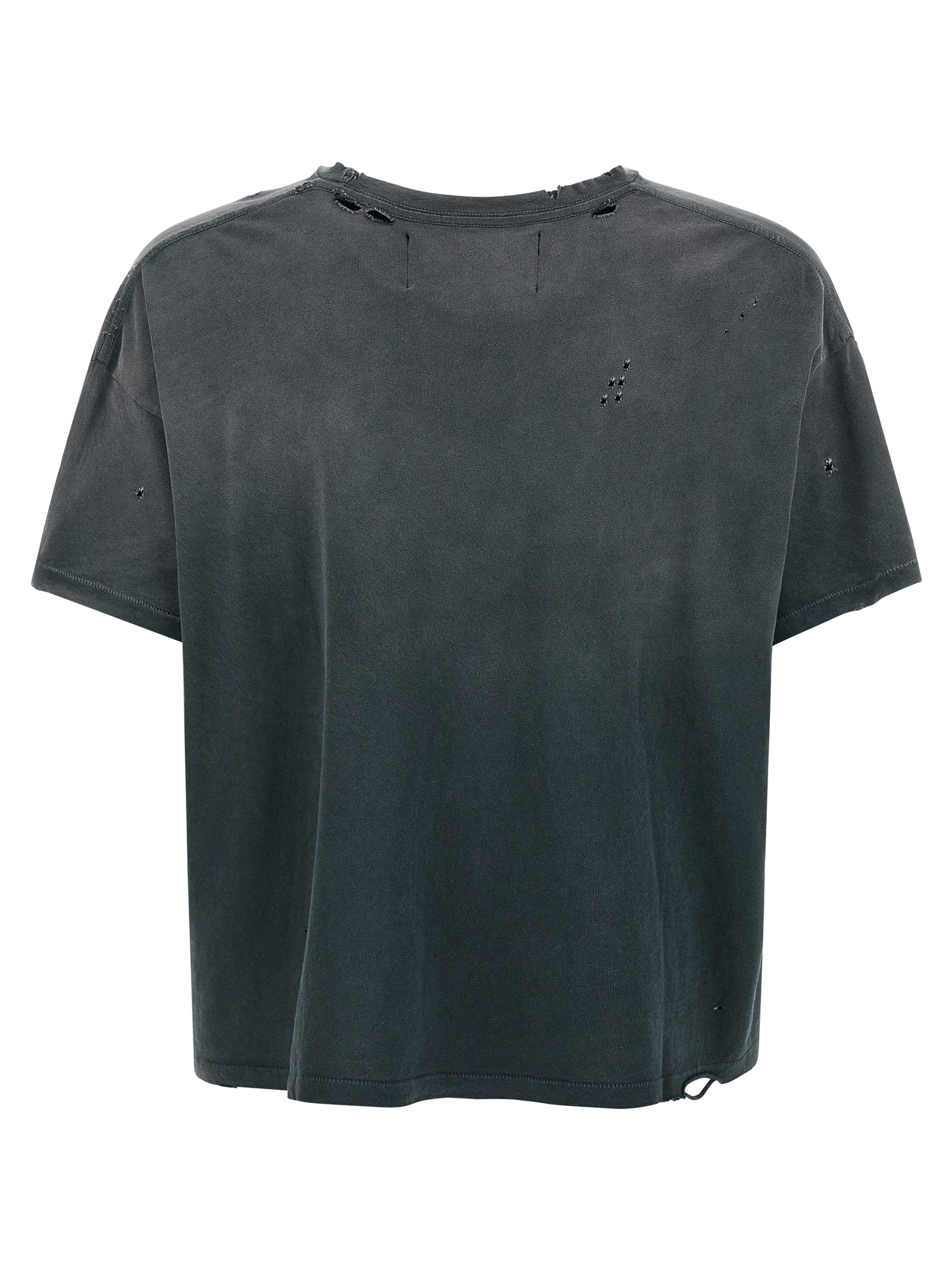 ‘Core Logo’ vintage effect Japanese cotton jersey T-shirt subjected to intense vintage wash with sun-faded details and hand-worn effects, front print and trompe l’oeil pocket, crew neck, short sleeves with dropped shoulders, asymmetrical hem.