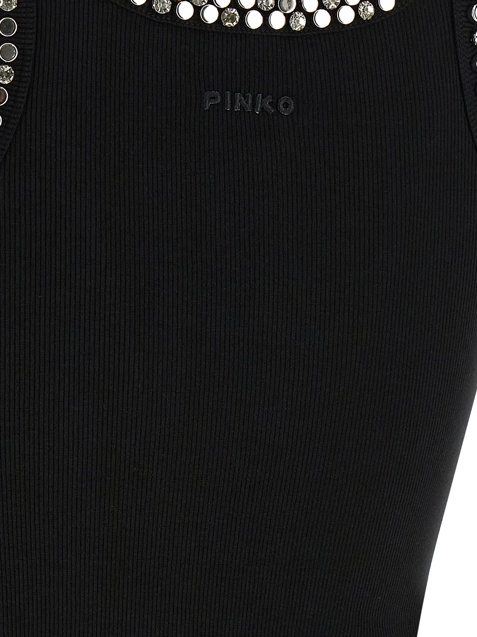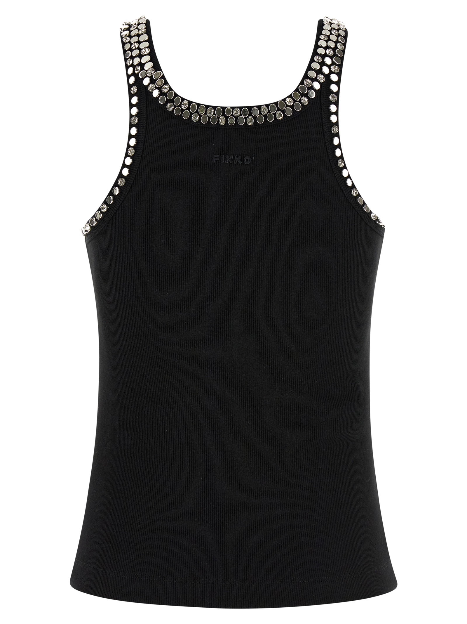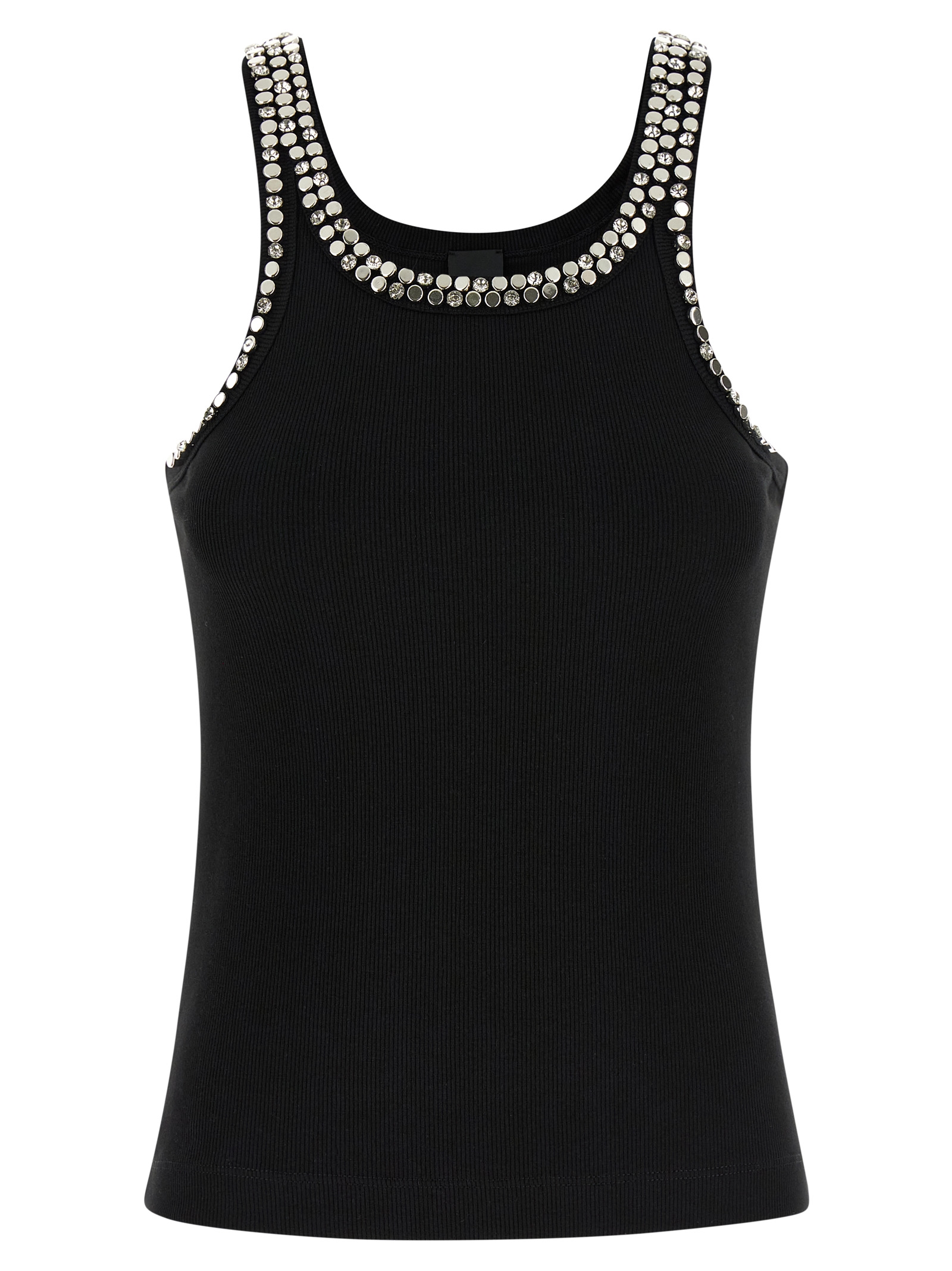 ‘Coriandoli’ tank top in ribbed stretch cotton blend with metal studs and crystal appliqué on the front and back, round neckline, tone-on-tone logo embroidery at the back.
