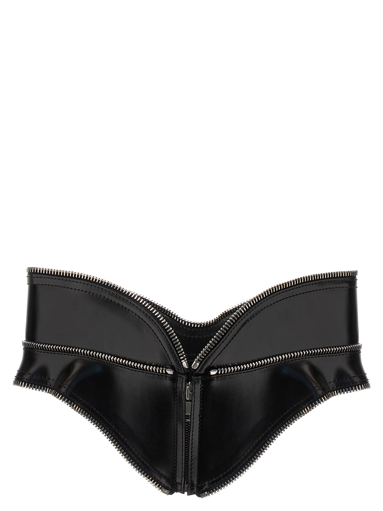 Corset leather belt, zipper tooth trimming, and back zip closure.