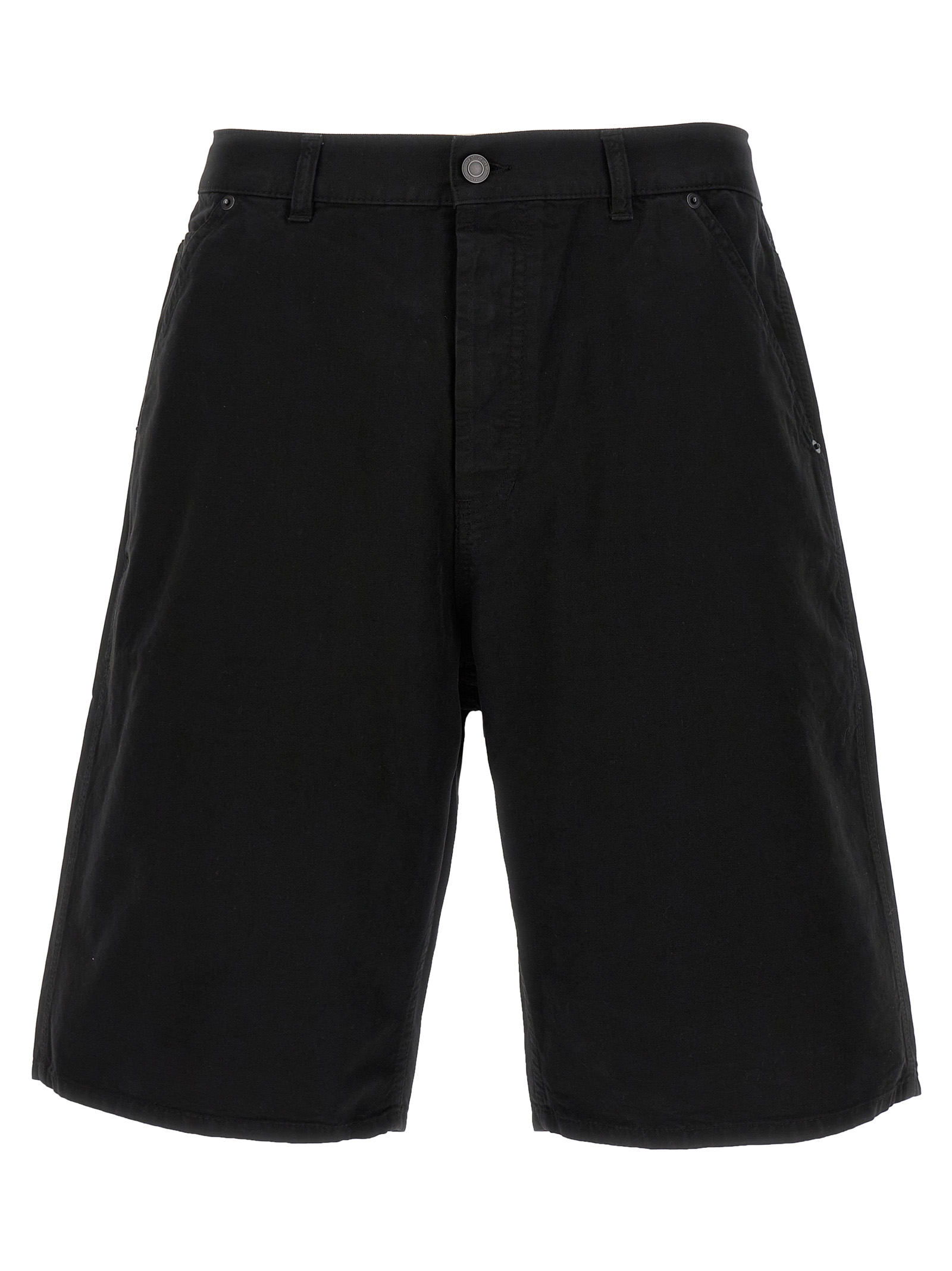 Cotton twill bermuda shorts with medium waist, front button closure, five pockets, and leather logo label at the back.