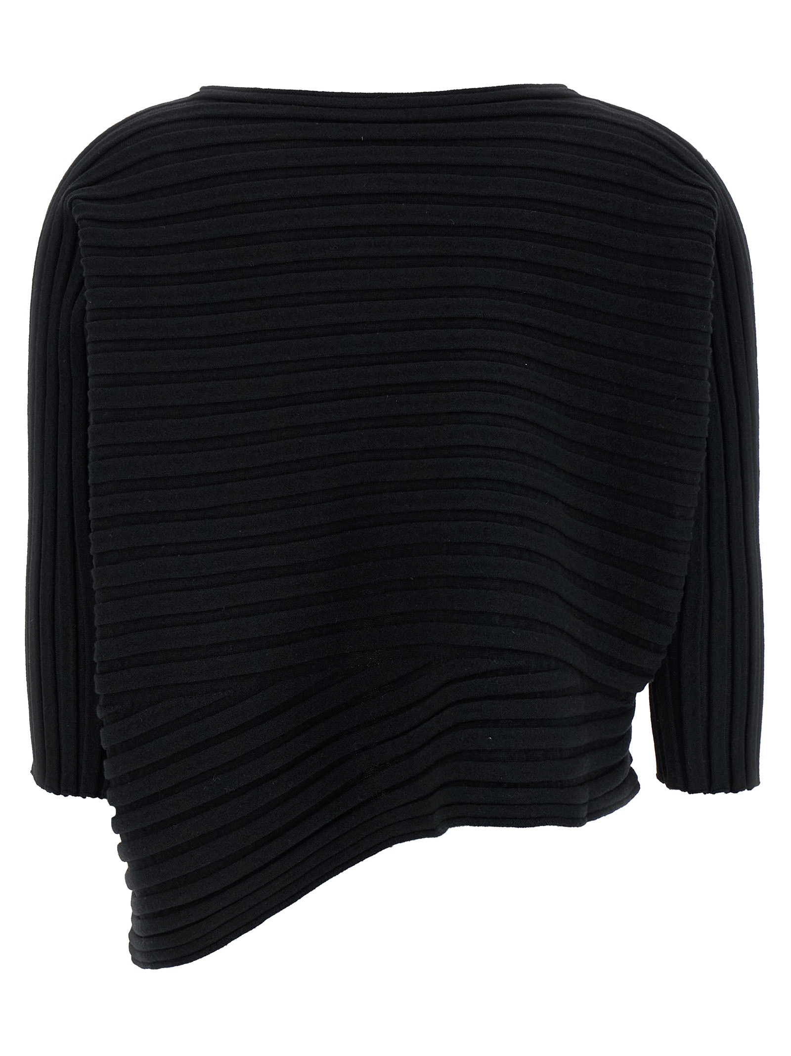 ‘Cotton Cashmere Knit’ top made of cashmere knit using a mix of two knit structures with an irregular consistency, unique straight silhouette created by the combination of the two knit structures in the warp and weft, round neckline, 3/4 sleeves, asymmetrical hem.