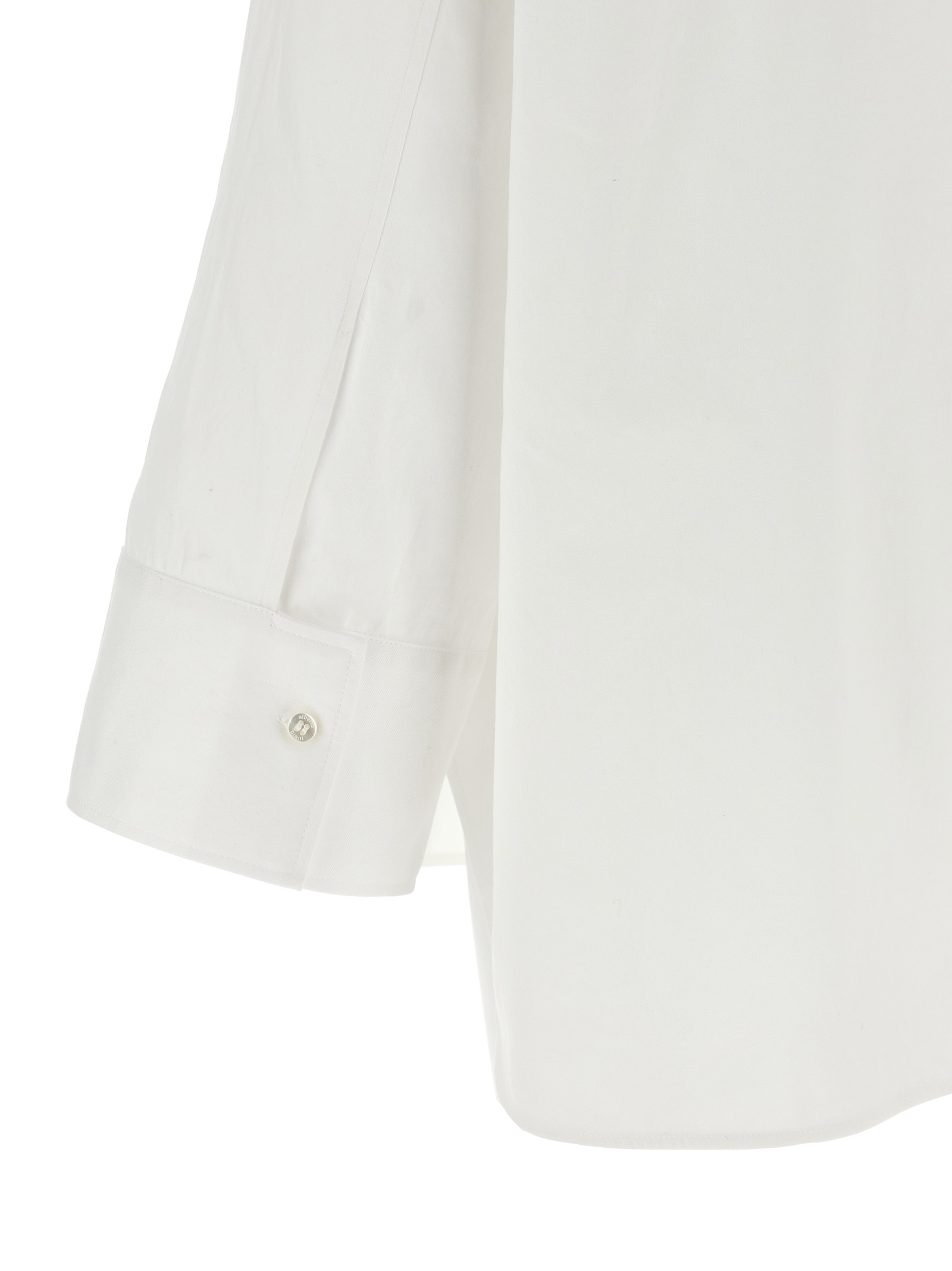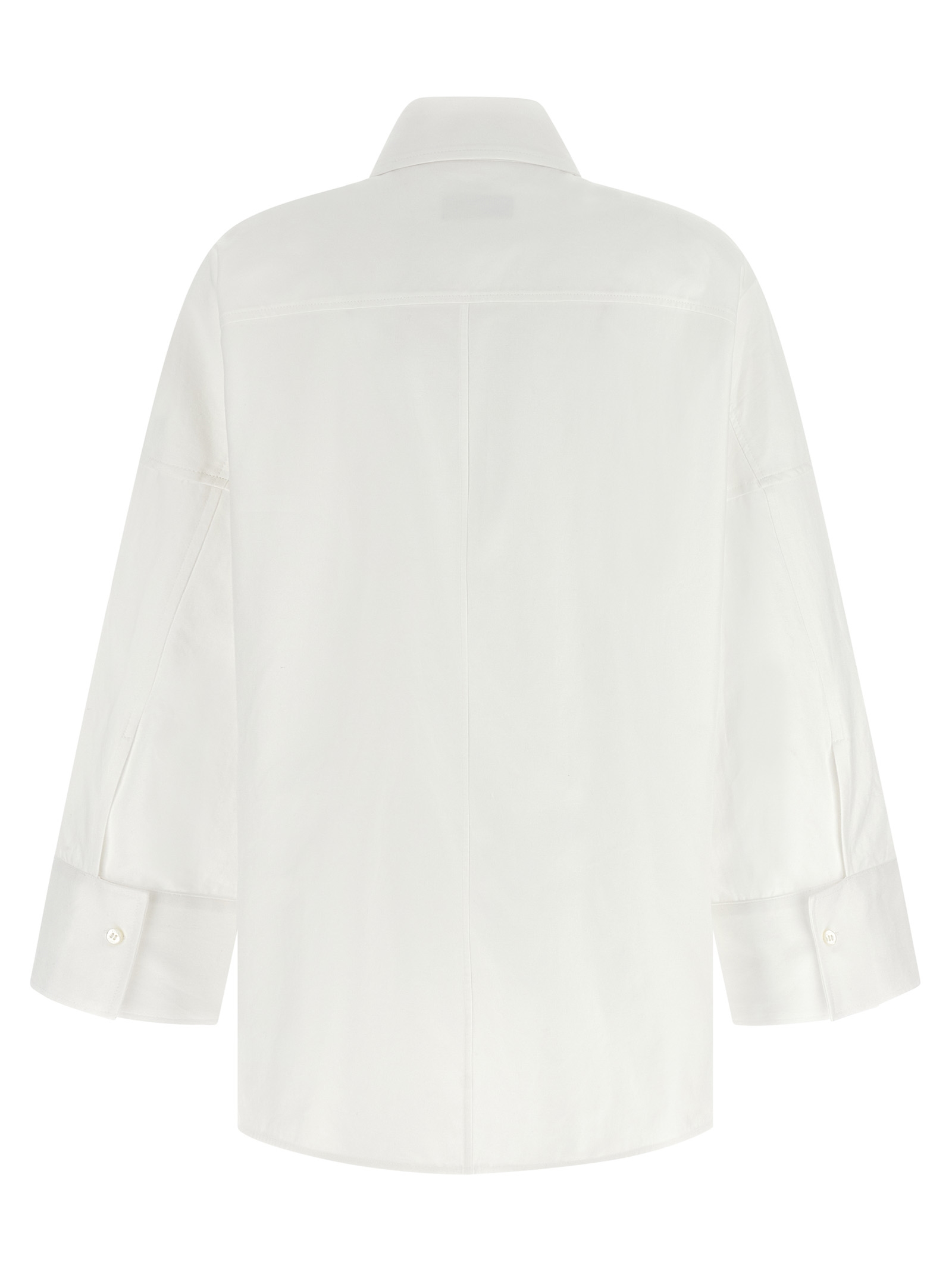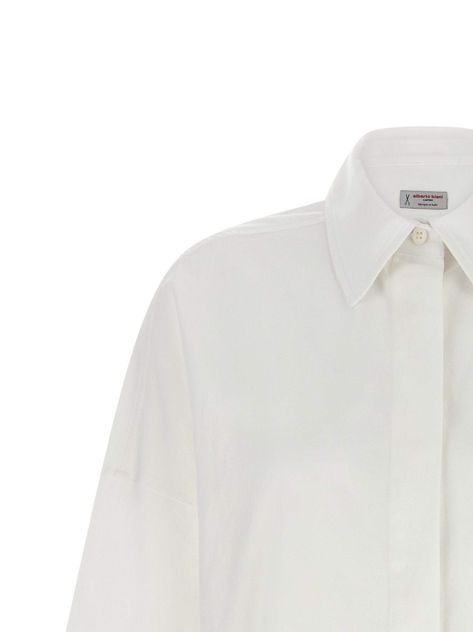 Thick washed-effect cotton shirt, wide collar, with rounded side slits, dropped shoulder, wide sleeves with cuffs. Front closure with hidden buttons.