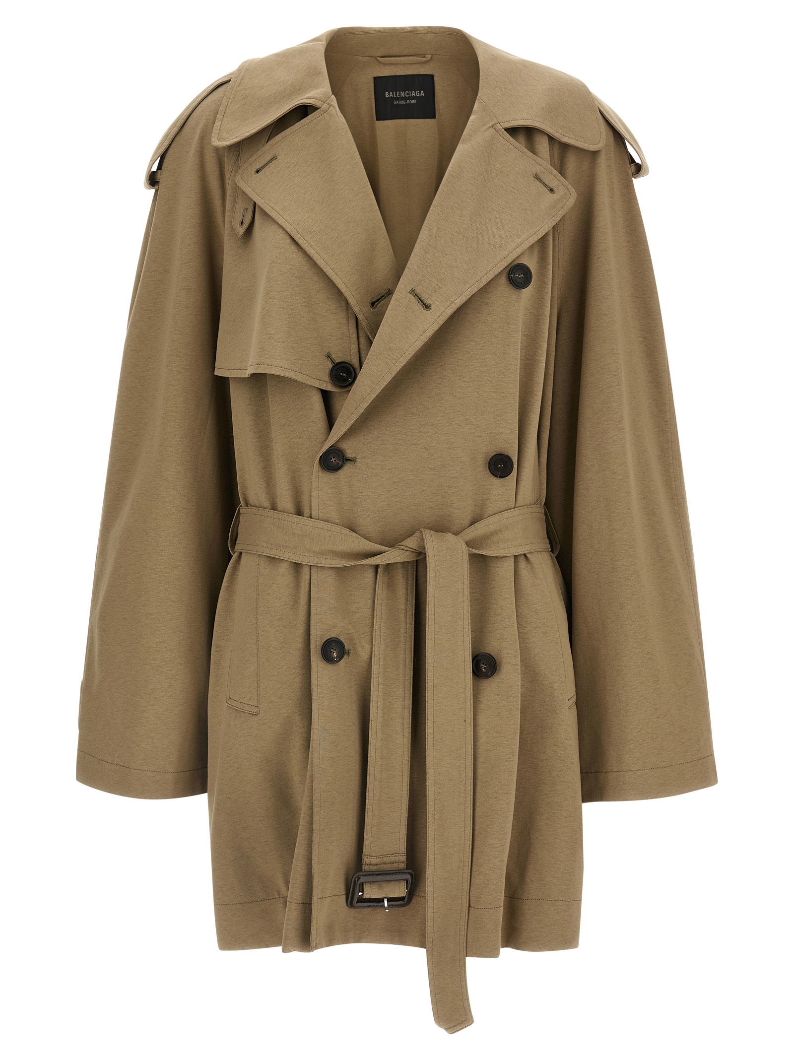 Double-breasted short mélange light cotton trench coat with front button closure, lapel collar, pockets, long sleeves, cape and back split, and removable belt.