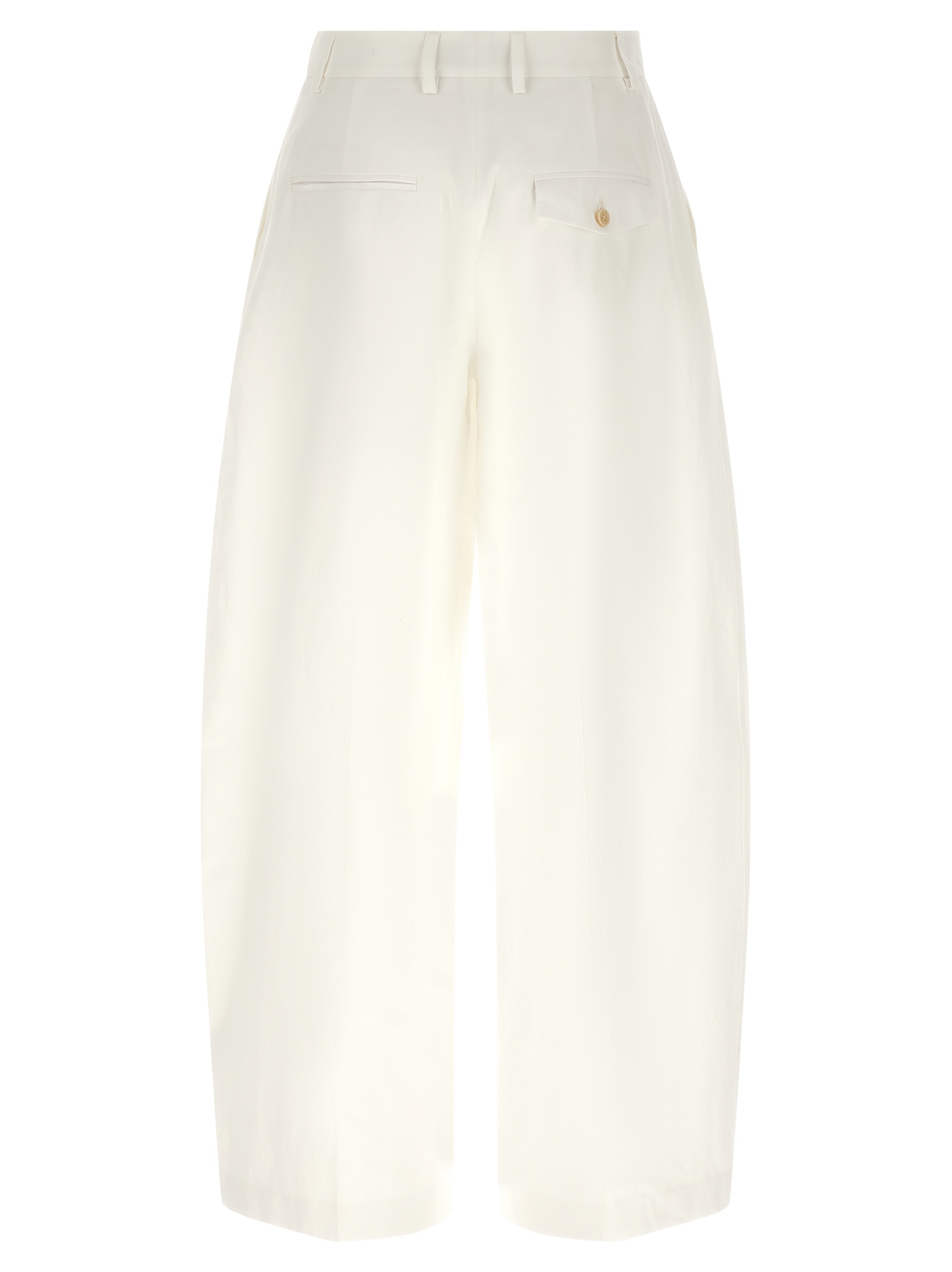 Cotton trousers, wide and curved leg, pince, stretched pleat, front zip and button closure, front French pockets, back welt pockets.