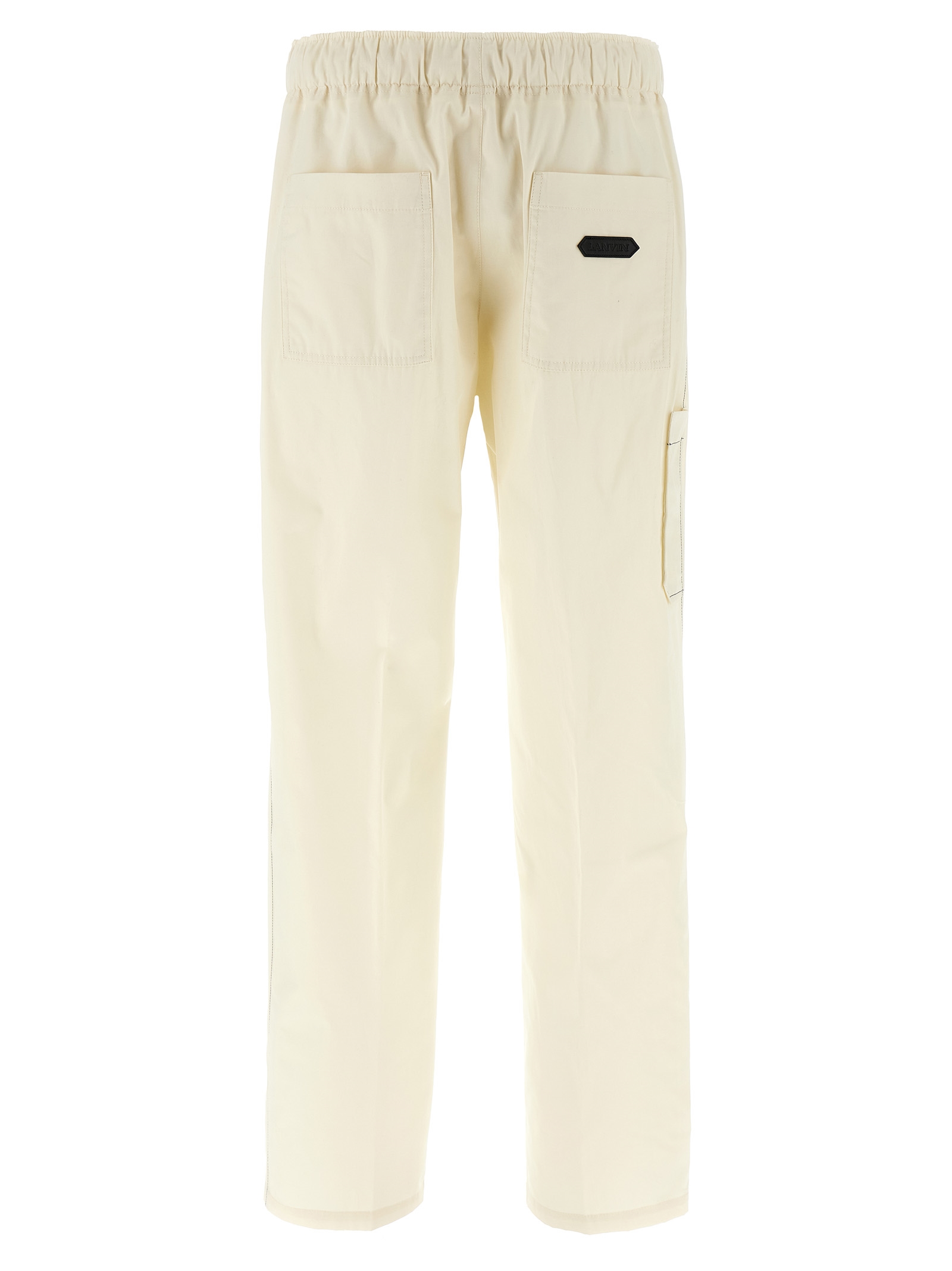 Light cotton trousers, adjustable drawstring elastic at the waist, pockets, button flap, back leather logo patch, wide leg.