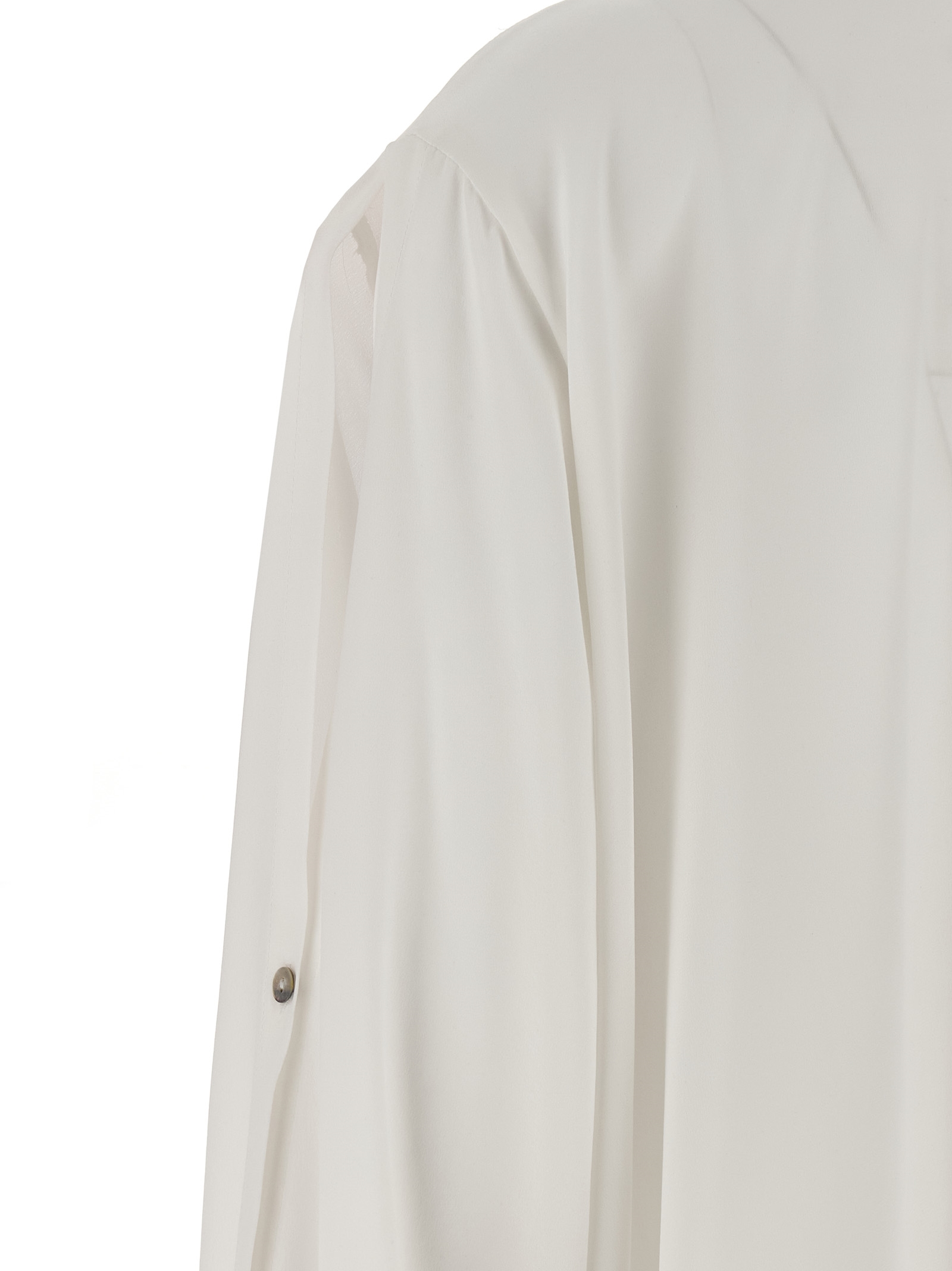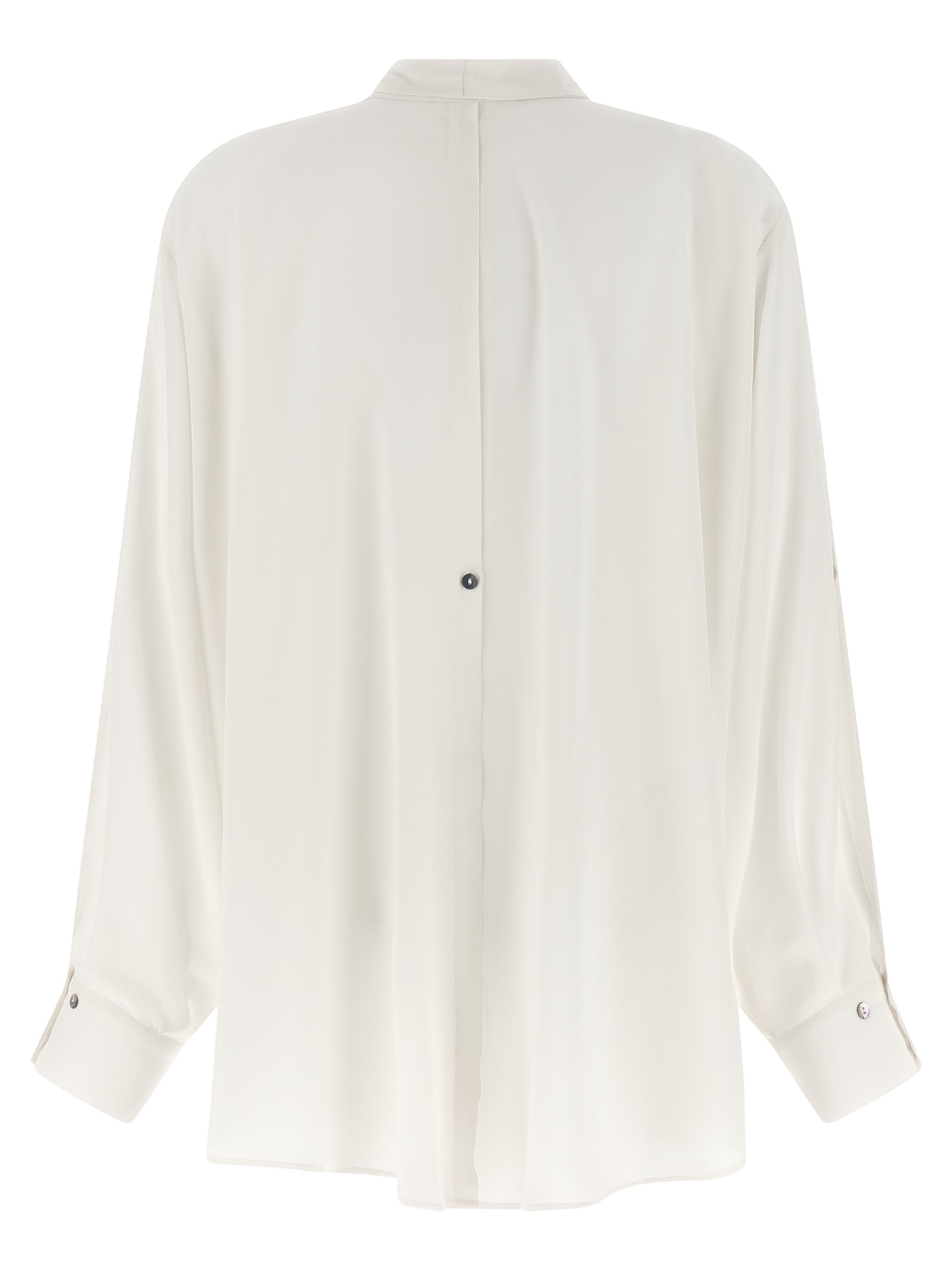 Crepe de chine silk shirt with lavallière collar, mother-of-pearl button closure on the front and back with cut-out details at the back, long cuffed sleeves and button slit, rounded and asymmetrical hem.