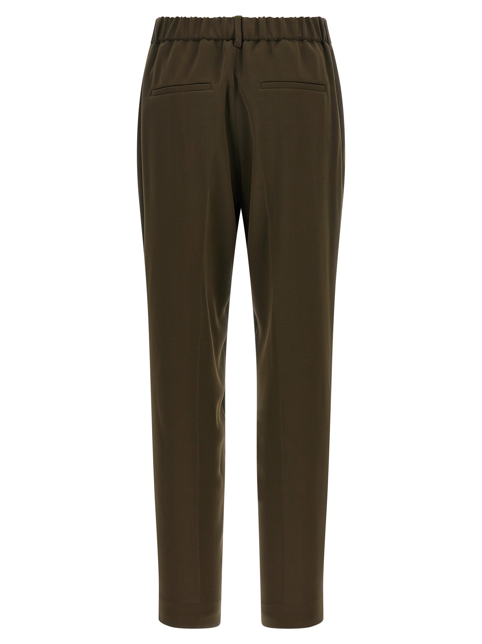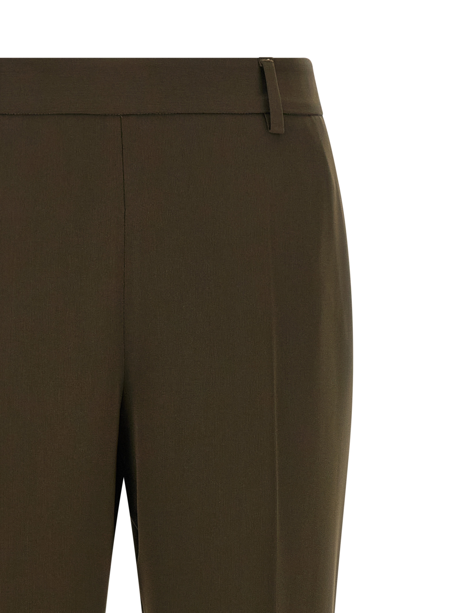 Crepe pants, straight leg, stretched pleat, elastic back waistband, side zip closure, front American pockets, back welt pockets.