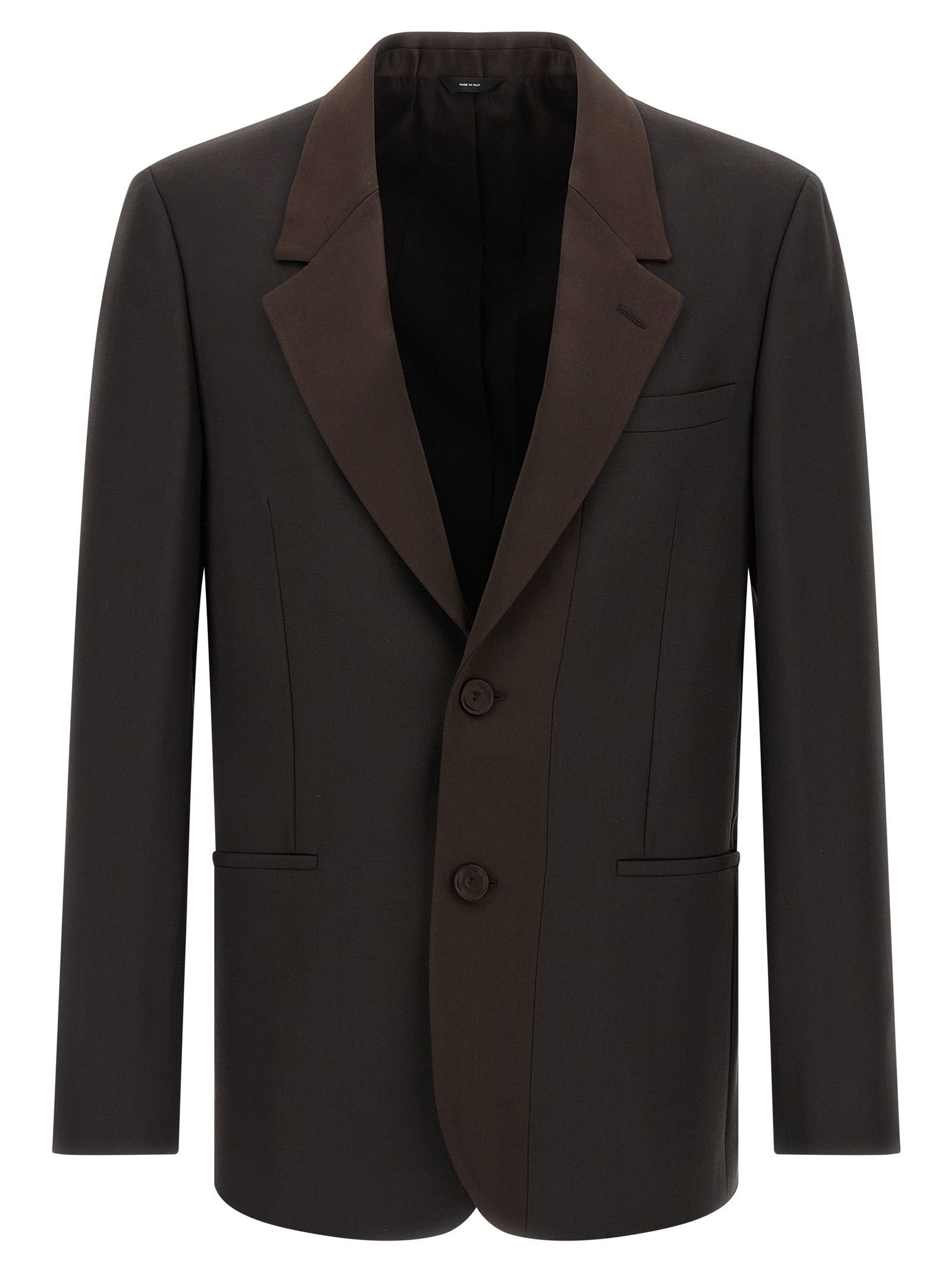 Single-breasted wool crêpe blazer with front button closure, tone-on-tone silk mirror lapels, chest pocket, patch pockets, structured shoulder strap, cuffs with open buttonholes, back vent, lining.