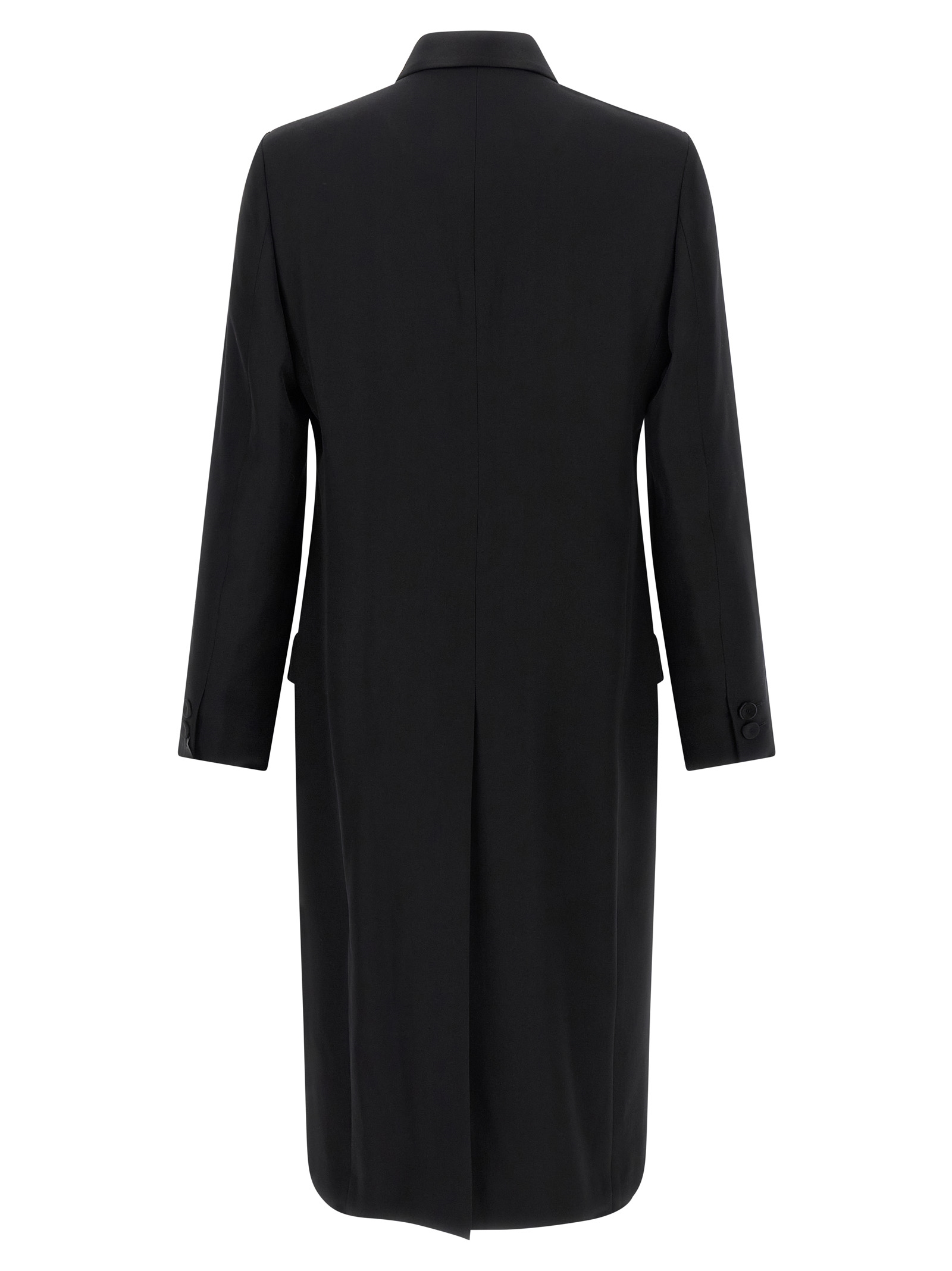 Single breasted crepe wool coat with double layer satin lapel with front button closure, mirror lapels, breast pocket, flap pockets, structured shoulder strap, long sleeves, back vent, cupro lining.