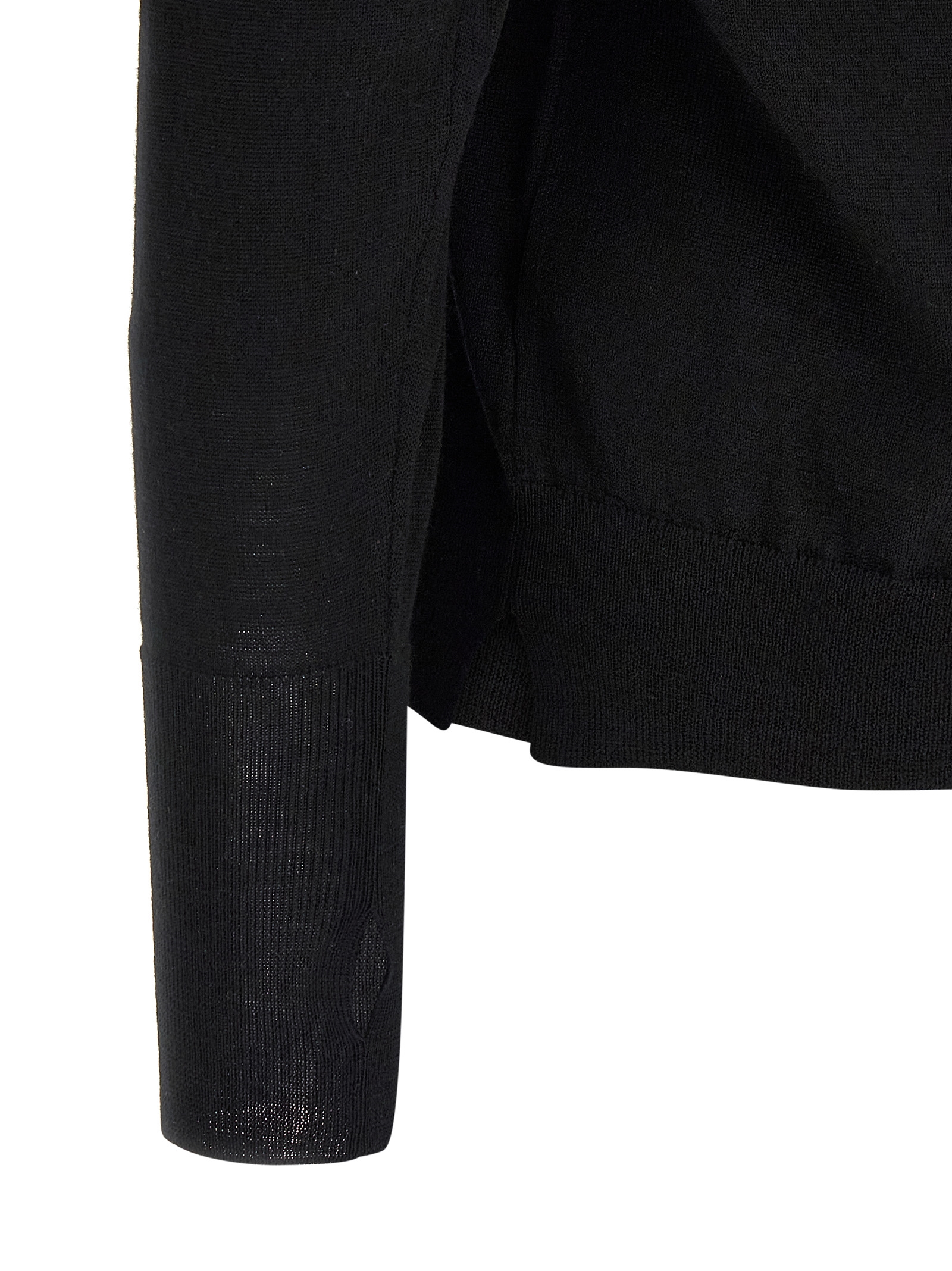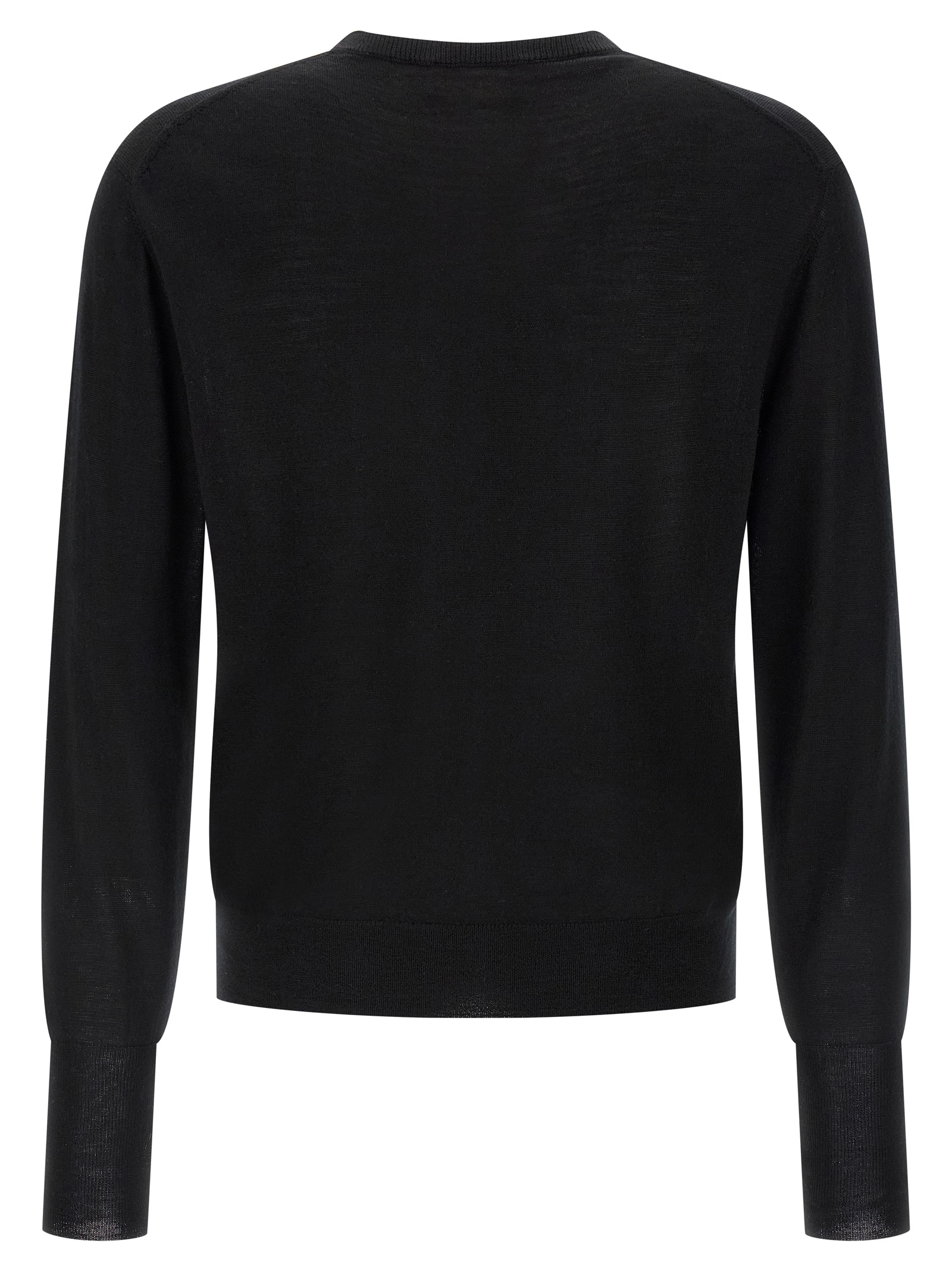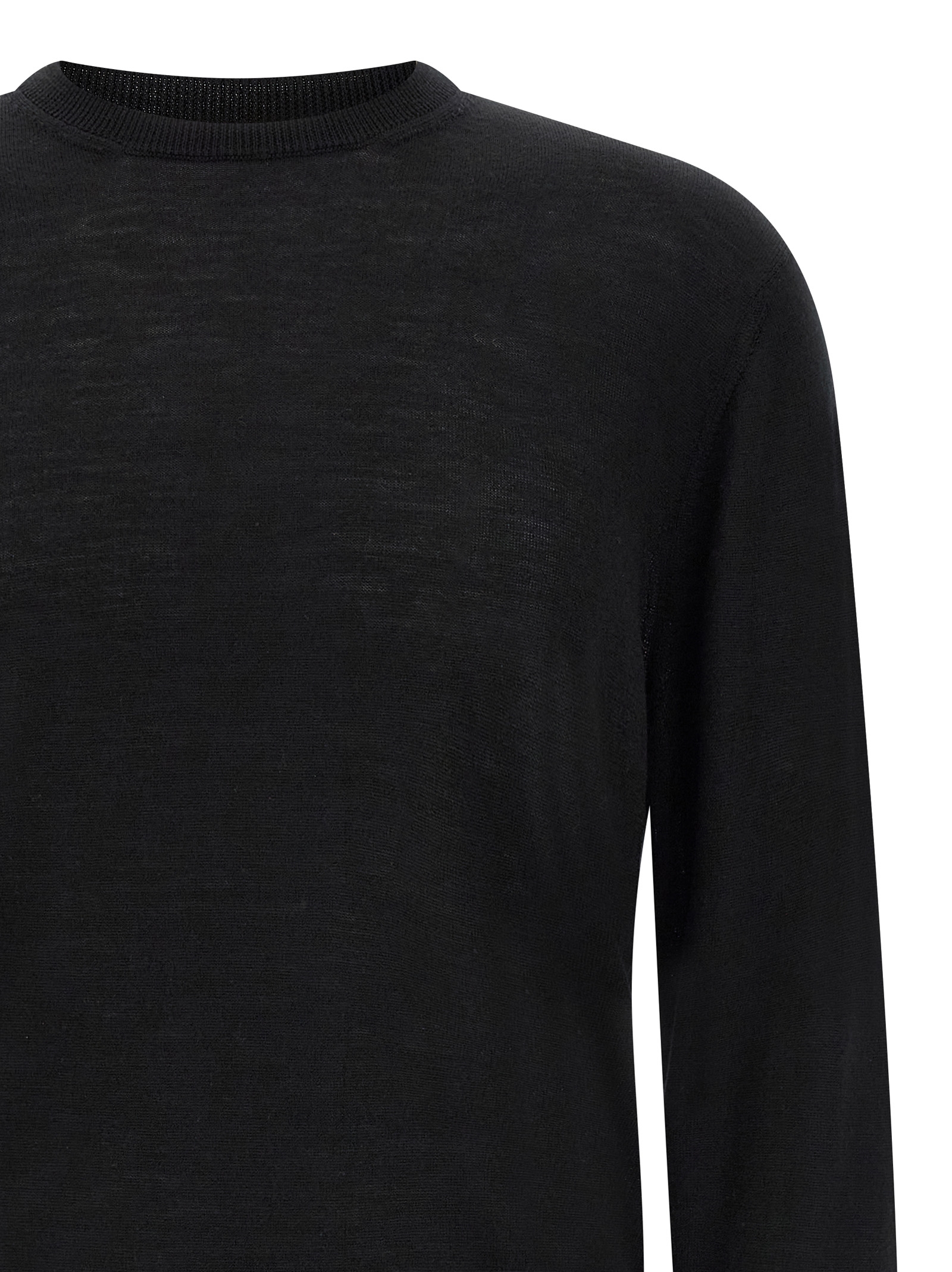 Merino, silk and cashmere wool sweater with fine knit, crew neck, long cuffed sleeves, side slits on the hem.