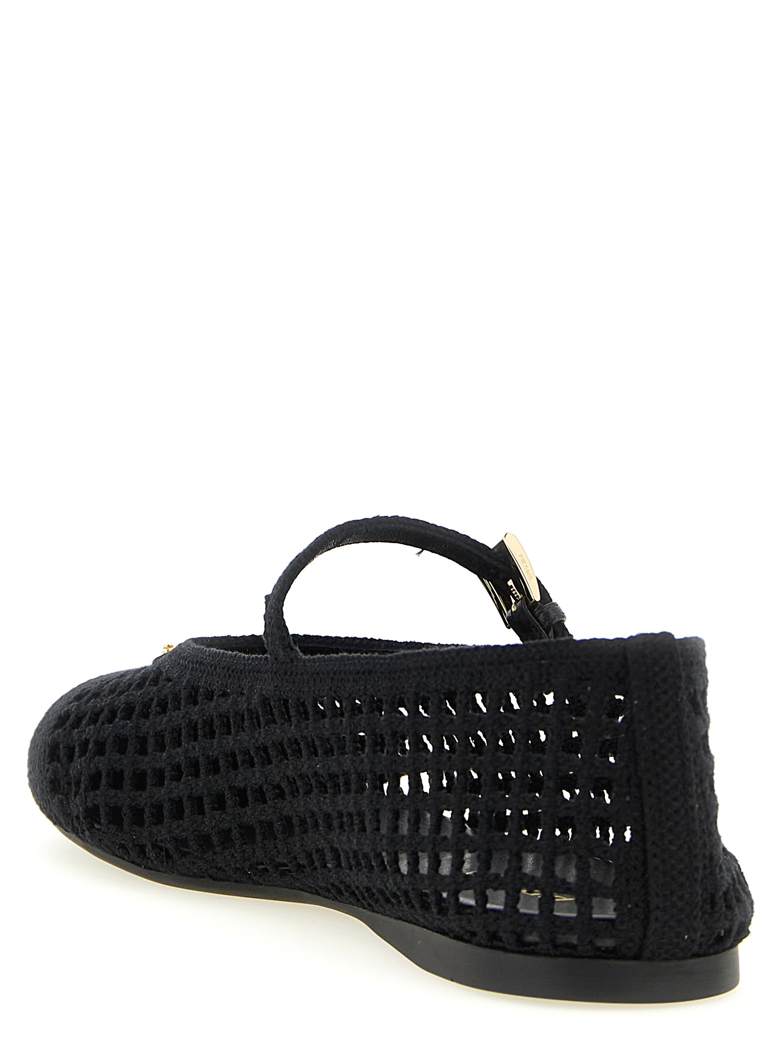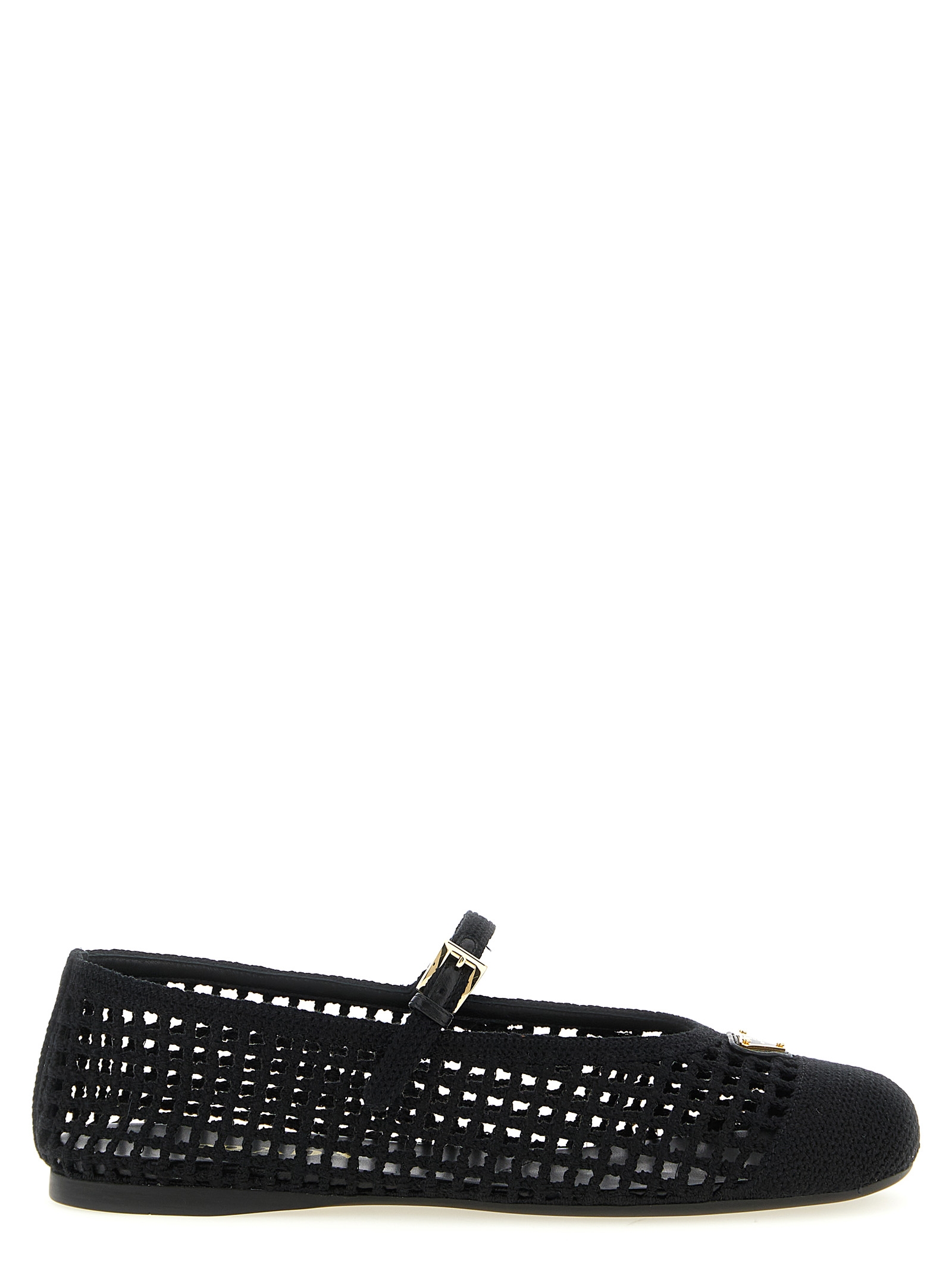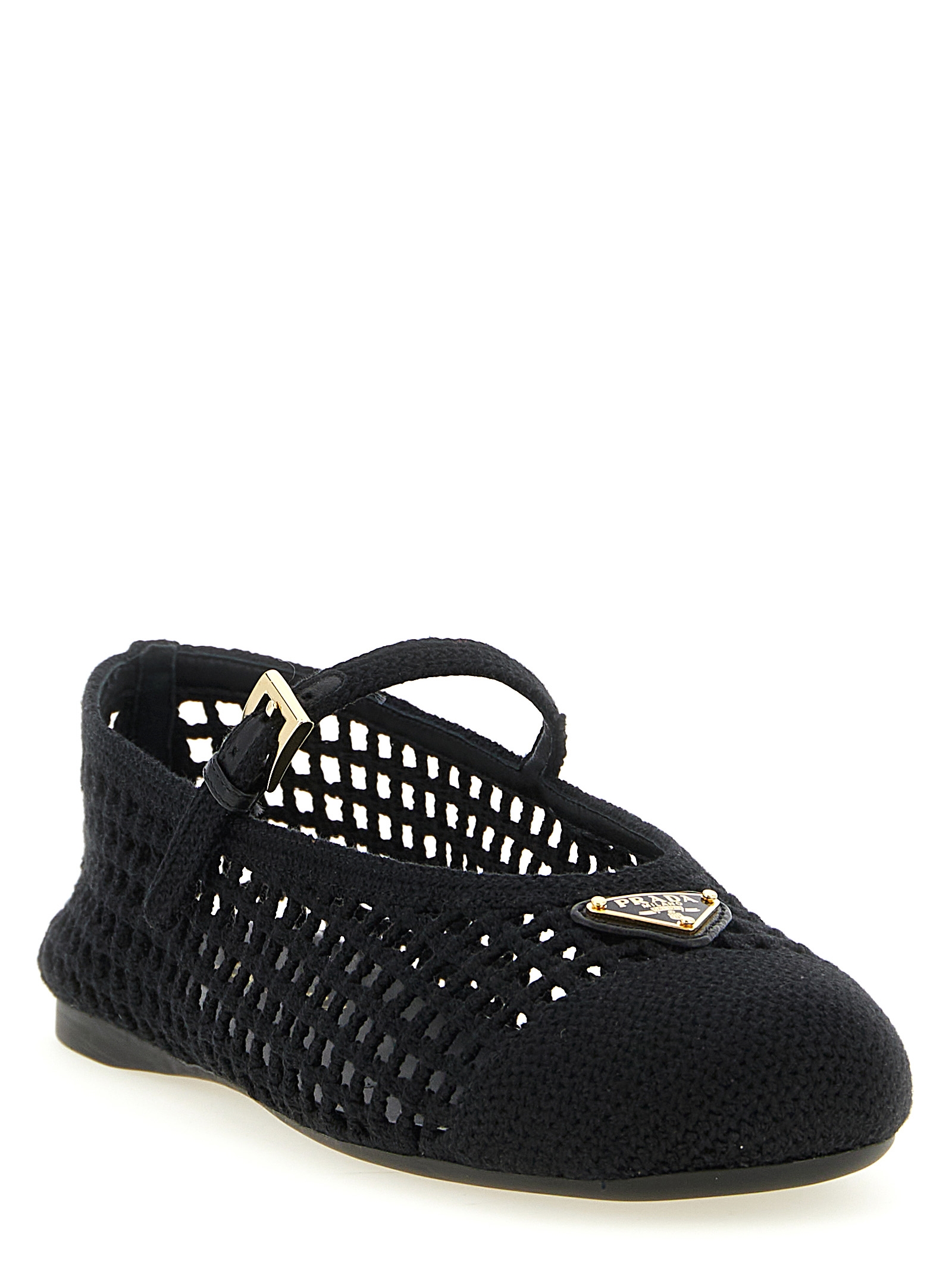 Crochet cotton ballet flats with tone-on-tone leather details, rounded toe, adjustable strap on the instep, front enameled metal triangle logo, and rubber sole.