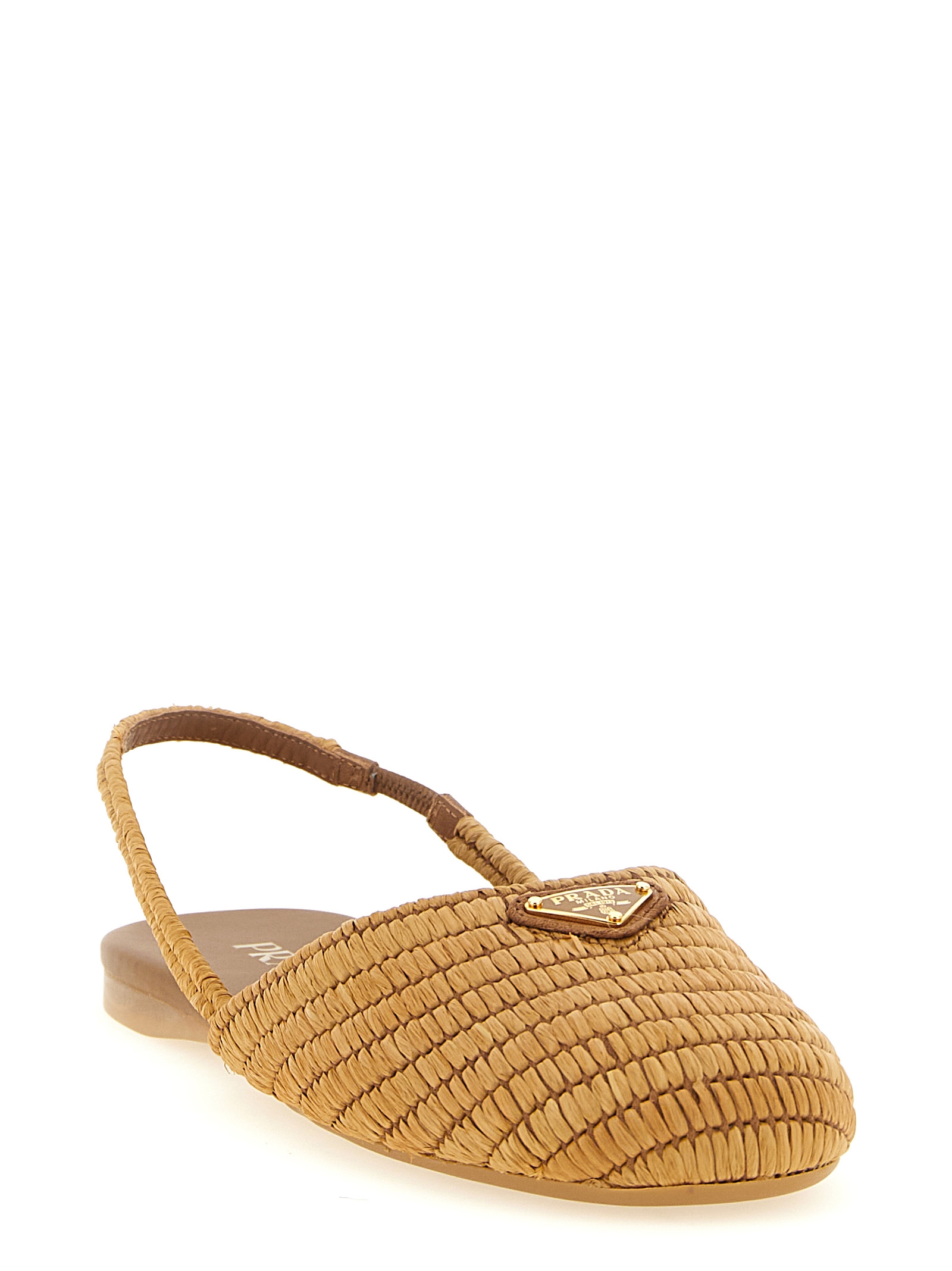 Crochet viscose slingbacks, round toe with triangle enameled metal logo on the front, strap with elastic insert, monobloc rubber sole.