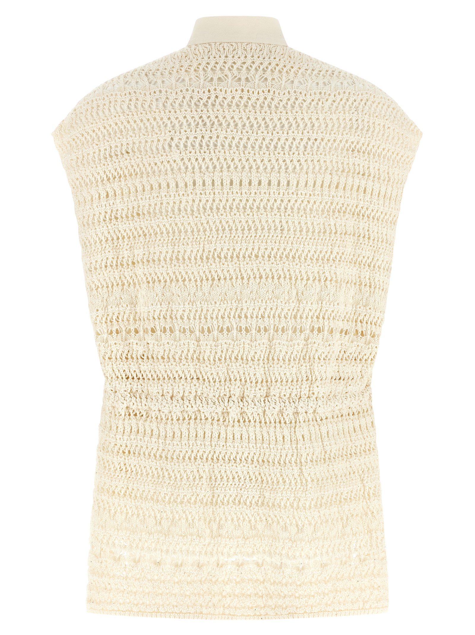 Cotton gabardine vest with tone-on-tone back crochet insert, high neck, zip and snap button closure on the front, pockets, and asymmetrical hem.