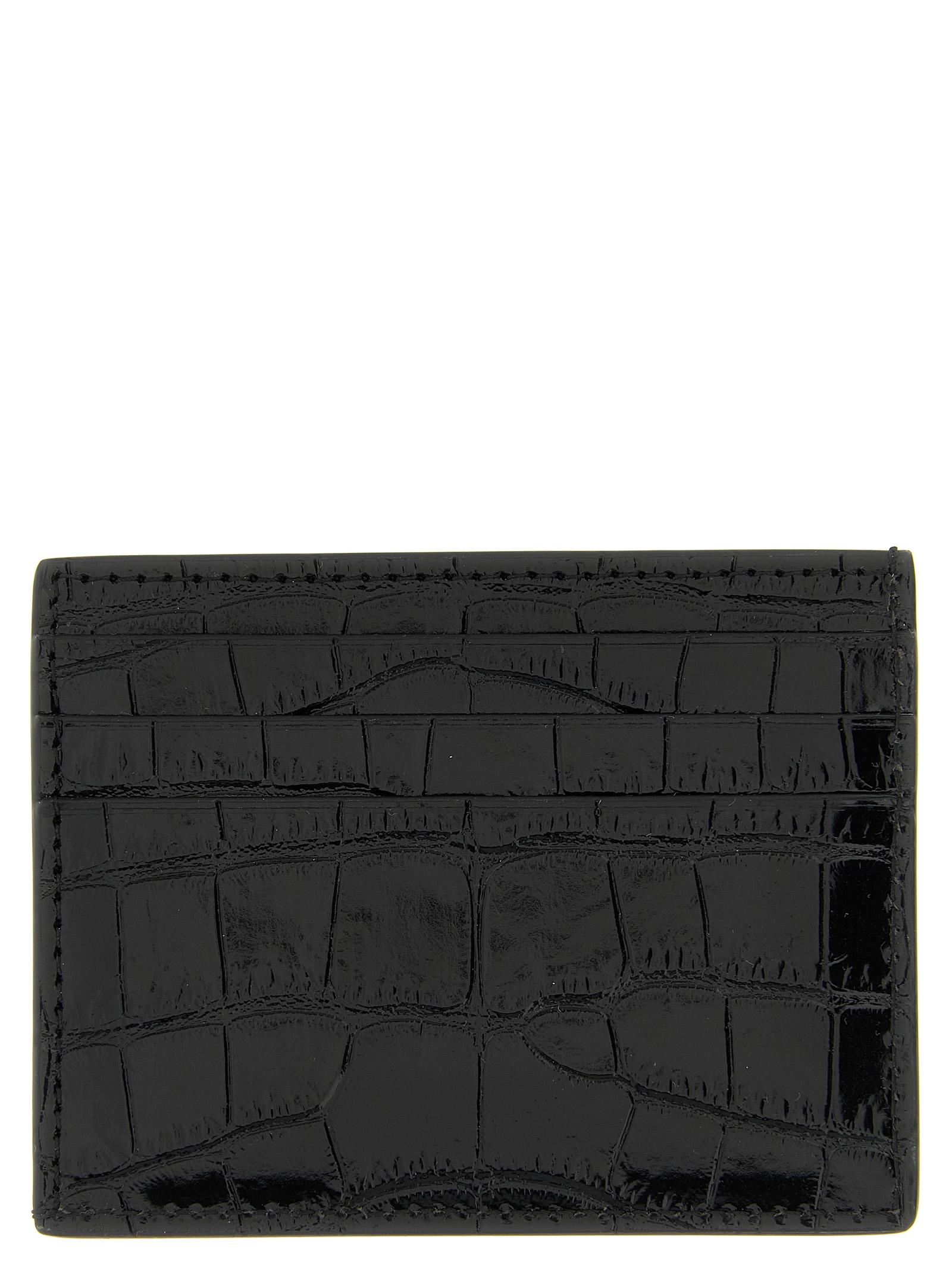 Croc print glossy leather card holder, front embossed logo, and additional central compartment.
