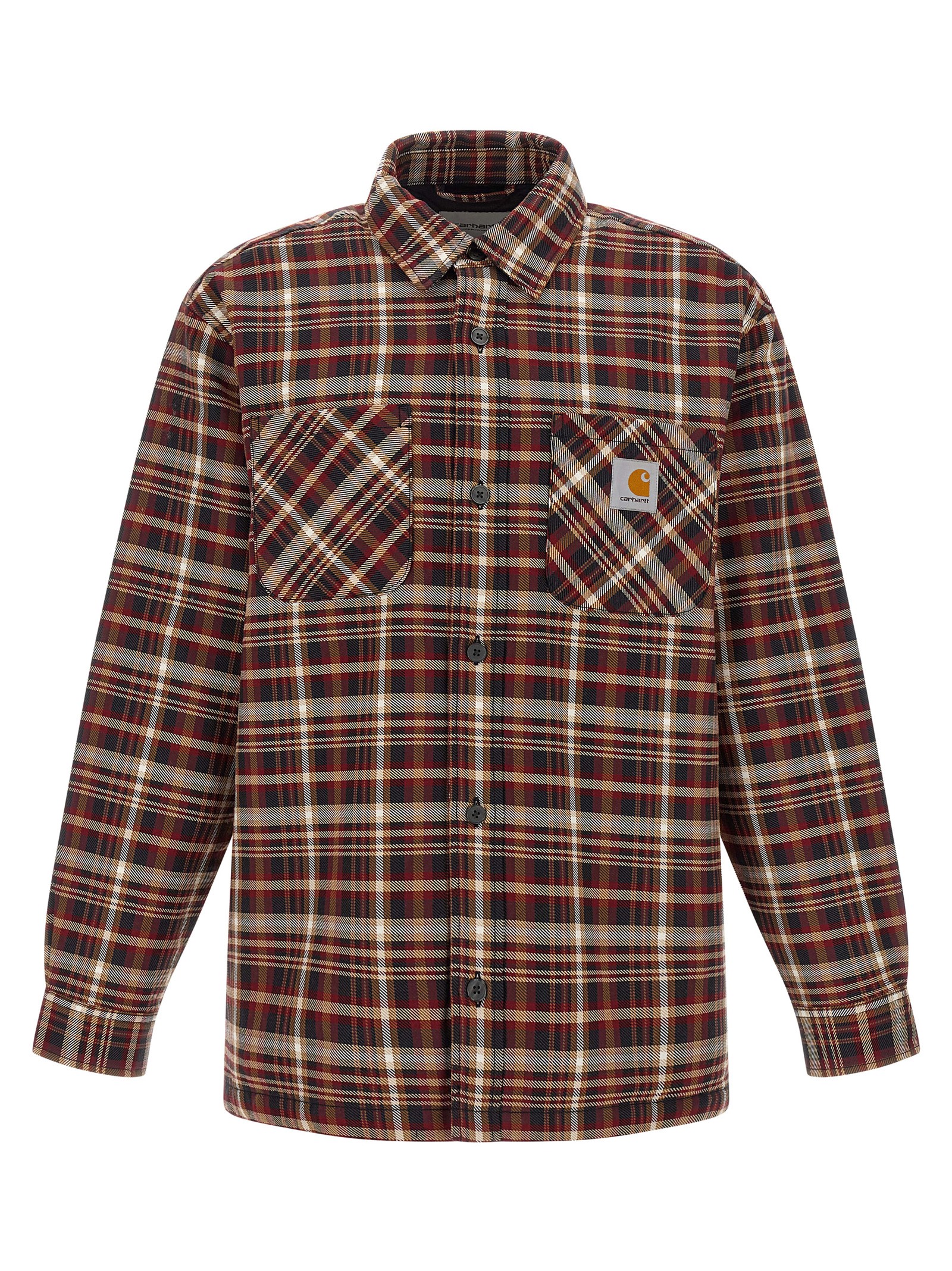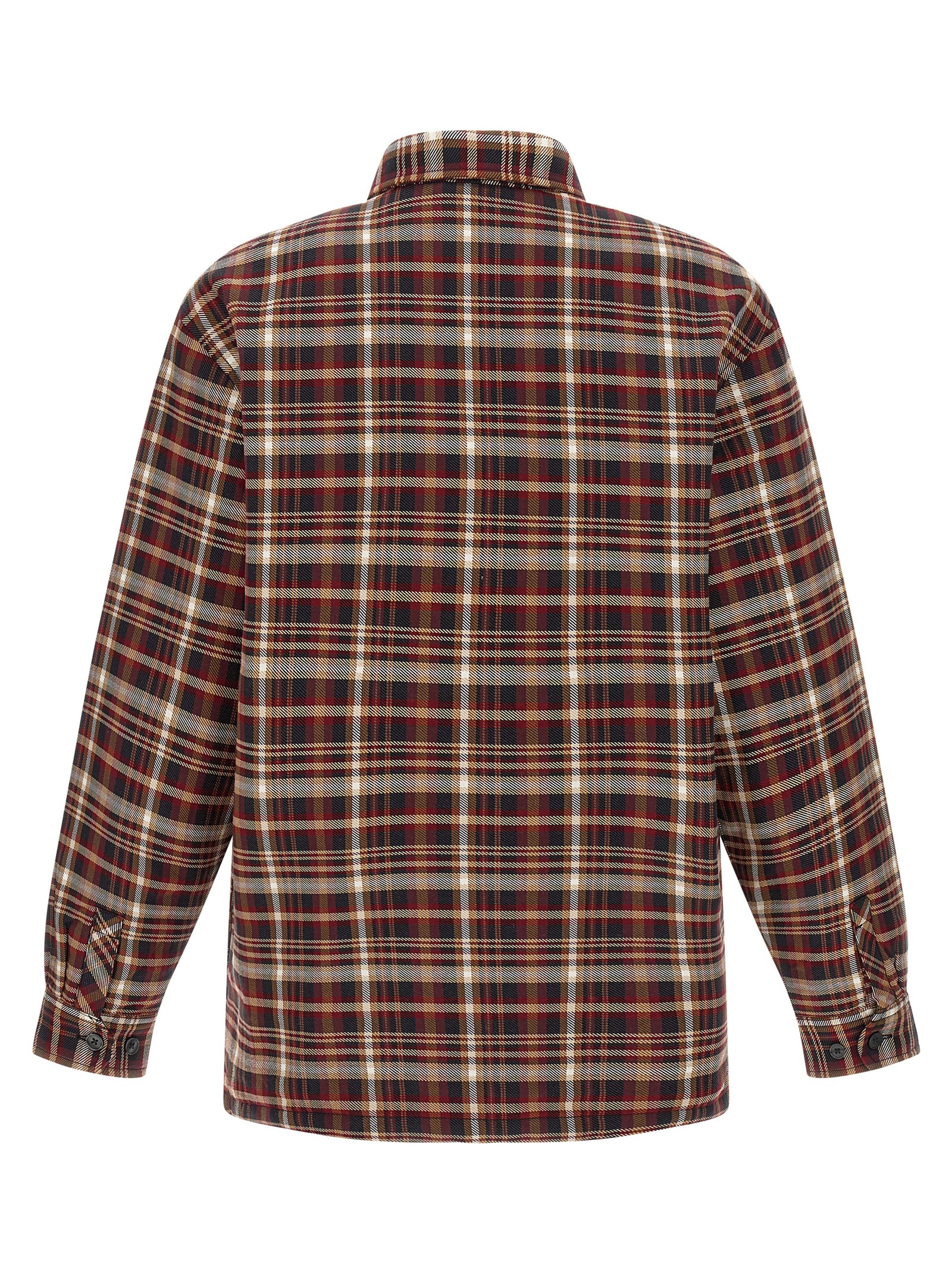 ‘Cronyn’ overshirt in medium-weight polyester-cotton twill dyed in patterned check thread, nylon matelassé lining, button closure and front logo patch, pockets, long sleeves with cuffs and dropped shoulder.