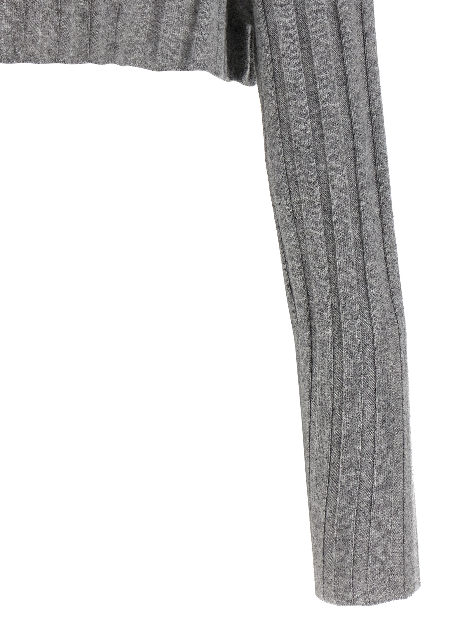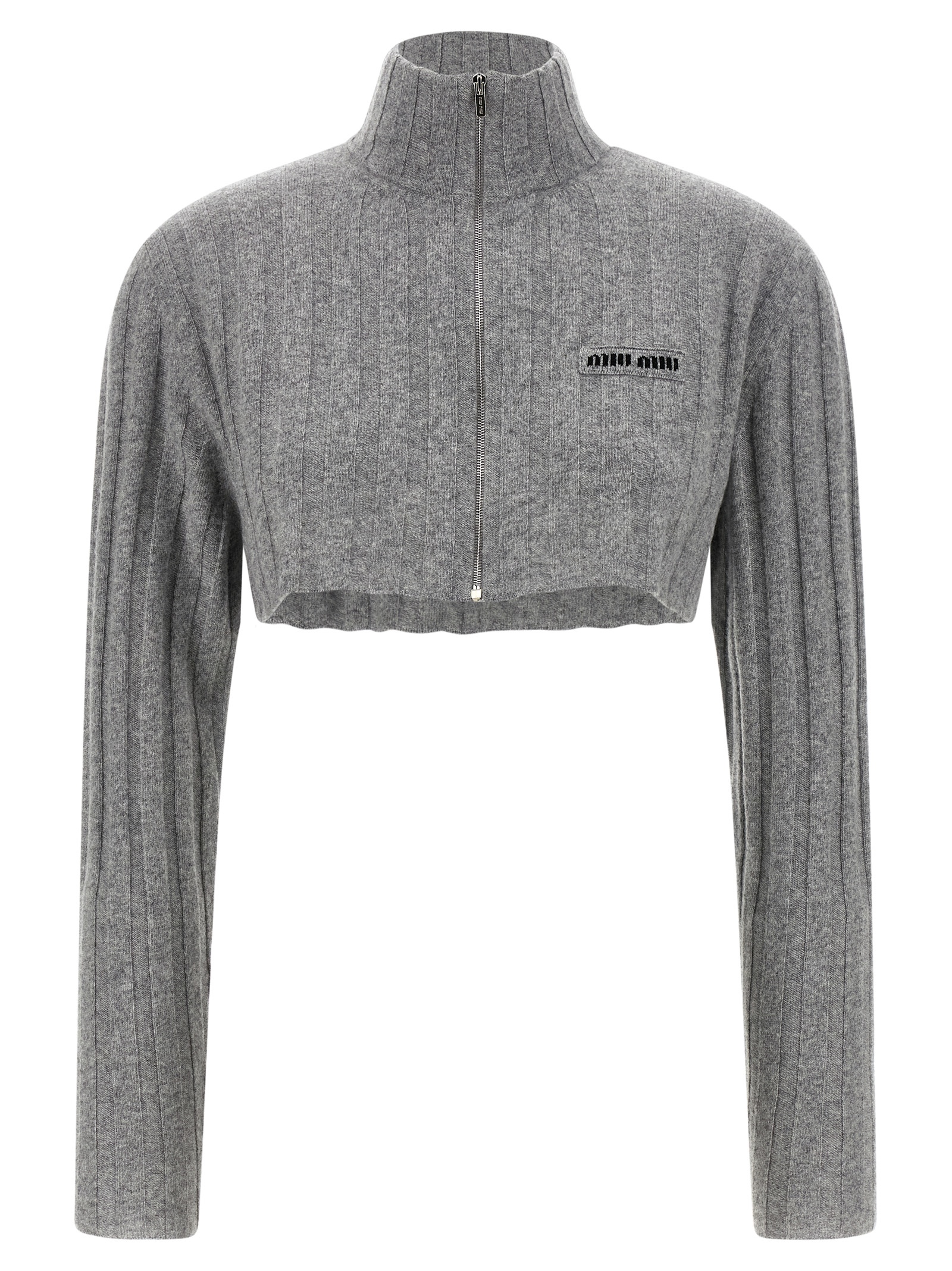 Ribbed wool knit cropped cardigan, front logo patch, high neck, front metal zip closure, long sleeves.