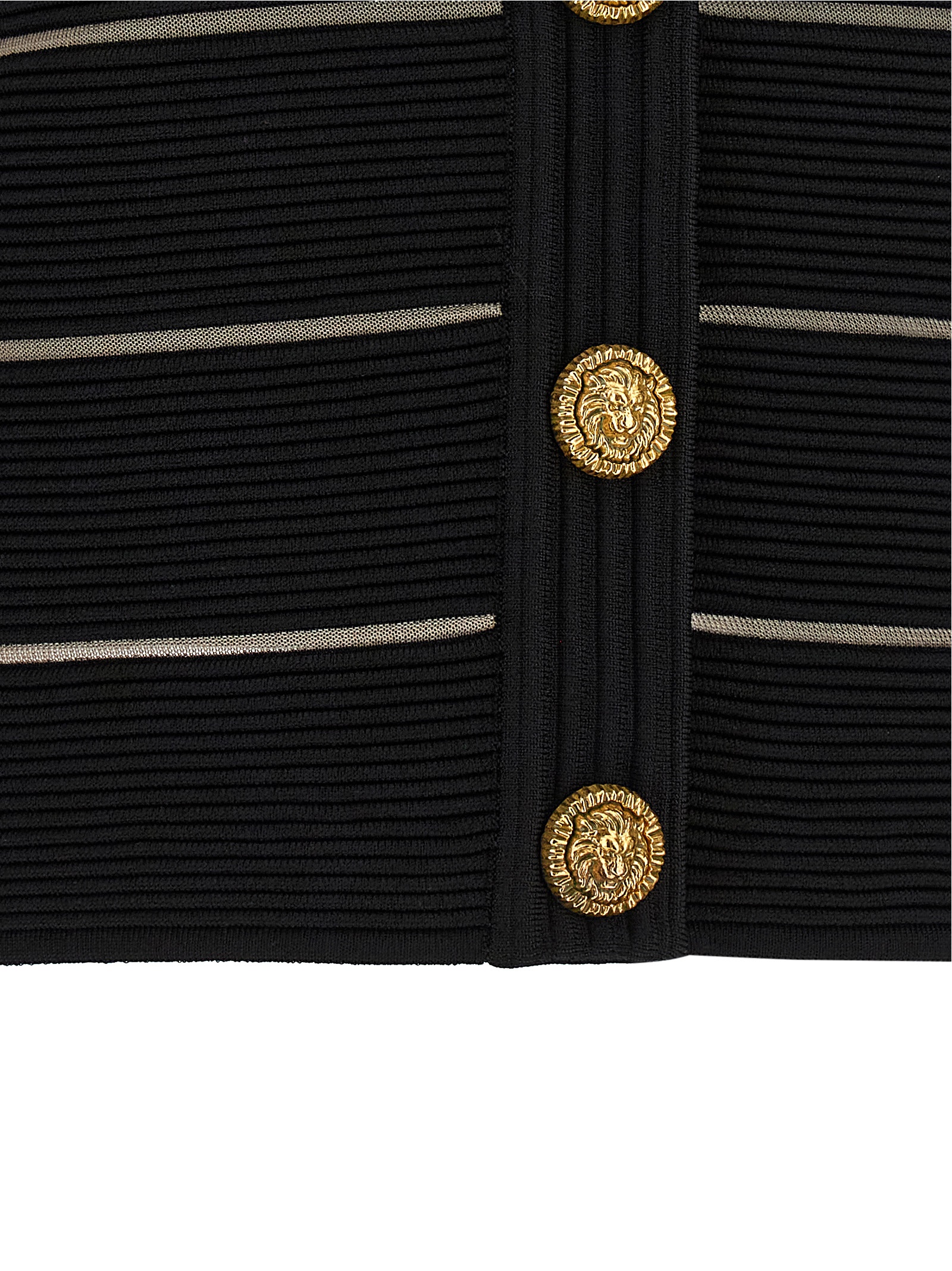 Stretch viscose cardigan with transparent mesh inserts, crop model, crew neck, front metal ‘Testa di Leone’ button closure, padded shoulder, short sleeves.