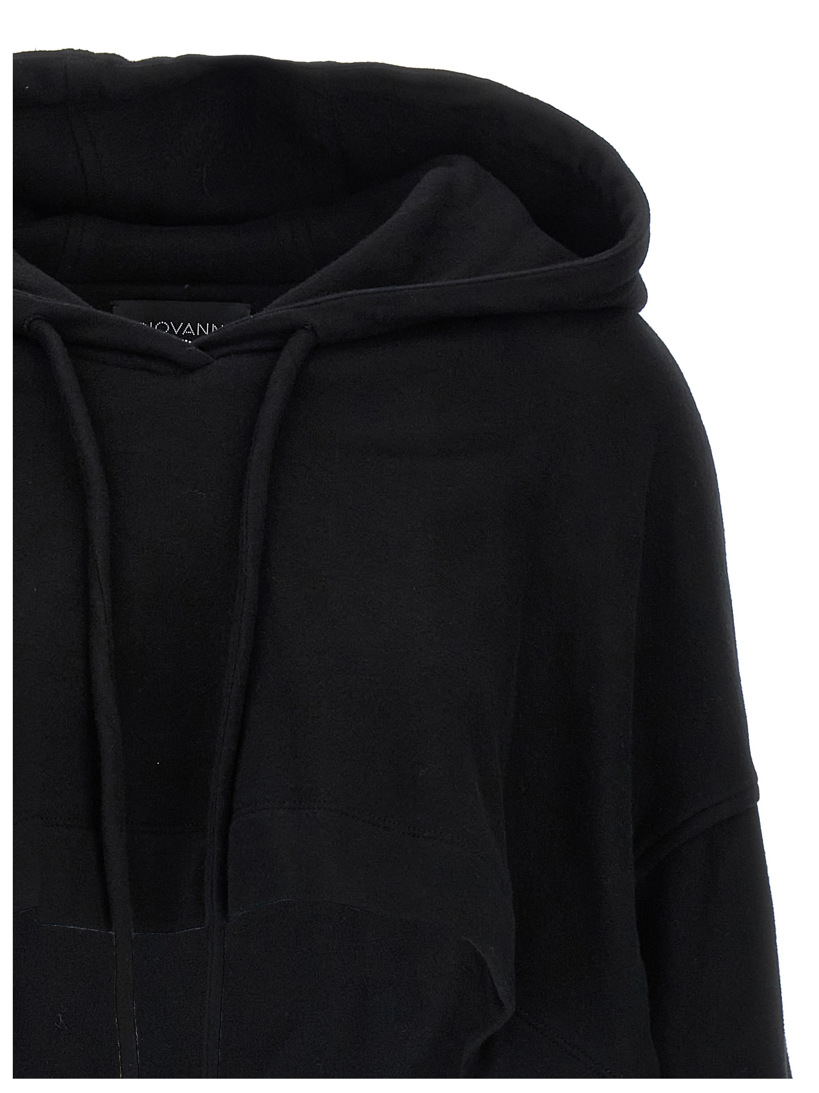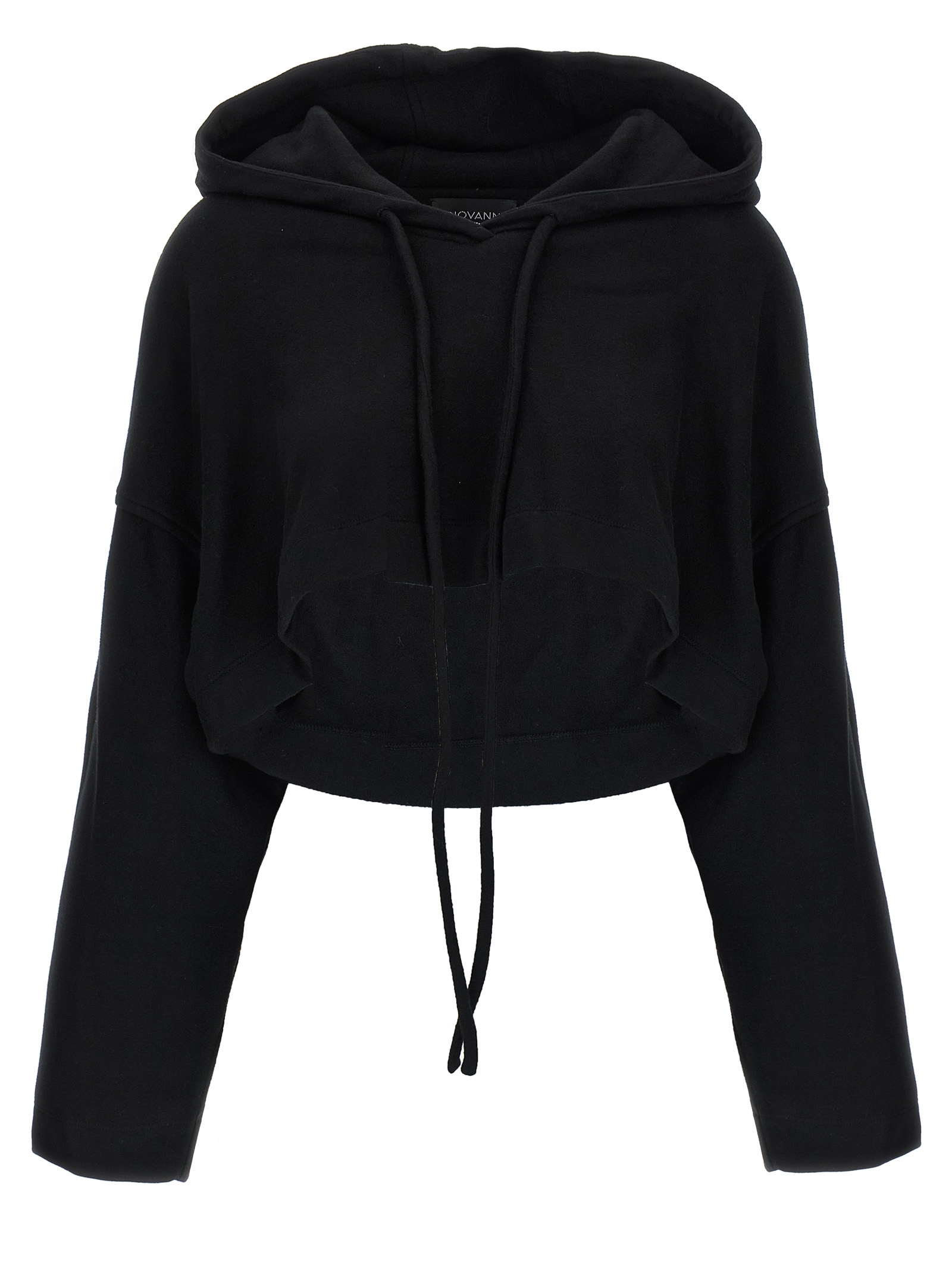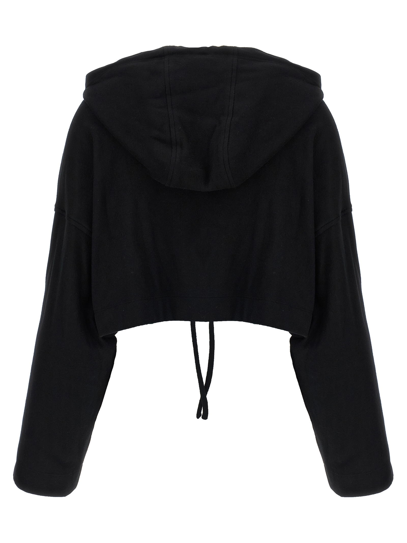 Cotton and cashmere blend hoodie, crop model, long wide sleeves with low shoulders, and asymmetrical hem.