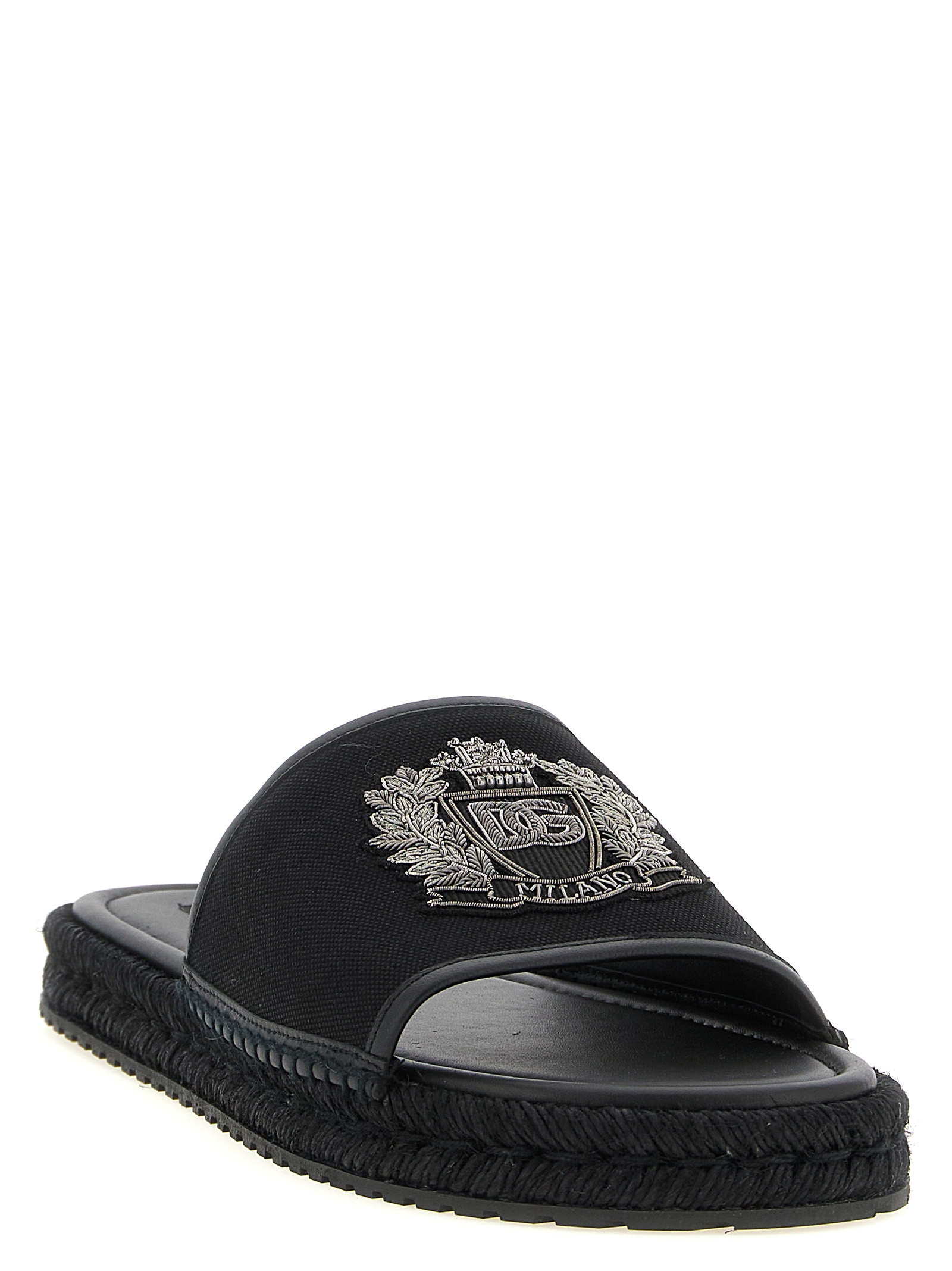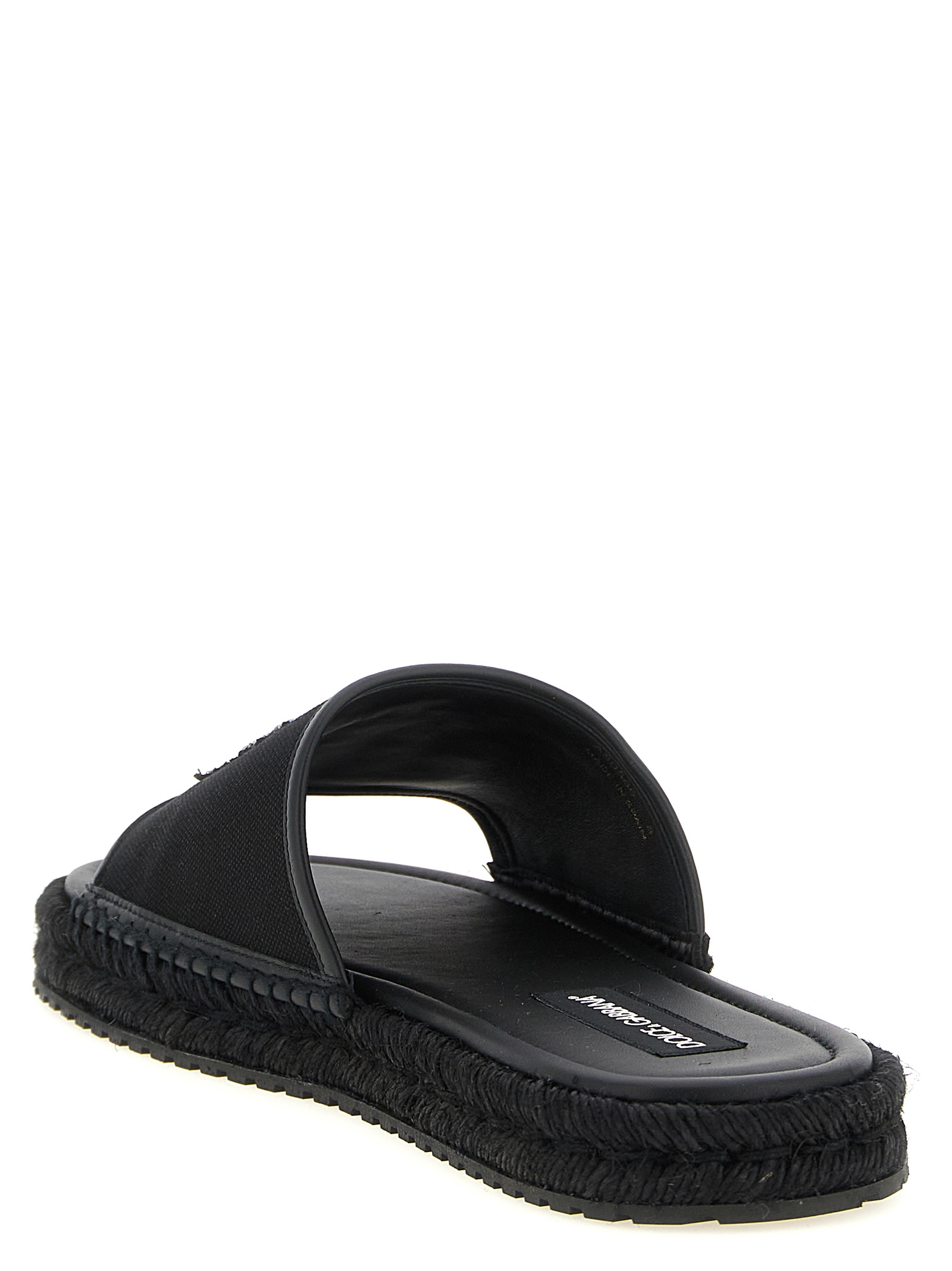 Leather espadrilles with canvas band with top logo patch, woven rope midsole, rubber sole.