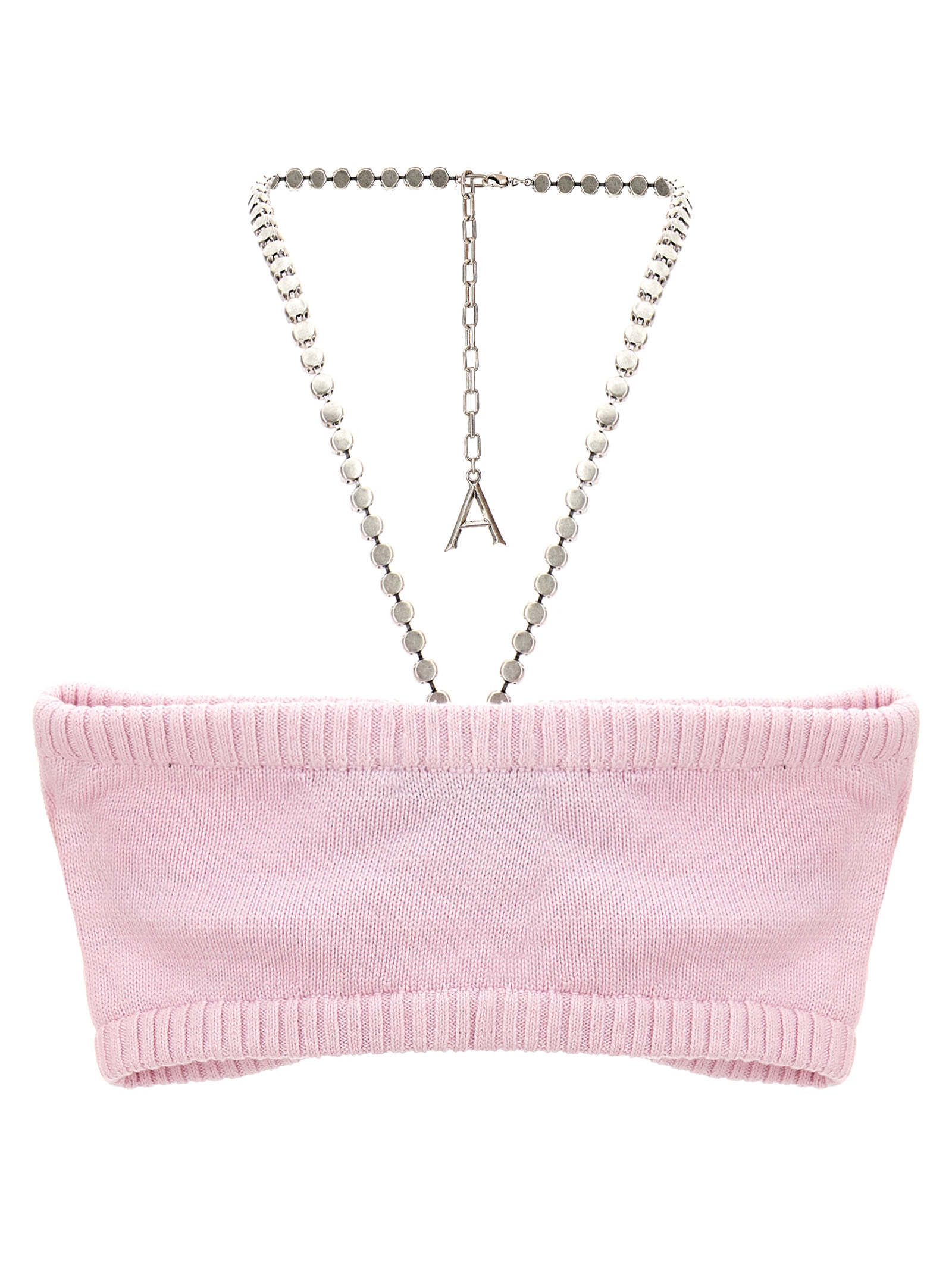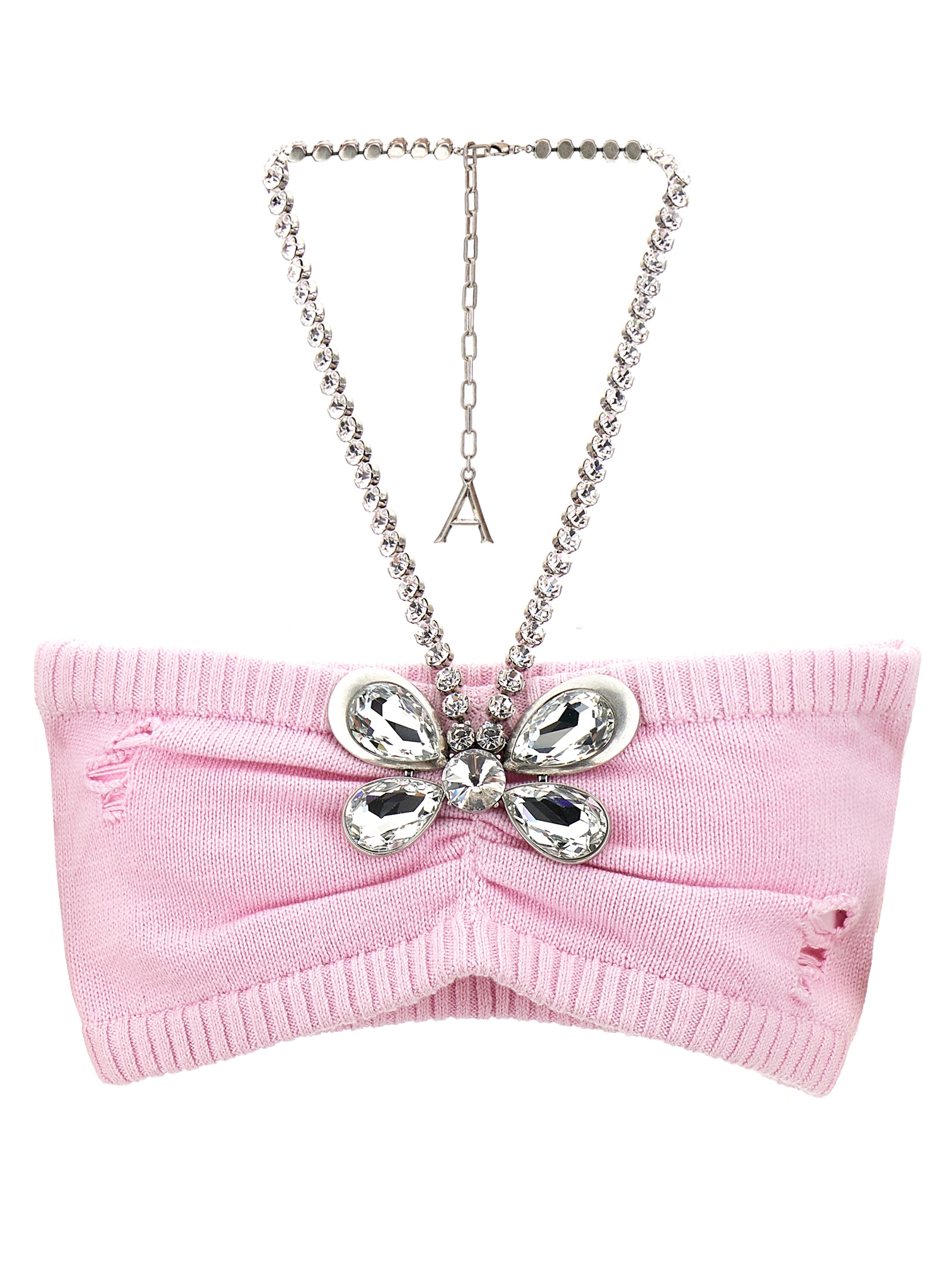 ‘Crystal Butterfly Knit Bandeau’ bandeau top in cotton and cashmere blend knit with used-effect details, brooch application and jewel necklace.