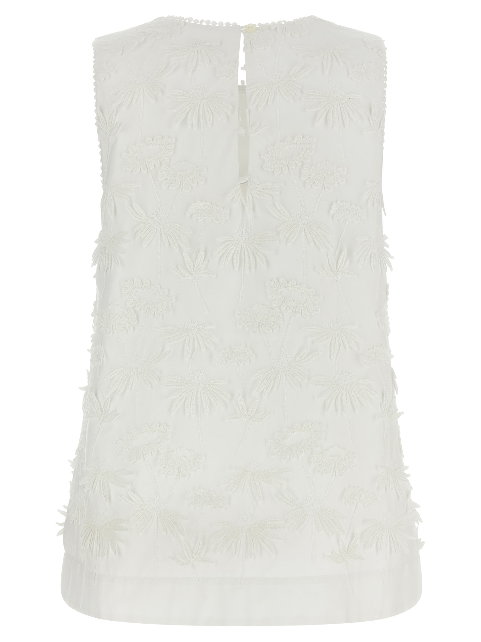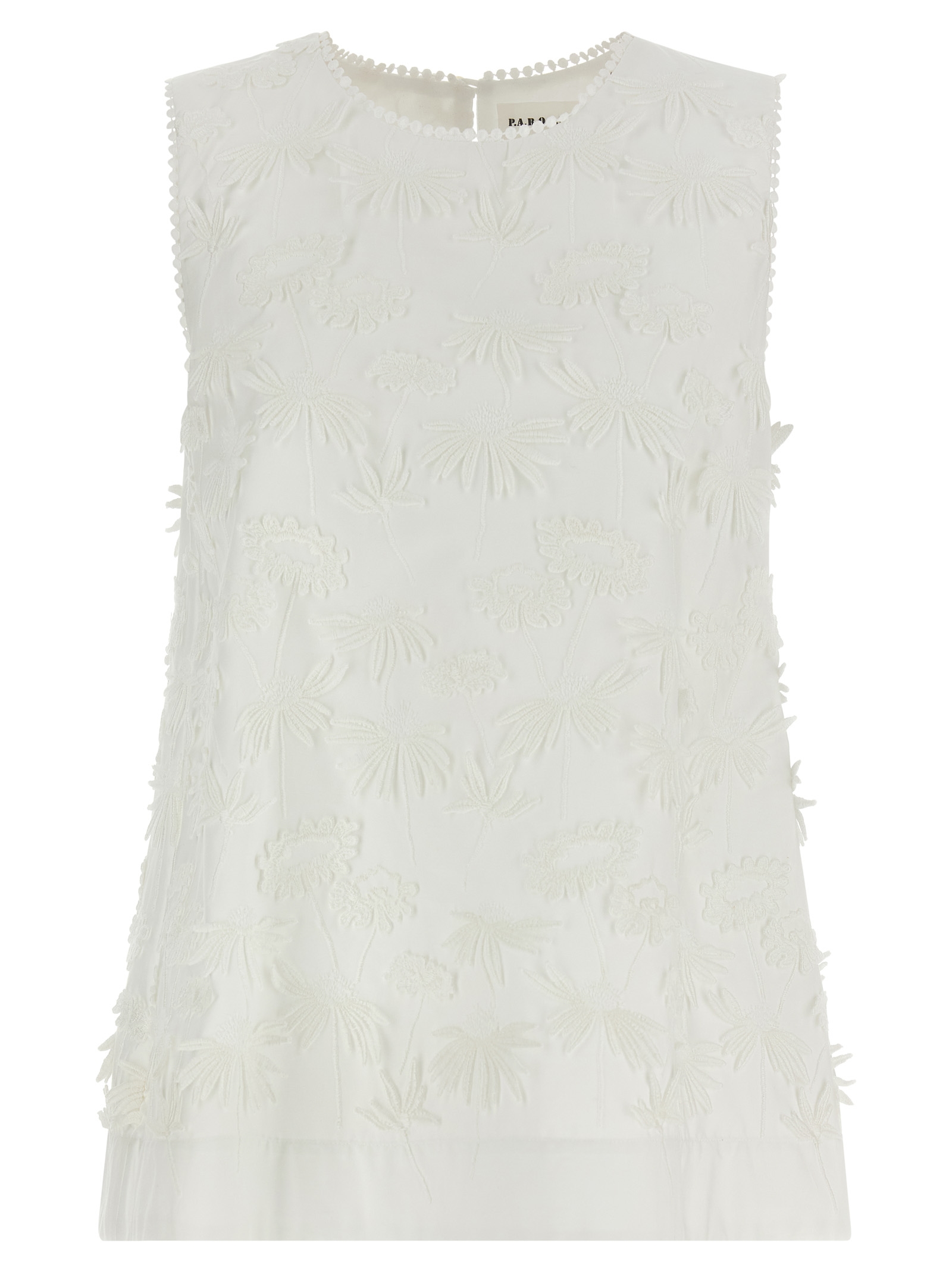‘Cubo26’ blouse in cotton poplin with floral embroidery and tone-on-tone trimmings, round neckline with back button closure and sleeveless back teardrop cut-out detail.