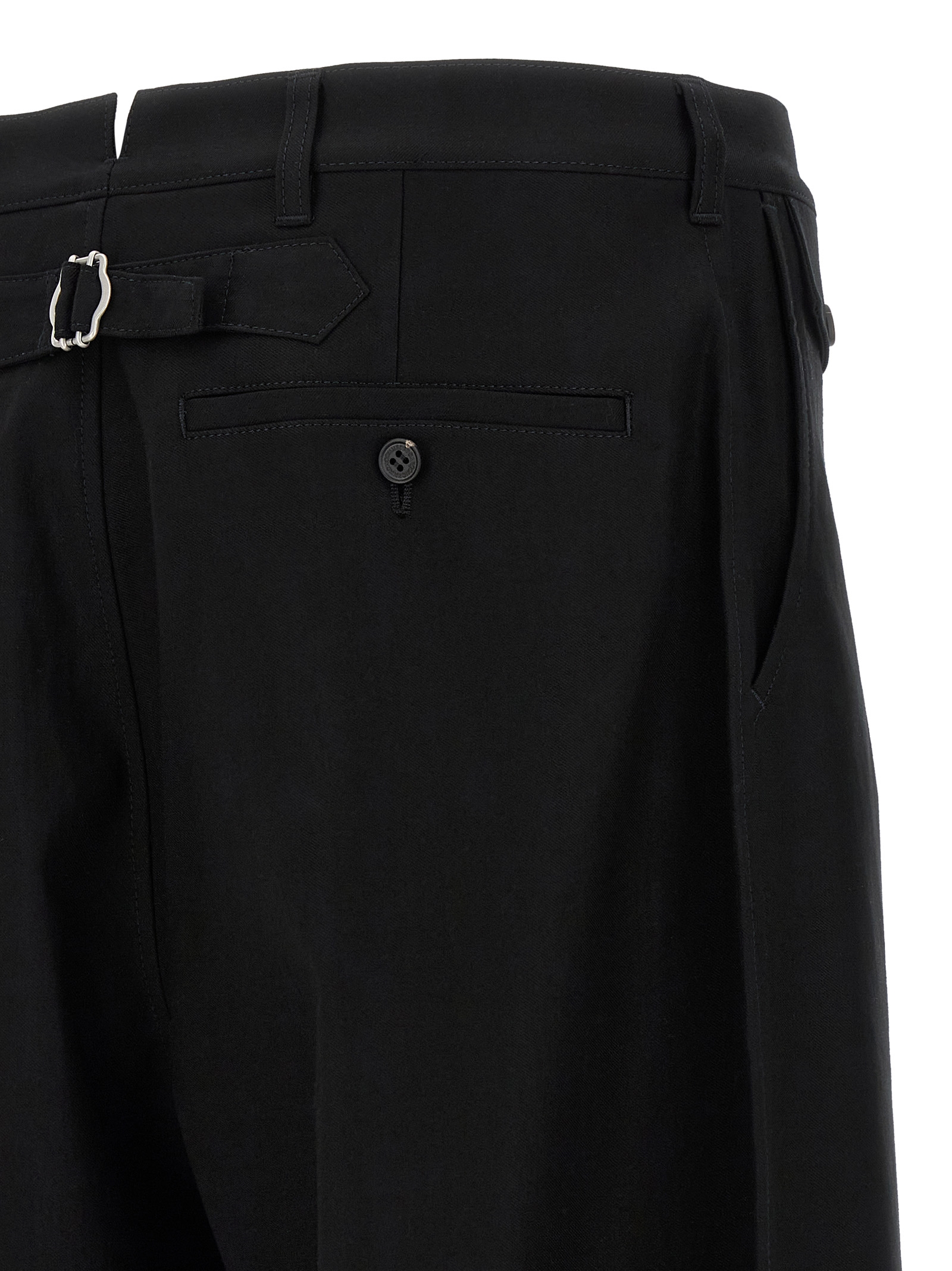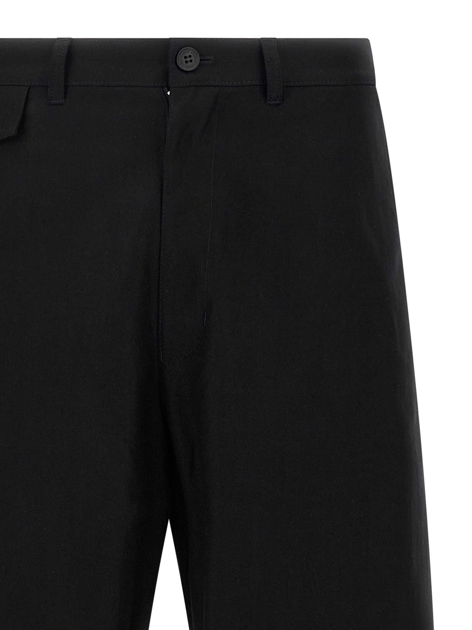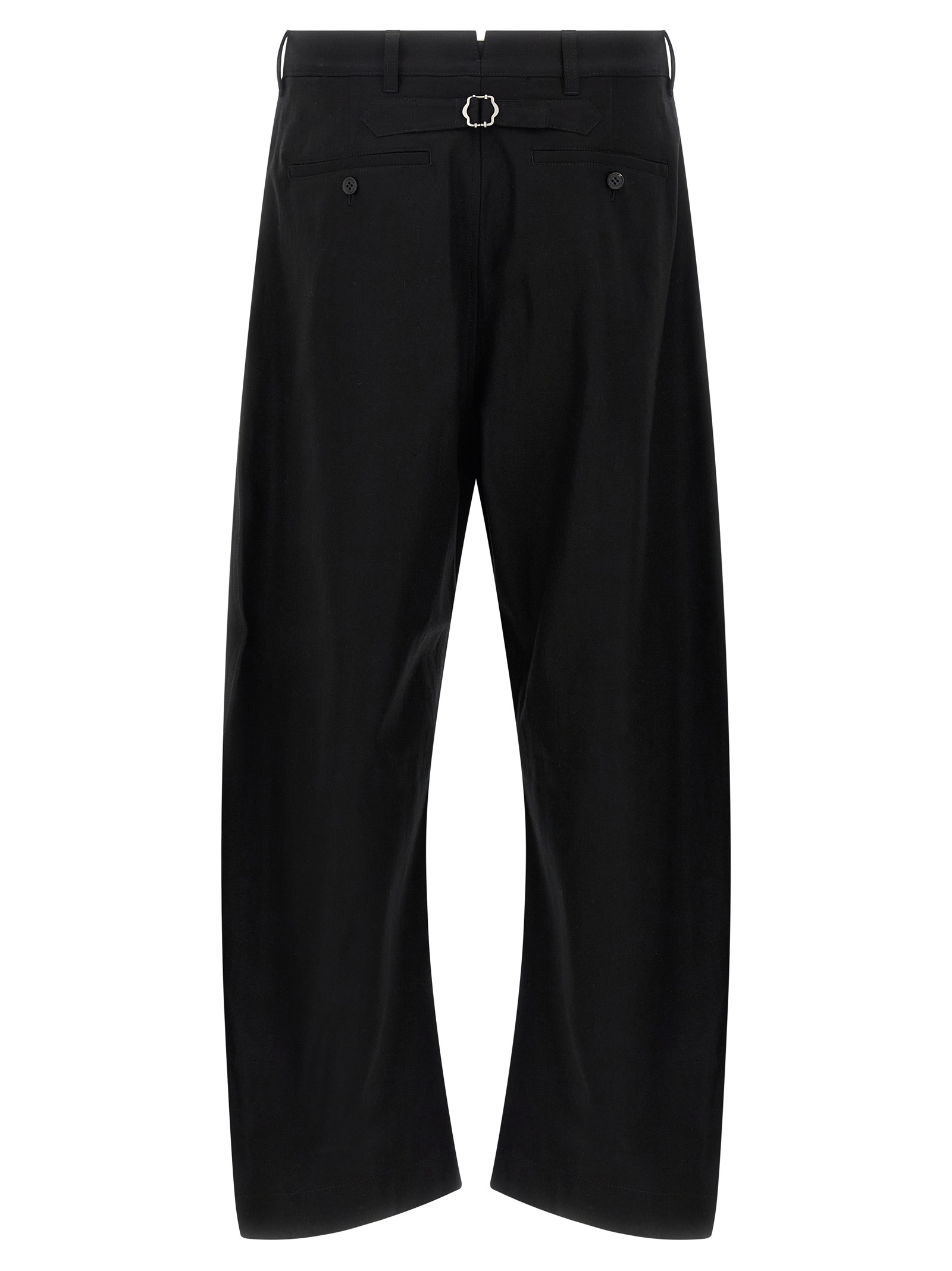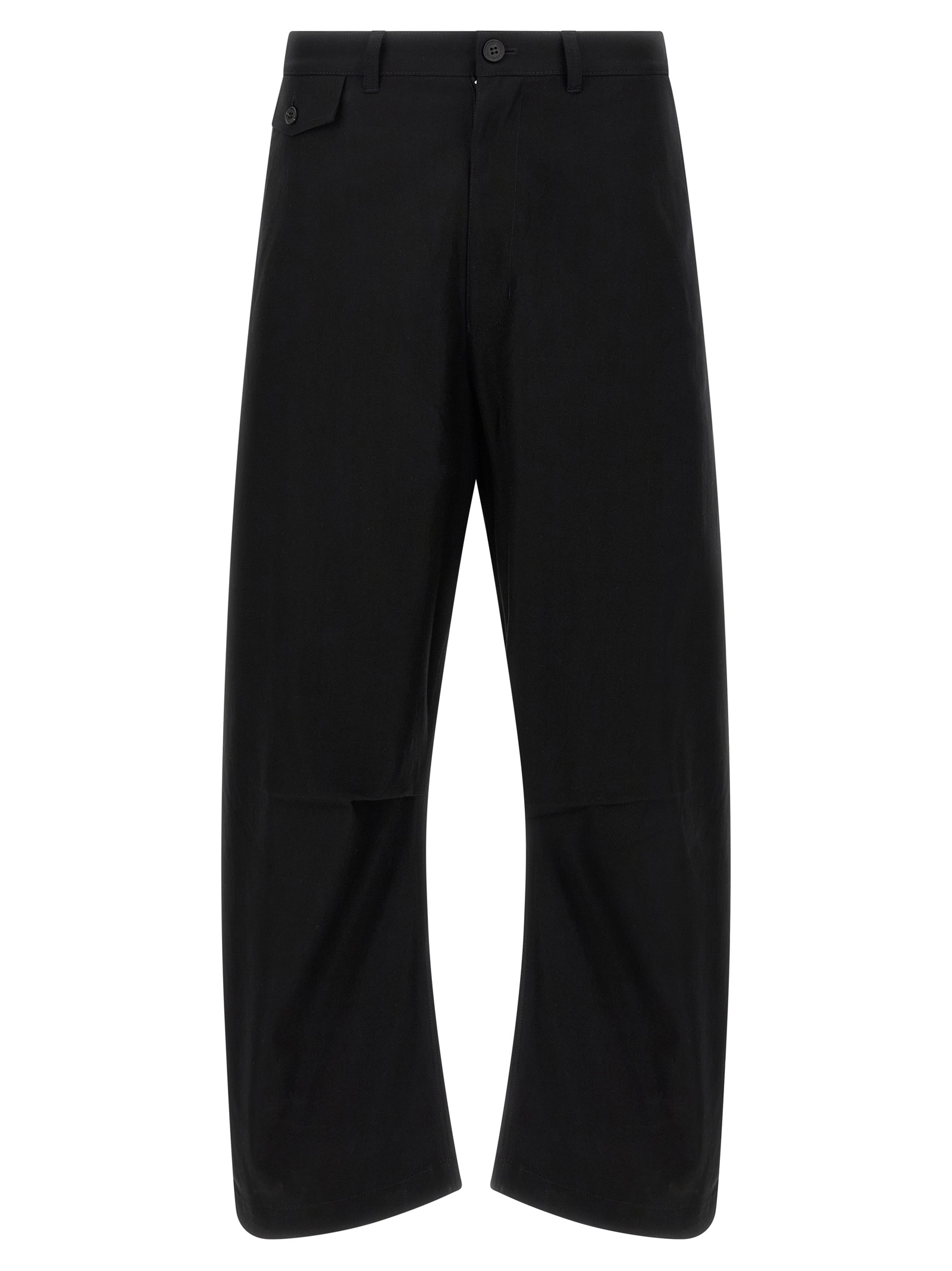Light cotton trousers, curved leg with knee pincer, low crotch, front zip and button closure, adjustable back strap, pockets.