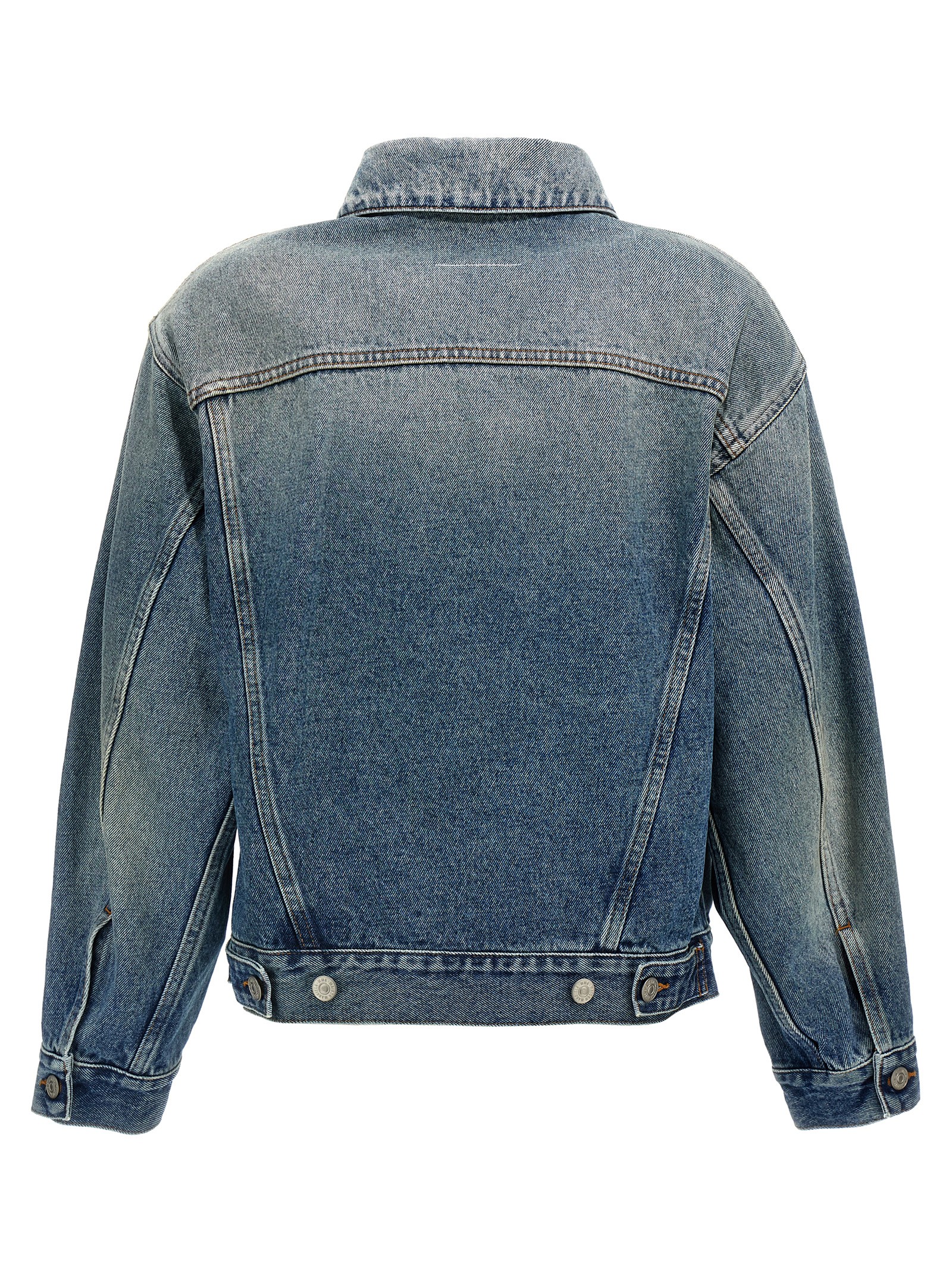 Cotton denim jacket with cut-out details around the sleeve, button closure, pockets, long cuffed sleeves, ‘White stitch line’ at the back.