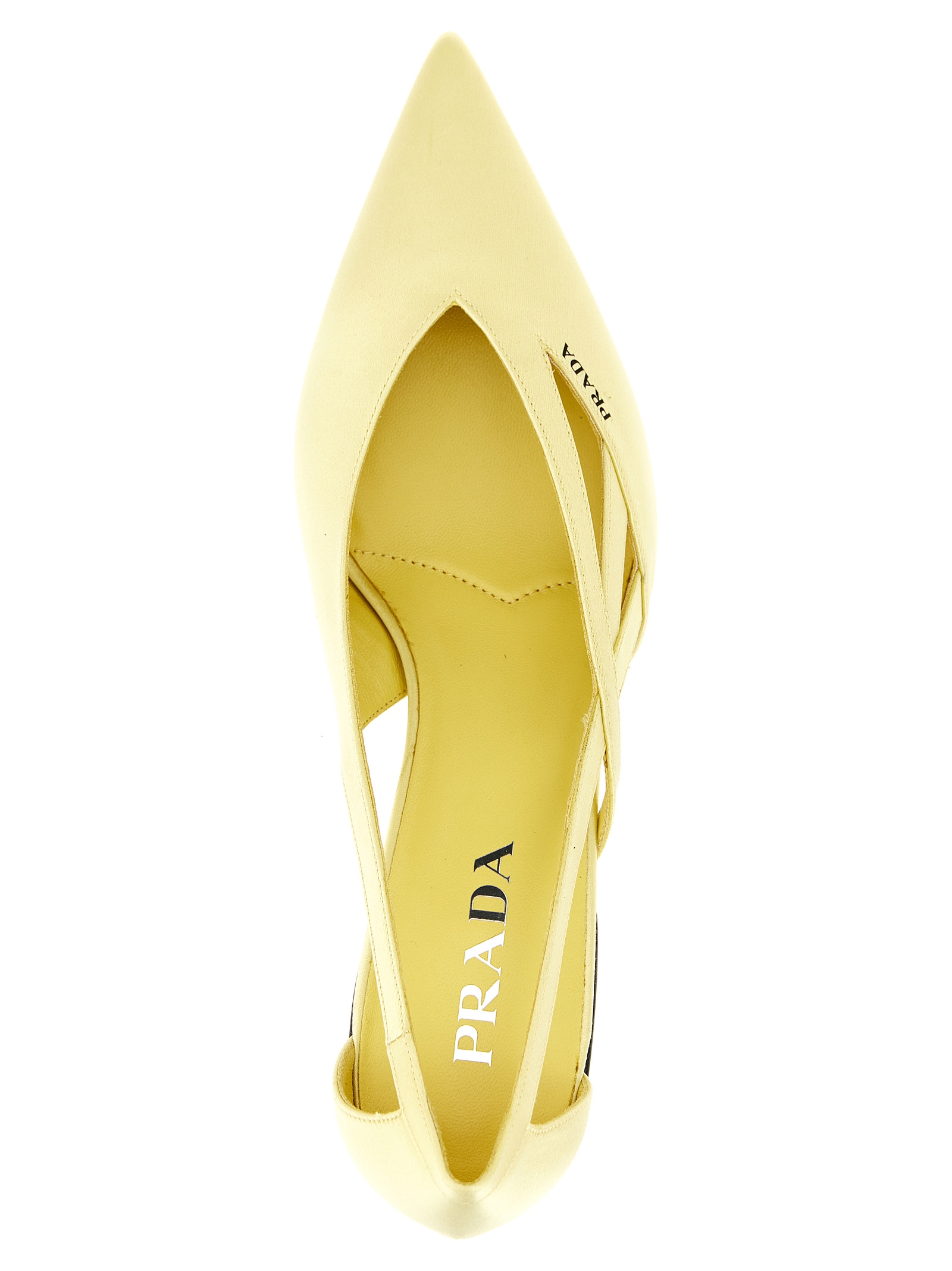 Satin pumps with cut-out details, silk-screened logo, wide heels.