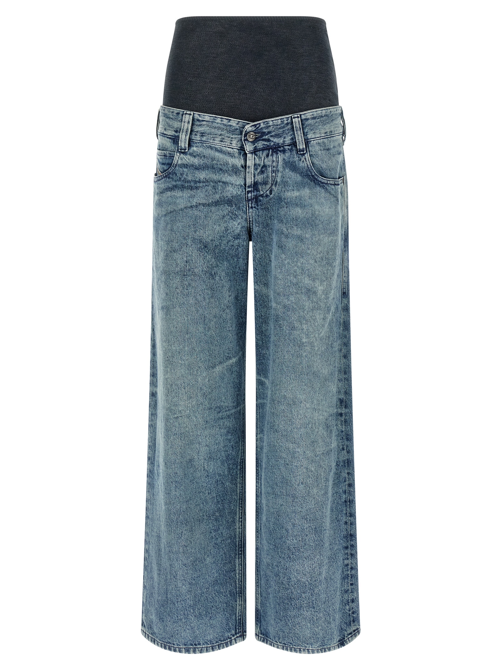 ‘D-Eni-F-Fsh1’ stonewashed cotton and hemp denim jeans with whisker and high baschina that wraps around the waist in technical material fabric, low crotch, wide and straight leg, front button closure, five pockets, back leather logo tag.