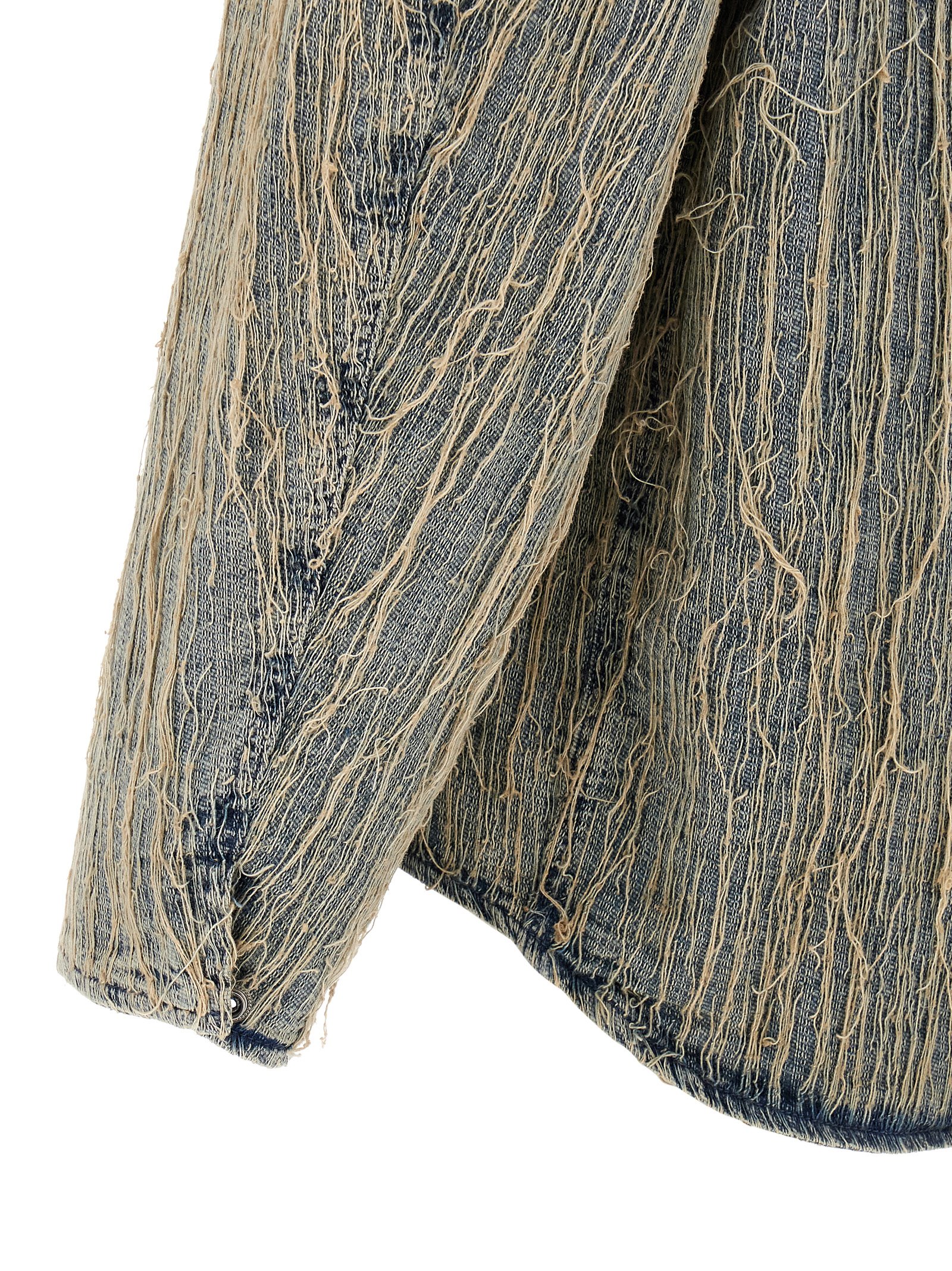 ‘D-Ivar-S’ jacquard stone wash cotton denim jacket with floating threads, fuzzy shearling shirt collar, front zip closure, pockets, long sleeves with dropped shoulders, nylon lining.