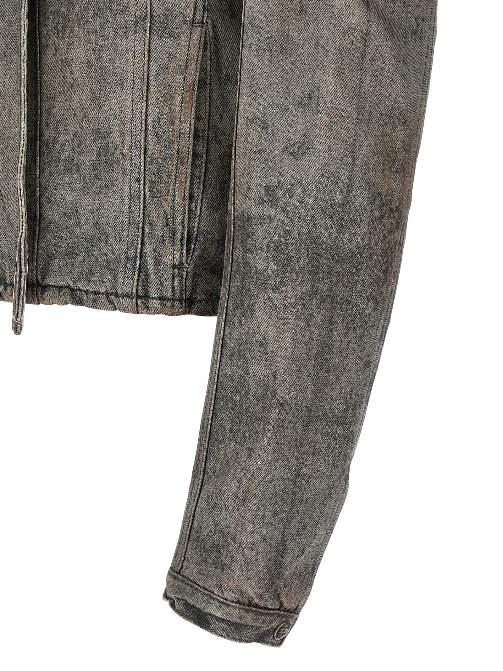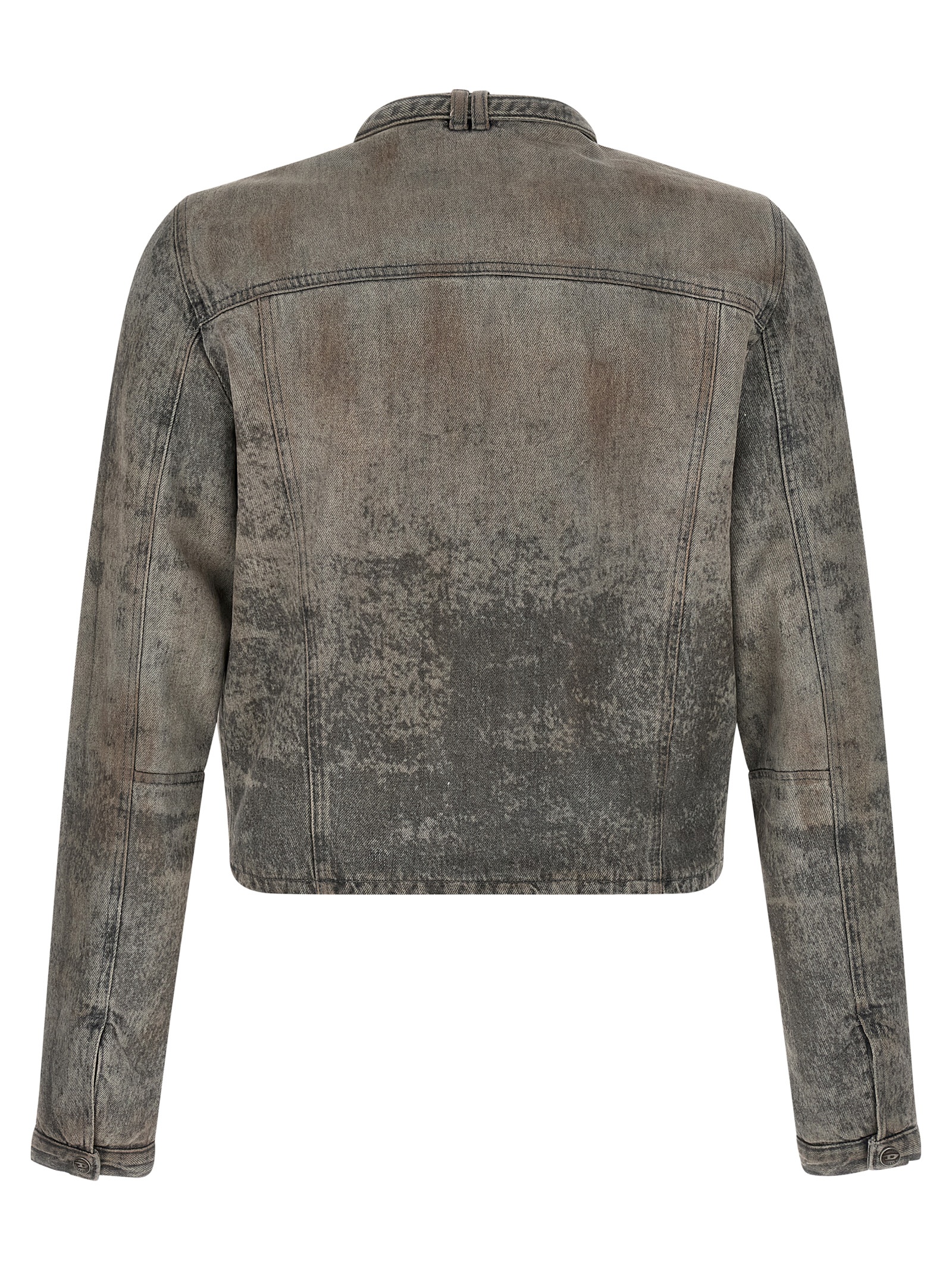 D-Vulmar-Fsi’ cotton and hemp satin denim jacket with laser-treated metal threads sprayed with a sulfur-based pigment coating, round collar that turns into a long webbing that wraps around the neck, closed with logo button and final detail with metal D, front zip closure, pockets, long cuffed sleeves, Lining.