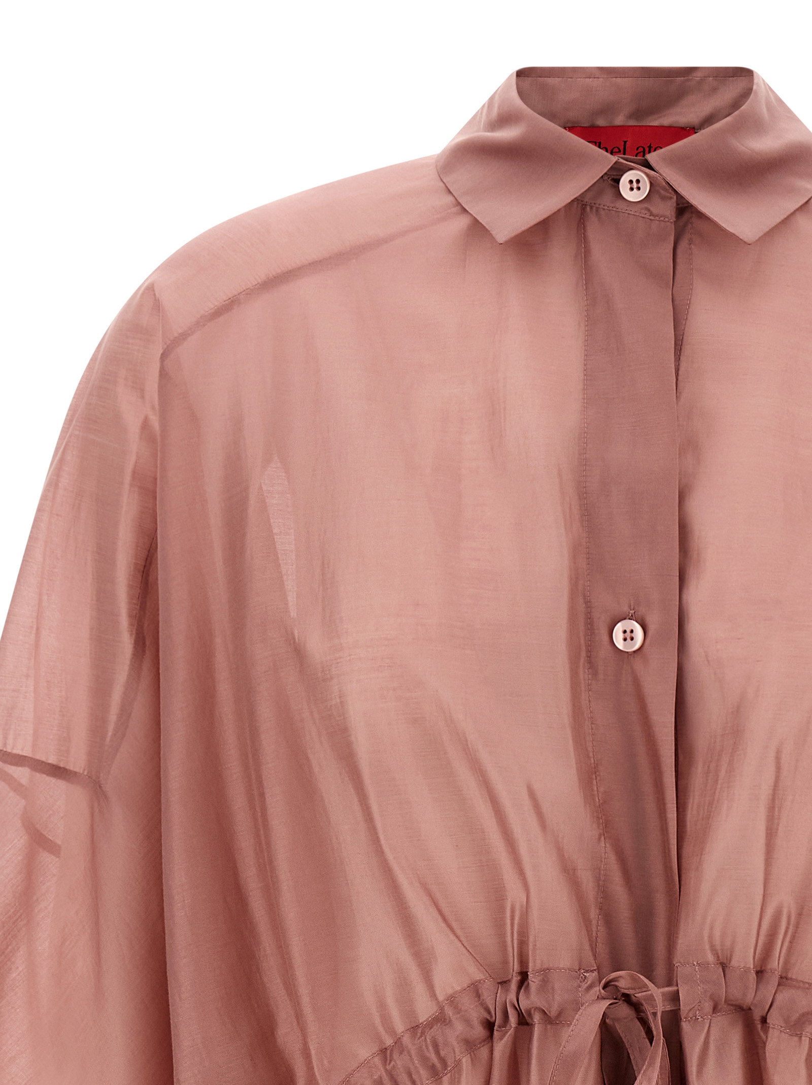 ‘Dalida’ light muslin shirt with front mother-of-pearl button closure, drawstring at the waist, long wide sleeves with cuffs and dropped shoulders, asymmetrical hem.