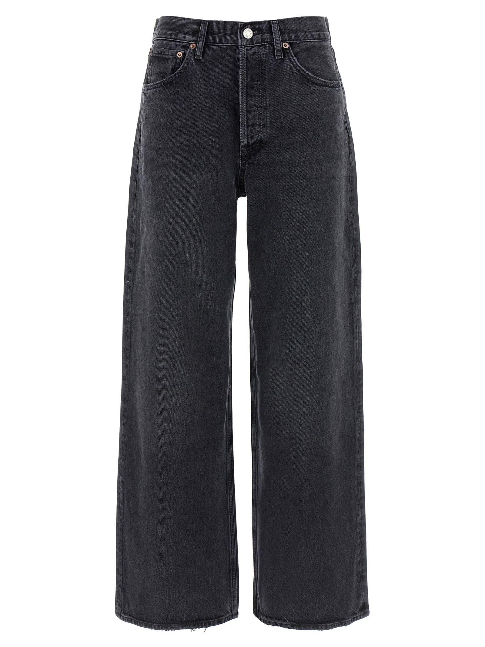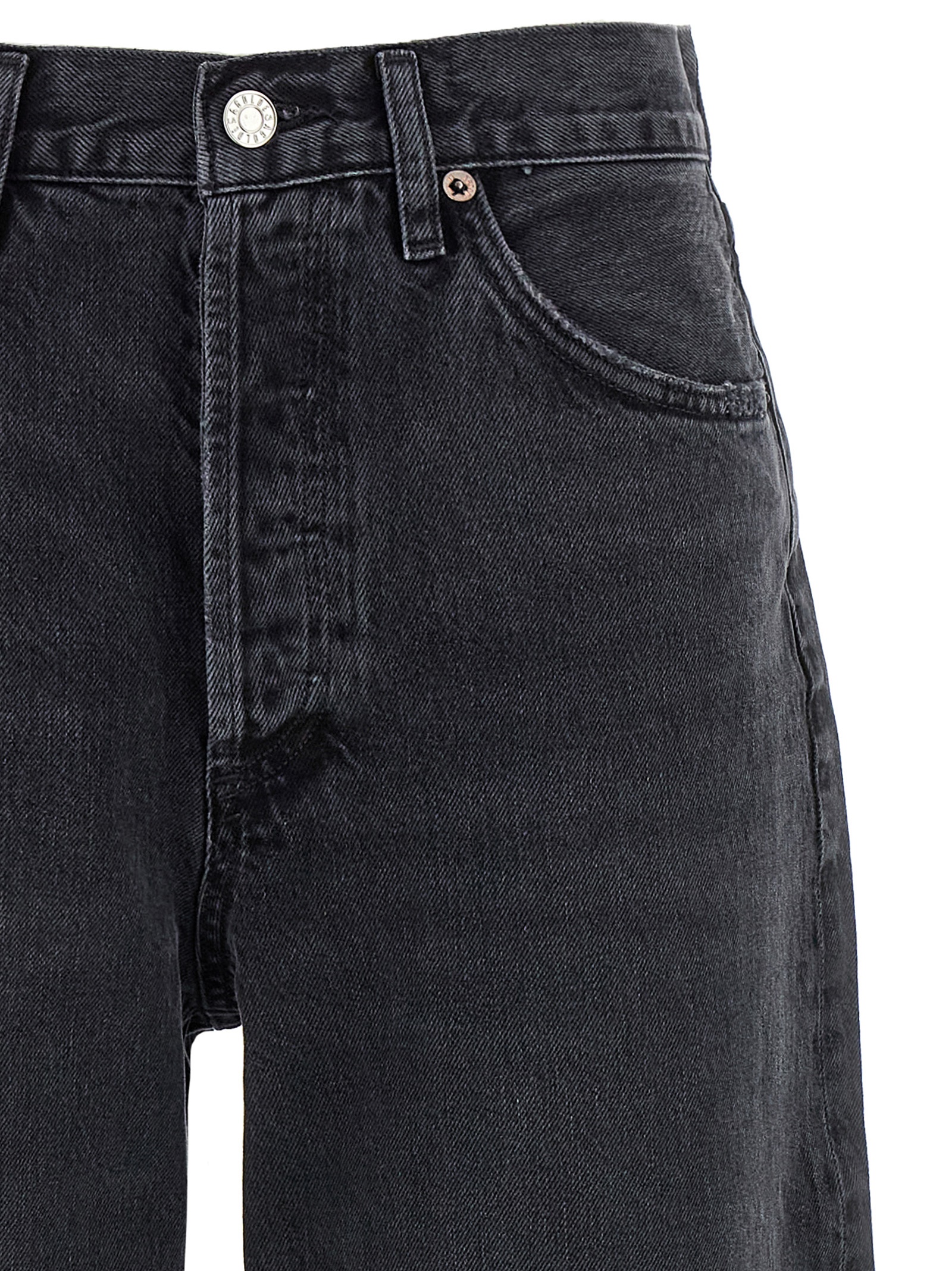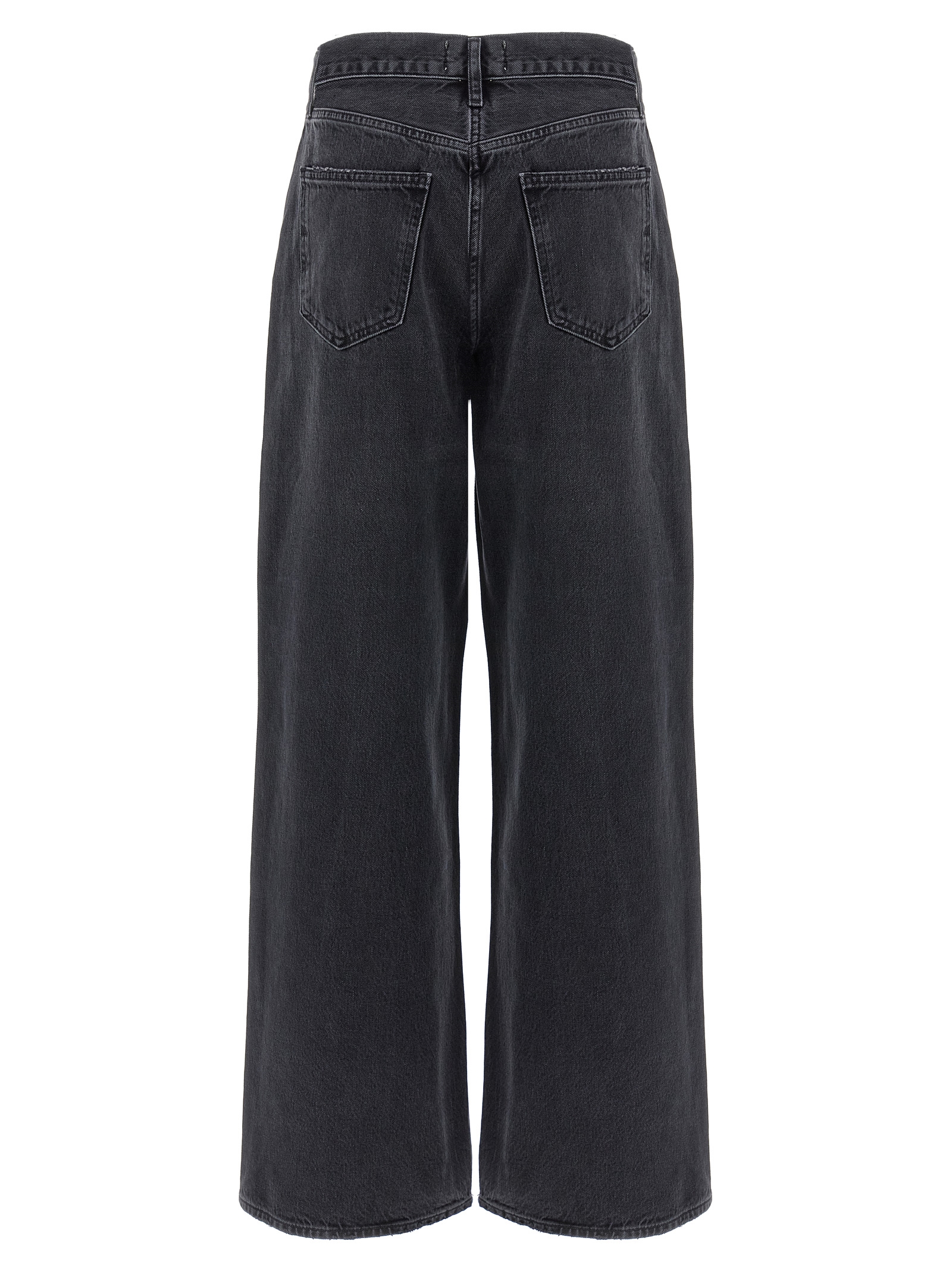 ‘Dame’ jeans in used-effect delavé cotton denim with high waist and wide leg, front button closure, five pockets.