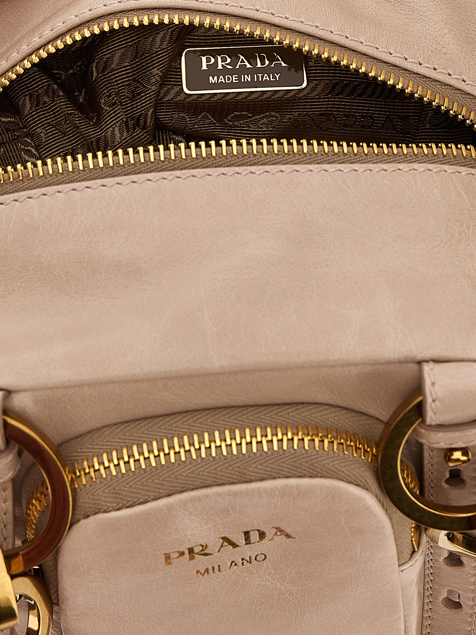 ‘Dangle’ mini leather top case, cubic shape, vintage-effect leather, antique metal trim, front zip pocket, handles, zip closure.