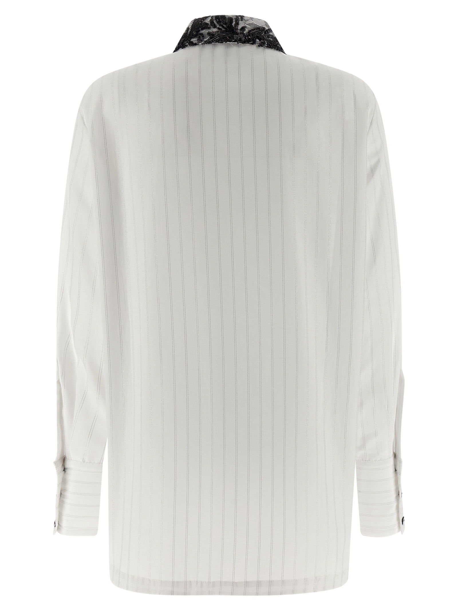 ‘Daniel’ shirt in striped cotton poplin with lace collar and sequin embroidery, front button closure, long sleeves with cuffs and contrast buttons.