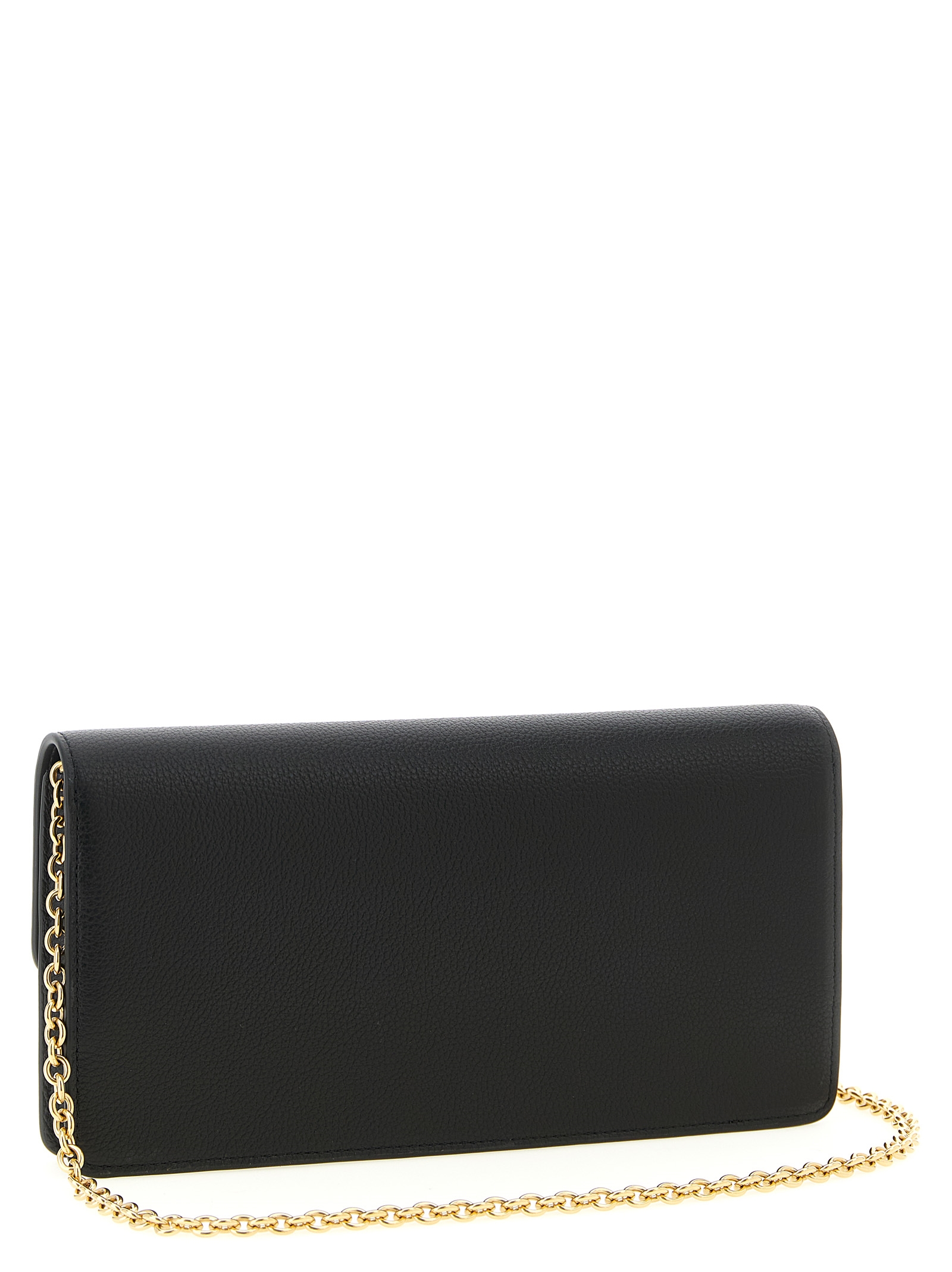 ‘Darley Small’ hammered leather wallet, metal turn lock closure, removable gold chain shoulder strap, inner zip.